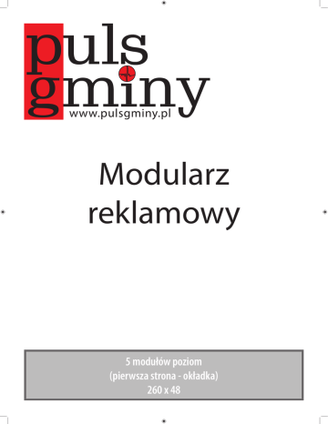 Modularz reklamowy 5 modułów poziom (pierwsza strona - okładka) 260 x 48 Puls Gminy • Wrzesień 2012 Bezpłatny miesięcznik mieszkańców Gminy Dopiewo 10 modułów poziom 260 x 101 5 modułów poziom 260 x 48 2 moduły pion 48 x 101 Strona 2 2 moduły poziom 101 x 48 1 moduł 48 x 48 3 moduły pion 48 x 153 3 moduły poziom 153 x 48 www.pulsgminy.pl Kontakt telefoniczny z redakcją 535-537-722 Puls Gminy • Wrzesień 2012 1/3 strony poziom 260 x 123 [email protected] Strona 3 Puls Gminy • Wrzesień 2012 Bezpłatny miesięcznik mieszkańców Gminy Dopiewo 1/2 strony poziom 260 x 178 Strona 4 www.pulsgminy.pl Cała strona 260 x 360