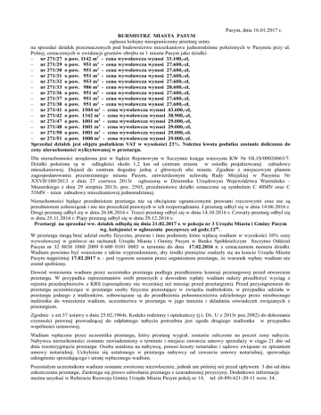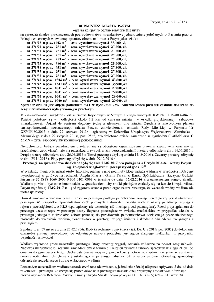 Pasym, dnia 16.01.2017 r. BURMISTRZ MIASTA PASYM ogłasza kolejny nieograniczony przetarg ustny na sprzedaż działek przeznaczonych pod budownictwo mieszkaniowe jednorodzinne położonych w Pasymiu przy ul. Polnej, oznaczonych w ewidencji gruntów obrębu nr 1 miasta Pasym jako działki: nr 271/27 o pow. 1142 m2 - cena wywoławcza wynosi 33.100,-zł, nr 271/29 o pow. 951 m2 - cena wywoławcza wynosi 27.600,-zł, nr 271/30 o pow. 951 m2 - cena wywoławcza wynosi 27.600,-zł, nr 271/31 o pow. 951 m2 - cena wywoławcza wynosi 27.600,-zł, nr 271/32 o pow. 953 m2 - cena wywoławcza wynosi 27.600,-zł, nr 271/33 o pow. 986 m2 - cena wywoławcza wynosi 28.600,-zł, nr 271/36 o pow. 951 m2 - cena wywoławcza wynosi 27.600,-zł, nr 271/37 o pow. 951 m2 - cena wywoławcza wynosi 27.600,-zł, nr 271/38 o pow. 951 m2 - cena wywoławcza wynosi 27.600,-zł, nr 271/41 o pow. 1504 m2 - cena wywoławcza wynosi 43.600,-zł, nr 271/42 o pow. 1342 m2 - cena wywoławcza wynosi 38.900,-zł, nr 271/47 o pow. 1001 m2 - cena wywoławcza wynosi 29.000,-zł, nr 271/48 o pow. 1001 m2 - cena wywoławcza wynosi 29.000,-zł, nr 271/50 o pow. 1001 m2 - cena wywoławcza wynosi 29.000,-zł. nr 271/51 o pow. 1000 m2 - cena wywoławcza wynosi 29.000,-zł. Sprzedaż działek jest objęta podatkiem VAT w wysokości 23%. Należna kwota podatku zostanie doliczona do ceny nieruchomości wylicytowanej w przetargu. Dla nieruchomości urządzona jest w Sądzie Rejonowym w Szczytnie księga wieczysta KW Nr OL1S/00024863/7. Działki położone są w odległości około 1,2 km od centrum miasta w osiedlu projektowanej zabudowy mieszkaniowej. Dojazd do centrum dogodny jedną z głównych ulic miasta. Zgodnie z miejscowym planem zagospodarowania przestrzennego miasta Pasym, zatwierdzonym uchwałą Rady Miejskiej w Pasymiu Nr XXVII/180/2013 z dnia 27 czerwca 2013r ogłoszoną w Dzienniku Urzędowym Województwa Warmińsko Mazurskiego z dnia 29 sierpnia 2013r, poz. 2565, przedmiotowe działki oznaczone są symbolem C 40MN oraz C 53MN – teren zabudowy mieszkaniowej jednorodzinnej. Nieruchomości będące przedmiotem przetargu nie są obciążone ograniczonymi prawami rzeczowymi oraz nie są przedmiotem zobowiązań i nie ma przeszkód prawnych w ich rozporządzaniu. I przetarg odbył się w dniu 14.06.2016 r. Drugi przetarg odbył się w dniu 26.08.2016 r. Trzeci przetarg odbył się w dniu 14.10.2016 r. Czwarty przetarg odbył się w dniu 25.11.2016 r. Piąty przetarg odbył się w dniu 29.12.2016 r. Przetargi na sprzedaż ww. działek odbędą się dnia 21.02.2017 r. w pokoju nr 3 Urzędu Miasta i Gminy Pasym wg. kolejności w ogłoszeniu począwszy od godz.1200. W przetargu mogą brać udział osoby fizyczne, prawne i inne podmioty które wpłacą wadium w wysokości 10% ceny wywoławczej w gotówce na rachunek Urzędu Miasta i Gminy Pasym w Banku Spółdzielczym Szczytno Oddział Pasym nr 32 8838 1060 2009 0 600 0101 0003 w terminie do dnia 17.02.2016 r. z oznaczeniem numeru działki. Wadium powinno być wniesione z takim wyprzedzeniem, aby środki pieniężne znalazły się na koncie Urzędu Miasta Pasym najpóźniej 17.02.2017 r. - pod rygorem uznania przez organizatora przetargu, że warunek wpłaty wadium nie został spełniony. Dowód wniesienia wadium przez uczestnika przetargu podlega przedłożeniu komisji przetargowej przed otwarciem przetargu. W przypadku reprezentantów osób prawnych z dowodem wpłaty wadium należy przedłożyć wyciąg z rejestru przedsiębiorców z KRS (sporządzony nie wcześniej niż miesiąc przed przetargiem). Przed przystąpieniem do przetargu uczestniczące w przetargu osoby fizyczne pozostające w związku małżeńskim, w przypadku udziału w przetargu jednego z małżonków, zobowiązane są do przedłożenia pełnomocnictwa udzielonego przez nieobecnego małżonka do wniesienia wadium, uczestnictwa w przetargu w jego imieniu i składania oświadczeń związanych z przetargiem. Zgodnie z art.37 ustawy z dnia 25.02.1964r, Kodeks rodzinny i opiekuńczy (j.t. Dz. U z 2015r poz.2082) do dokonania czynności prawnej prowadzącej do odpłatnego nabycia potrzebna jest zgoda drugiego małżonka w przypadku wspólności ustawowej. Wadium wpłacone przez uczestnika przetargu, który przetarg wygrał, zostanie zaliczone na poczet ceny nabycia. Nabywca nieruchomości zostanie zawiadomiony o terminie i miejscu zawarcia umowy sprzedaży w ciągu 21 dni od dnia rozstrzygnięcia przetargu. Osoba ustalona na nabywcę, ponosi koszty notarialne i sądowe związane ze spisaniem umowy notarialnej. Uchylenie się ustalonego w przetargu nabywcy od zawarcia umowy notarialnej, spowoduje odstąpienie sprzedającego i utratę wpłaconego wadium. Pozostałym uczestnikom wadium zostanie zwrócone niezwłocznie, jednak nie później niż przed upływem 3 dni od dnia zakończeniu przetargu. Zastrzega się prawo odwołania przetargu z uzasadnionej przyczyny. Dodatkowe informacje można uzyskać w Referacie Rozwoju Gminy Urzędu Miasta Pasym pokój nr 14, tel. (0-89) 621-20-11 wew. 34. Burmistrz Miasta Pasym /-/ Cezary Łachmański