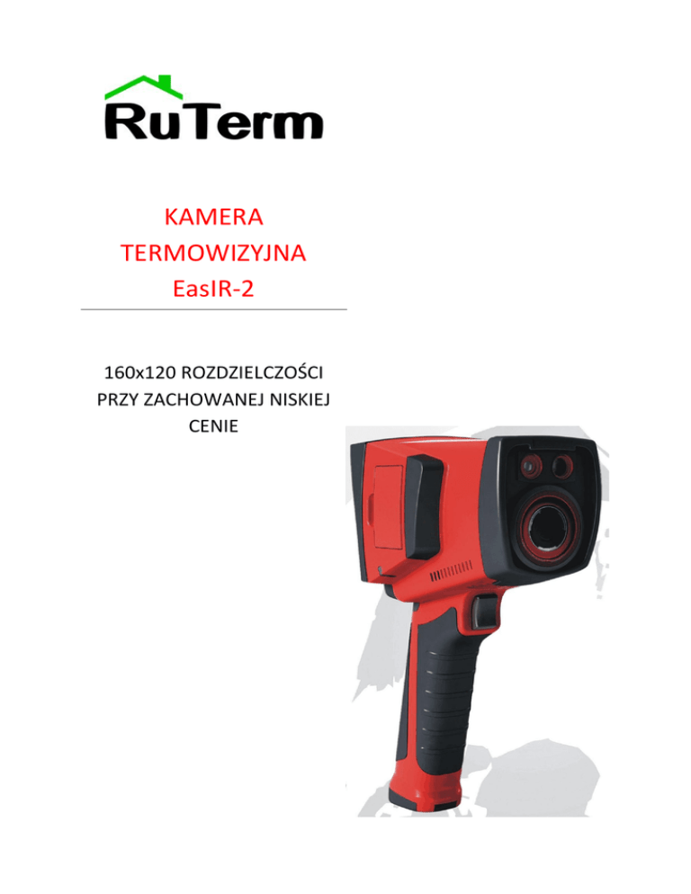 KAMERA TERMOWIZYJNA EasIR-2 160x120 ROZDZIELCZOŚCI PRZY ZACHOWANEJ NISKIEJ CENIE KAMERA EasIR-2 CENA ORAZ DANE TECHNICZNE W TABELI PONIŻEJ. MODEL Pole widzenia Rozdzielczość przestrzenna Czułość termiczna Typ detektora Rozdzielczość Zakres spektralny Fokusowanie Wyświetlacz Obraz widzialny Duo Vision Obraz w obrazie Wyjcie video Zakres pomiarowy Dokładność Funkcje pomiarowe Korekcja Pamięć Typ pliku-termiczny obraz Typ pliku- zdjęcie widzialne Nagrywanie obrazu termicznego Notatki głosowe Typ Bateria Czas pracy na baterii Tryb oszczędzania energii Temperatura pracy Temperatury przechowywania Wilgotność Ochrona Odporność na wstrząs Wibracje Waga z baterią Wymiary USB EasIR-2 OBRAZ TERMICZNY ORAZ OPTYKA 20,60x15,50/0,1m 1,1 mrad 0 100 mK dla 30 C FPA niechłodzony mikroblokometr 160x120 8-14 µm Manualne PREZENTACJA OBRAZU 2.5” LCD Wbudowana kamera , 1600x1200 pikseli , pełny kolor 2 opcje Tak brak POMIAR -200C do +2500C ±20C, ±2% Max/min , punkt centralny Emisyjność ,temperatura ,dystans, wilgotność względna ZAPIS OBRAZU Zapis na wymiennych kartach Mini SD 2GB JPG format, z zawartością danych pomiaru JPG format, z zawartością danych pomiaru brak brak WSKAŹNIK LASEROWY Klasa 2 1mw/635nm red ZASILANIE Baterie AA ≈2,5 h ciągłej pracy Tak SPECYFIKACJA ŚRODOWISKOWA -100C do +500C 0 0 -20 C do +60 C 10% do 95% IP 54 25G 2G PARAMETRY FIZYCZNE 730 g 111mm x 124mm x 240mm INTERFEJS 2.0 Przykładowe wykorzystanie Kamery Termowizyjnej EasIR-2 Już nie musisz się martwić o naładowanie kamery możesz zawsze przy sobie mieć zapasowe baterie Łatwo nawiguj i znajdź problem Gumowa obudowa chroni kamerę przed upadkiem z 2m W razie pytań proszę o kontakt na email [email protected] lub pod numer Tel.509-998-606.