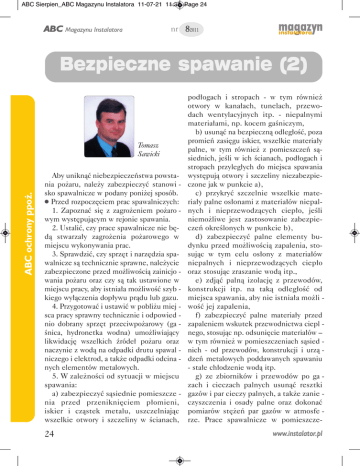 ABC Sierpien_ABC Magazynu Instalatora 11-07-21 11:36 Page 24 ABC Magazynu Instalatora nr 82011 Bezpieczne spawanie (2) ABC ochrony ppoż. Tomasz Sawicki Aby uniknąć niebezpieczeństwa powstania pożaru, należy zabezpieczyć stanowi sko spawalnicze w podany poniżej sposób. ● Przed rozpoczęciem prac spawalniczych: 1. Zapoznać się z zagrożeniem pożaro wym występującym w rejonie spawania. 2. Ustalić, czy prace spawalnicze nie będą stwarzały zagrożenia pożarowego w miejscu wykonywania prac. 3. Sprawdzić, czy sprzęt i narzędzia spawalnicze są technicznie sprawne, należycie zabezpieczone przed możliwością zainicjo wania pożaru oraz czy są tak ustawione w miejscu pracy, aby istniała możliwość szyb kiego wyłączenia dopływu prądu lub gazu. 4. Przygotować i ustawić w pobliżu miej sca pracy sprawny technicznie i odpowied nio dobrany sprzęt przeciwpożarowy (ga śnica, hydronetka wodna) umożliwiający likwidację wszelkich źródeł pożaru oraz naczynie z wodą na odpadki drutu spawal niczego i elektrod, a także odpadki odcina nych elementów metalowych. 5. W zależności od sytuacji w miejscu spawania: a) zabezpieczyć sąsiednie pomieszcze nia przed prze nik nię ciem pło mie ni, iskier i cząstek metalu, uszczelniając wszelkie otwory i szczeliny w ścianach, 24 podłogach i stropach - w tym również otwory w kanałach, tunelach, przewodach wentylacyjnych itp. - niepalnymi materiałami, np. kocem gaśniczym, b) usunąć na bezpieczną odległość, poza promień zasięgu iskier, wszelkie materiały palne, w tym również z pomieszczeń sąsiednich, jeśli w ich ścianach, podłogach i stropach przyległych do miejsca spawania występują otwory i szczeliny niezabezpieczone jak w punkcie a), c) przykryć szczelnie wszelkie materiały palne osłonami z materiałów niepalnych i nieprzewodzących ciepło, jeśli niemożliwe jest zastosowanie zabezpieczeń określonych w punkcie b), d) zabezpieczyć palne elementy budynku przed możliwością zapalenia, stosując w tym celu osłony z materiałów niepalnych i nieprzewodzących ciepło oraz stosując zraszanie wodą itp., e) zdjąć palną izolację z przewodów, konstrukcji itp. na taką odległość od miejsca spawania, aby nie istniała możli wość jej zapalenia, f) zabezpieczyć palne materiały przed zapaleniem wskutek przewodnictwa ciepl nego, stosując np. odsunięcie materiałów – w tym również w pomieszczeniach sąsied nich - od przewodów, konstrukcji i urzą dzeń metalowych poddawanych spawaniu - stałe chłodzenie wodą itp. g) ze zbiorników i przewodów po ga zach i cieczach palnych usunąć resztki gazów i par cieczy palnych, a także zanie czyszczenia i osady palne oraz dokonać pomiarów stężeń par gazów w atmosfe rze. Prace spawalnicze w pomieszcze- www.instalator.pl