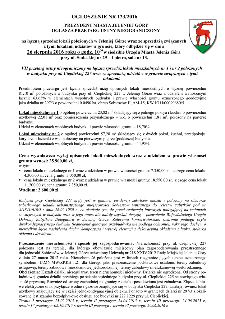 OGŁOSZENIE NR 123/2016 PREZYDENT MIASTA JELENIEJ GÓRY OGŁASZA PRZETARG USTNY NIEOGRANICZONY na łączną sprzedaŜ lokali połoŜonych w Jeleniej Górze wraz ze sprzedaŜą związanych z tymi lokalami udziałów w gruncie, który odbędzie się w dniu 26 sierpnia 2016 roku o godz. 1000 w siedzibie Urzędu Miasta Jelenia Góra przy ul. Sudeckiej nr 29 – I piętro, sala nr 13. VII przetarg ustny nieograniczony na łączną sprzedaŜ lokali mieszkalnych nr 1 i nr 2 połoŜonych w budynku przy ul. Cieplickiej 227 wraz ze sprzedaŜą udziałów w gruncie związanych z tymi lokalami. Przedmiotem przetargu jest łączna sprzedaŜ niŜej opisanych lokali mieszkalnych o łącznej powierzchni 81,10 m2 połoŜonych w budynku przy ul. Cieplickiej 227 w Jeleniej Górze wraz z udziałem wynoszącym łącznie 63,65% w elementach wspólnych budynku i prawie własności gruntu oznaczonego geodezyjnie jako działka nr 297/3 o powierzchni 0.0490 ha, obręb Sobieszów II, AM-15, KW JG1J/00090680/5. Lokal mieszkalny nr 1 o ogólnej powierzchni 23,82 m2 składający się z jednego pokoju i kuchni o powierzchni uŜytkowej 22,01 m2 oraz pomieszczenia przynaleŜnego – w.c. o powierzchni 1,81 m2, połoŜony na parterze budynku. Udział w elementach wspólnych budynku i prawie własności gruntu – 18,70%. Lokal mieszkalny nr 2 o ogólnej powierzchni 57,28 m2 składający się z dwóch pokoi, kuchni, przedpokoju, korytarza i łazienki z w.c. połoŜony na pierwszym piętrze (poddaszu) budynku. Udział w elementach wspólnych budynku i prawie własności gruntu – 44,95%. Cena wywoławcza wyŜej opisanych lokali mieszkalnych wraz z udziałem w prawie własności gruntu wynosi: 25.900,00 zł, w tym: cena lokalu mieszkalnego nr 1 wraz z udziałem w prawie własności gruntu: 7.350,00 zł, z czego cena lokalu: 4.300,00 zł, cena gruntu: 3.050,00 zł, cena lokalu mieszkalnego nr 2 wraz z udziałem w prawie własności gruntu: 18.550,00 zł, z czego cena lokalu: 11.200,00 zł, cena gruntu: 7.350,00 zł. Wadium: 2.600,00 zł. Budynek przy Cieplickiej 227 ujęty jest w gminnej ewidencji zabytków miasta i połoŜony na obszarze zabytkowego układu urbanistycznego miejscowości Sobieszów wpisanego do rejestru zabytków pod nr A/1811/610/J z dnia 26.02.1980 r., co skutkuje tym, Ŝe przed realizacją inwestycji polegającej na zmianach zewnętrznych w budynku oraz w jego otoczeniu naleŜy uzyskać decyzję – pozwolenie Wojewódzkiego Urzędu Ochrony Zabytków Delegatura w Jeleniej Górze. Zalecenia konserwatorskie: ochronie podlega bryła dwukondygnacyjnego budynku (jednokondygnacyjna przybudówka nie podlega ochronie), nakrytego dachem o niewielkim kącie nachylenia dachu, kompozycja i wystrój elewacji z dekoracyjną okładziną z łupka, stolarka okienna i drzwiowa. Przeznaczenie nieruchomości i sposób jej zagospodarowania: Nieruchomość przy ul. Cieplickiej 227 połoŜona jest na terenie, dla którego obowiązuje miejscowy plan zagospodarowania przestrzennego dla jednostki Sobieszów w Jeleniej Górze uchwalony Uchwałą nr 218.XXIV.2012 Rady Miejskiej Jeleniej Góry z dnia 27 marca 2012 roku. Nieruchomość połoŜona jest w liniach rozgraniczających terenu oznaczonego symbolem U,MN,MW/ZP,KS 1.21 dla którego jako przeznaczenie podstawowe ustalono: tereny zabudowy usługowej, tereny zabudowy mieszkaniowej jednorodzinnej, tereny zabudowy mieszkaniowej wielorodzinnej. ObciąŜenia: Kształt działki nieregularny, teren nieruchomości nierówny. Działka nie ogrodzona. Od strony południowej granica działki przebiega po ścianie sąsiedniego budynku przy ul. Cieplickiej 225 stanowiącego własność prywatną. RównieŜ od strony zachodniej na granicy z działki posadowiona jest zabudowa. Złącze kablowe elektryczne oraz przyłącze wodne i gazowe znajdujące się w budynku Cieplicka 227, zasilają równieŜ lokal uŜytkowy znajdujący się w części jednokondygnacyjnej obiektu. Ponadto w granicach działki nr 297/3 zlokalizowane jest szambo bezodpływowe obsługujące budynki nr 227 i 229 przy ul. Cieplickiej. Termin I przetargu: 25.02.2015 r., termin II przetargu: 24.04.2015 r., termin III przetargu: 24.06.2015 r., termin IV przetargu: 02.10.2015 r, termin III przetargu , termin VI przetargu: 29.06.2016 r. UWAGI ! Przed przystąpieniem do przetargu uczestnik zobowiązany jest zapoznać się z przedmiotem przetargu. Lokale moŜna oglądać po uprzednim uzgodnieniu terminu z Zakładem Gospodarki Komunalnej i Mieszkaniowej tel.: 75 64-95-860 lub 75 64-95-861. Informuje się, iŜ wyŜej wymienione nieruchomości nie posiadają świadectwa charakterystyki energetycznej, określającego wielkość energii, wyraŜoną w kWh/m2/rok, niezbędnej do zaspokojenia róŜnych potrzeb związanych z uŜytkowaniem budynku, o którym mowa w ustawie z dnia 29 sierpnia 2014 roku o charakterystyce energetycznej budynków (Dz. U. z 2014 roku, poz. 1200 ze zmianami). Wadium w pieniądzu, w wyŜej określonej wysokości winno wpłynąć na konto depozytowe: Miasto Jelenia Góra - Bank MILLENNIUM S.A. I Oddział w Jeleniej Górze nr 97116022020000000060115681, najpóźniej do dnia 22 sierpnia 2016 roku. Wpłata wadium powinna zawierać oznaczenie lokalu, którego wpłata dotyczy. Uczestnicy przetargu zobowiązani są posiadać: - oświadczenie, Ŝe uczestnik zapoznał się z przedmiotem przetargu, - dokument toŜsamości, - w przypadku osób fizycznych zamierzających nabyć nieruchomość w związku z prowadzoną działalnością gospodarczą – aktualne zaświadczenie o wpisie do ewidencji działalności gospodarczej, które winno być przedłoŜone w Wydziale Gospodarki Nieruchomościami Urzędu Miasta Jelenia Góra przy ul. Ptasiej 2-3, I piętro - pokój nr 111, najpóźniej w terminie do dnia 22 sierpnia 2016 roku. - w przypadku osób prawnych oraz innych podmiotów nie posiadających osobowości prawnej a podlegających rejestracji – aktualny wypis z rejestru oraz właściwe pełnomocnictwa osób reprezentujących po