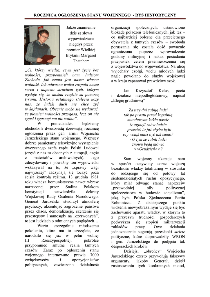ROCZNICA OGŁOSZENIA STANU WOJENNEGO - RYS HISTORYCZNY JakŜe znamienne dziś są słowa wypowiedziane niegdyś przez premier Wielkiej Brytanii Margaret Thatcher: „Ci, którzy wiedzą, czym jest Ŝycie bez wolności, przypomnieli nam, ludziom Zachodu, jak cenna jest nasza własna wolność. Ich odwaŜna walka rozpala nasze serca i napawa strachem tych, którym wydaje się, Ŝe moŜna rządzić za pomocą tyranii. Historia ostatniego stulecia uczy nas, Ŝe ludzki duch nie chce Ŝyć w kajdanach. Obecnie moŜe się wydawać, Ŝe płomień wolności przygasa, lecz on nie zgasł i zgasnąć mu nie wolno”. W poniedziałek będziemy obchodzili dwudziestą dziewiątą rocznicę ogłoszenia przez gen. armii Wojciecha Jaruzelskiego stanu wojennego. Wszyscy dobrze pamiętamy telewizyjne wystąpienie ówczesnego szefa rządu Polski Ludowej (część z nas tu obecnych z autopsji, część z materiałów archiwalnych). Jego zdecydowany i powaŜny ton wypowiedzi wskazywał na to, Ŝe „sprawy wagi najwyŜszej” zaczynają się toczyć poza ścisłą kontrolą reŜimu. 13 grudnia 1981 roku władza komunistyczna nawet wbrew narzuconej przez Stalina Polakom konstytucji zatwierdziła dekrety Wojskowej Rady Ocalenia Narodowego. Generał Jaruzelski stworzył atmosferę psychozy, akcentując zagroŜenie państwa przez chaos, demoralizację, szerzenie się przestępstw i samosądy na „czerwonych”, to jest ludziach o odmiennych poglądach… Warto szczególnie młodszemu pokoleniu, które ma to szczęście, Ŝe narodziło się juŜ w pełni wolnej III Rzeczypospolitej, pokrótce przypomnieć smutne realia tamtych czasów. Zaraz po ogłoszeniu stanu wojennego internowano prawie 7000 związkowców i opozycjonistów politycznych, zawieszono działalność organizacji społecznych, ustanowiono blokadę połączeń telefonicznych, jak teŜ – co najbardziej bolesne dla przeciętnego obywatela z tamtych czasów – swoboda poruszania się została dość powaŜnie ograniczona poprzez wprowadzenie godziny milicyjnej i nakaz posiadania przepustek celem przemieszczenia się z województwa do województwa. Na ulicę wyjechały czołgi, wielu młodych ludzi nagle powołano do słuŜby wojskowej a w kraju zapanował prawdziwy szok. Jan Krzysztof Kelus, poeta i działacz niepodległościowy, napisał „Elegię grudniową” Za trzy dni zabiją ludzi tak po prostu przed kopalnią mundurowa kukła powie Ŝe zginęli znów ludzie - przecieŜ to juŜ chyba było czy wciąŜ musi być tak samo? - O tym Ŝe zabili ludzi znowu będą mówić <<Grudzień>>? Stan wojenny ukazuje nam w sposób oczywisty coraz większą bezsilność władzy totalitarnej w stosunku do rodzącego się od połowy lat siedemdziesiątych ruchu opozycyjnego, który miał odwagę stanąć naprzeciw „przewodniej siły politycznej społeczeństwa w budowie socjalizmu”, jaką była Polska Zjednoczona Partia Robotnicza. Z dzisiejszego punktu widzenia niewyobraŜalnym wydaje się być zachowanie aparatu władzy, w którym to z przyczyn trudności gospodarczych podwyŜsza się stopień militaryzacji zakładów pracy. Owe działania jednoznacznie sugerują przesłanki stricte polityczne, które doprowadziły WRON i gen. Jaruzelskiego do podjęcia tak desperackich kroków. Dzisiejsi „obrońcy” Wojciecha Jaruzelskiego często przywołują fałszywy argumenty, jakoby Generał, dzięki zastosowaniu tych konkretnych metod, ROCZNICA OGŁOSZENIA STANU WOJENNEGO - RYS HISTORYCZNY ocalił rzekomo polskie społeczeństwo od zbrojnej interwencji wojsk Układu Warszawskiego. Jest to teza o tyle kłamliwa, Ŝe 10 grudnia podczas narady politbiura Komunistycznej Partii Związku Radzieckiego Jurij Andropow wypowiedział następujące słowa: (...) Nie moŜemy ryzykować. Nie zamierzamy wprowadzać wojsk do Polski. Jest to słuszne stanowisko i musimy się go trzymać do końca. Nie wiem, jak rozwinie się sprawa z Polską, ale jeśli nawet Polska będzie pod władzą “Solidarności”, to będzie to tylko tyle. A jeśli na Związek Radziecki rzucą się kraje kapitalistyczne, a oni juŜ mają odpowiednie uzgodnienia o róŜnego rodzaju sankcjach ekonomicznych i politycznych, to dla nas będzie to bardzo cięŜkie. Powinniśmy przejawiać troskę o nasz kraj, o umacnianie Związku Radzieckiego. To jest nasza główna linia”. Jak zatem widzimy, wprowadzenie stanu wojennego było aktem jednoznacznie wymierzonym przeciwko Polakom, a mającym na celu ochronę partykularnych interesów elit komunistycznego reŜimu. Niestety wciąŜ niska jest świadomość polskiego społeczeństwa na temat materiałów źródłowych Komisji Susłowa (tzw. Komisji ds. Polskich – celem jej było śledzenie na bieŜąco i analizowanie informacji napływających z Polski, a takŜe systematyczne informowanie o wszystkim radzieckiego kierownictwa). Wynika z nich, Ŝe stroną zabiegającą o interwencję sowiecką w wyniku niepowodzenia stanu wojennego był właśnie generał Wojciech Jaruzelski. Zwolennicy idei wprowadzenia stanu wojennego odwołują się natomiast do wciąŜ wówczas obowiązującej doktryny BreŜniewa, lecz w świetle zgromadzonego do dziś przez historyków materiału dowodowego wydaje się być niemal pewnym, iŜ domniemana interwencja wojsk radzieckich nie była juŜ natenczas moŜliwa. W kwietniu 2007 roku Instytut Narodowej skierował akt Pamięci oskarŜenia do Sądu Rejonowego Warszawa Śródmieście przeciwko dziewięciu organizatorom stanu wojennego (w tym generałom Jaruzelskiemu i Kiszczakowi). IPN oskarŜył ich o zbrodnię komunistyczną, polegającą na kierowaniu "związkiem przestępczym o charakterze zbrojnym, mającym na celu popełnianie przestępstw", a takŜe o podŜeganie członków ówczesnej Rady Państwa PRL do przekroczenia ich uprawnień poprzez uchwalenie dekretów o stanie wojennym w czasie sesji Sejmu PRL – wbrew obowiązującej wówczas Konstytucji(!) Sąd zwrócił jednak historykom IPN-u wspomniany wniosek ze względu na „ist