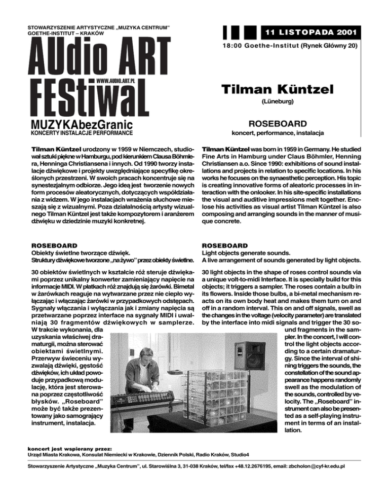 STOWARZYSZENIE ARTYSTYCZNE „MUZYKA CENTRUM” GOETHE-INSTITUT – KRAKÓW 11 LISTOPA DA 2001 18:00 Goethe-Institut (Rynek G³ówny 20) Tilman Küntzel (Lüneburg) MUZYKAbezGranic KONCERTY INSTALACJE PERFORMANCE ROSEBOARD koncert, performance, instalacja Tilman Küntzel urodzony w 1959 w Niemczech, studiowa³ sztuki piêkne w Hamburgu, pod kierunkiem Clausa Böhmlera, Henninga Christiansena i innych. Od 1990 tworzy instalacje dŸwiêkowe i projekty uwzglêdniaj¹ce specyfikê okreœlonych przestrzeni. W swoich pracach koncentruje siê na synestezjalnym odbiorze. Jego ide¹ jest tworzenie nowych form procesów aleatorycznych, dotycz¹cych wspó³dzia³ania z widzem. W jego instalacjach wra¿enia s³uchowe mieszaj¹ siê z wizualnymi. Poza dzia³alnoœci¹ artysty wizualnego Tilman Küntzel jest tak¿e kompozytorem i aran¿erem dŸwiêku w dziedzinie muzyki konkretnej. Tilman Küntzel was born in 1959 in Germany. He studied Fine Arts in Hamburg under Claus Böhmler, Henning Christiansen a.o. Since 1990: exhibitions of sound installations and projects in relation to specific locations. In his works he focuses on the synaesthetic perception. His topic is creating innovative forms of aleatoric processes in interaction with the onlooker. In his site-specific installations the visual and auditive impressions melt together. Enclose his activities as visual artist Tilman Küntzel is also composing and arranging sounds in the manner of musique concrete. ROSEBOARD Obiekty œwietlne tworz¹ce dŸwiêk. Struktury dŸwiêkowe tworzone „na ¿ywo” przez obiekty œwietlne. ROSEBOARD Light objects generate sounds. A live arrangement of sounds generated by light objects. 30 obiektów œwietlnych w kszta³cie ró¿ steruje dŸwiêkami poprzez unikalny konwerter zamieniaj¹cy napiêcie na informacje MIDI. W p³atkach ró¿ znajduj¹ siê ¿arówki. Bimetal w ¿arówkach reaguje na wytwarzane przez nie ciep³o wy³¹czaj¹c i w³¹czaj¹c ¿arówki w przypadkowych odstêpach. Sygna³y w³¹czania i wy³¹czania jak i zmiany napiêcia s¹ przetwarzane poprzez interface na sygna³y MIDI i uwalniaj¹ 30 fragmentów dŸwiêkowych w samplerze. W trakcie wykonania, dla uzyskania w³aœciwej dramaturgii, mo¿na sterowaæ obiektami œwietlnymi. Przerwyw œwieceniu wyzwalaj¹ dŸwiêki, gêstoœæ dŸwiêków, ich uk³ad powoduje przypadkow¹ modulacjê, która jest sterowana poprzez czêstotliwoœæ b³ysków. „Roseboard” mo¿e byæ tak¿e prezentowany jako samograj¹cy instrument, instalacja. 30 light objects in the shape of roses control sounds via a unique volt-to-midi Interface. It is specially build for this objects; it triggers a sampler. The roses contain a bulb in its flowers. Inside those bulbs, a bi-metal mechanism reacts on its own body heat and makes them turn on and off in a random interval. This on and off signals, swell as the changes in the voltage (velocity parameter) are translated by the interface into midi signals and trigger the 30 sound fragments in the sampler. In the concert, I will control the light objects according to a certain dramaturgy. Since the interval of shining triggers the sounds, the constellation of the sound appearance happens randomly swell as the modulation of the sounds, controlled by velocity. The „Roseboard” instrument can also be presented as a self-playing instrument in terms of an installation. koncert jest wspierany przez: Urz¹d Miasta Krakowa, Konsulat Niemiecki w Krakowie, Dziennik Polski, Radio Kraków, Studio4 Stowarzyszenie Artystyczne „Muzyka Centrum”, ul. Starowiœlna 3, 31-038 Kraków, tel/fax +48.12.2676195, email: [email protected]