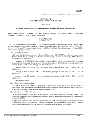 Projekt z dnia.............................., zgłoszony przez ......................... UCHWAŁA NR RADY MIEJSKIEJ W BIELSKU-BIAŁEJ z dnia 2017 r. w sprawie zmiany Statutu Miejskiego Zakładu Komunikacyjnego w Bielsku-Białej Na podstawie art.18 ust.1, art.40 ust.2 pkt 2 oraz art.41 ust.1 ustawy z dnia 8 marca 1990 r. o samorządzie gminnym ( t.jedn. Dz.U. z 2016 r. poz.446 z późn.zm.) RADA MIEJSKA postanawia § 1. W Załączniku do Uchwały Nr LIII/1222/2010 Rady Miejskiej w Bielsku-Białej z dnia 2 marca 2010 r. w sprawie zatwierdzenia Statutu Miejskiego Zakładu Komunikacyjnego w Bielsku-Białej (Dz.Urz. Woj. Śl. z 2010 r. Nr 58, poz.938) stanowiącym Statut Miejskiego Zakładu Komunikacyjnego w Bielsku-Białej wprowadzić następujące zmiany: . 1) § 1 otrzymuje brzmienie: „§ 1. Miejski Zakład Komunikacyjny w Bielsku-Białej, zwany dalej „MZK” jest jednostką organizacyjną Miasta Bielska-Białej działającą w formie samorządowego zakładu budżetowego. MZK działa w szczególności na podstawie: 1. uchwały Nr XXII/134/91 Rady Miejskiej w Bielsku-Białej z dnia 13 czerwca 1991r. w sprawie przekształcenia Miejskiego Przedsiębiorstwa Komunikacyjnego w Bielsku-Białej w zakład budżetowy o nazwie „Miejski Zakład Komunikacyjny w Bielsku-Białej”, 2. ustawy z dnia 27 sierpnia 2009 r. o finansach publicznych (t.jedn. Dz.U. z 2016 r. poz.1870 z późn.zm.), 3. ustawy z dnia 8 marca 1990 r. o samorządzie gminnym (t.jedn. Dz.U. z 2016 r. poz.446 z późn.zm.), 4. ustawy z dnia 20 grudnia 1996 r. o gospodarce komunalnej (t.jedn. Dz.U. z 2016 r. poz.573 z późn.zm.), 5. niniejszego Statutu.” 2) w § 7 ust.3 otrzymuje brzmienie: „3. Źródłem finansowania MZK są przychody z działalności określonej w § 3, rekompensaty za świadczenie usług publicznych w zakresie transportu pasażerskiego, dotacje z budżetu miasta oraz środki finansowe wynikające z rozliczenia podatku od towarów i usług.” 3) w § 7 dodaje się ust.4-7 w brzmieniu: „4. Wysokość środków finansowych wynikających z rozliczenia podatku od towarów i usług, które podlegają przekazaniu do MZK równa się nadwyżce podatku naliczonego nad należnym, związanego z działalnością MZK. 5. Wysokość środków, które podlegają przekazaniu do MZK określana jest na podstawie deklaracji cząstkowych VAT-7, przesyłanych Urzędowi Miejskiemu w Bielsku-Białej przez MZK i stanowi nadwyżkę podatku naliczonego nad należnym, związanego z działalnością tego zakładu. Id: 7FBEC0C6-2842-4F57-9CF0-8C65010E96CA. Projekt Strona 1 z 3 6. W przypadku wystąpienia w deklaracji VAT-7 miasta Bielska-Białej kwoty podlegającej wpłacie do urzędu skarbowego, zwrot nadwyżki podatku VAT, wynikający z rozliczenia przedstawionego przez MZK, nastąpi w terminie 7 dni od dnia złożenia deklaracji VAT-7 miasta Bielska-Białej. 7. W przypadku wystąpienia w deklaracji VAT-7 miasta Bielska-Białej nadwyżki podatku VAT wykazanej do zwrotu, zwrot nadwyżki podatku VAT wynikający z rozliczenia przedstawionego przez MZK, nastąpi w terminie 7 dni od dnia zwrotu na rachunek bankowy miasta Bielska-Białej.” § 2. Wykonanie Uchwały powierza się Prezydentowi Miasta Bielska-Białej. § 3. Uchwała wchodzi w życie po upływie 14 dni od dnia ogłoszenia w Dzienniku Urzędowym Województwa Śląskiego. Id: 7FBEC0C6-2842-4F57-9CF0-8C65010E96CA. Projekt Strona 2 z 3 Uzasadnienie Celem Uchwały jest dostosowanie Statutu Miejskiego Zakładu Komunikacyjnego w Bielsku-Białej do zmian wynikających z przepisów ustawy z dnia 5 września 2016 r. o szczególnych zasadach rozliczeń podatku od towarów i usług oraz dokonywania zwrotu środków publicznych przeznaczonych na realizację projektów finansowanych z udziałem środków pochodzących z budżetu Unii Europejskiej lub od państw członkowskich Europejskiego Porozumienia o Wolnym Handlu przez jednostki samorządu terytorialnego (Dz. U. poz. 1454). Przepis art. 21 ww. ustawy znowelizował z dniem 1 października 2016 r. przepisy art. 15 i 16 ustawy o finansach publicznych. Centralizacja rozliczeń podatku od towarów i usług oraz nałożenie obowiązków w tym względzie na Miasto Bielsko-Biała, skutkuje m.in. wykreśleniem Miejskiego Zakładu Komunikacyjnego w Bielsku-Białej z rejestru podatników VAT. Zgodnie z art. 15 ust. 4a ustawy z dnia 27 sierpnia 2009 r. o finansach publicznych (tekst jedn. Dz. U. z 2016 r. poz. 1870 z późn.zm.) - w brzmieniu określonym wymienioną wyżej ustawą z dnia 5 września 2016 r. samorządowy zakład budżetowy może otrzymywać z budżetu jednostki samorządu terytorialnego środki finansowe wynikające z rozliczenia podatku od towarów i usług, z tym, że ich wysokość nie może być wyższa niż wynikająca z rozliczenia tego podatku związanego z tym zakładem. Dla wyraźnego potwierdzenia, że jednym ze źródeł finansowania Miejskiego Zakładu Komunikacyjnego w Bielsku-Białej będą środki finansowe wynikające z rozliczenia podatku od towarów i usług nadaje się nowe brzmienie postanowieniom § 7 ust.3 Statutu. Jednocześnie w § 1 Statutu wskazującym na podstawy prawne działalności Miejskiego Zakładu Komunikacyjnego w Bielsku-Białej, proponuje się ich uaktualnienie. Id: 7FBEC0C6-2842-4F57-9CF0-8C65010E96CA. Projekt Strona 3 z 3