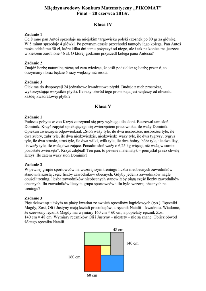 Międzynarodowy Konkurs Matematyczny „PIKOMAT” Finał – 20 czerwca 2013r. Klasa IV Zadanie 1 Od 8 rano pan Antoś sprzedaje na miejskim targowisku polski czosnek po 80 gr za główkę. W 5 minut sprzedaje 4 główki. Po pewnym czasie przechodzi tamtędy jego kolega. Pan Antoś może oddać mu 50 zł, które kilka dni temu pożyczył od niego, ale i tak na koniec ma jeszcze w kieszeni zarobione 46 zł. O której godzinie przyszedł kolega pana Antosia? Zadanie 2 Znajdź liczbę naturalną różną od zera wiedząc, że jeśli podzielisz tę liczbę przez 6, to otrzymany iloraz będzie 5 razy większy niż reszta. Zadanie 3 Olek ma do dyspozycji 24 jednakowe kwadratowe płytki. Buduje z nich prostokąt, wykorzystując wszystkie płytki. Ile razy obwód tego prostokąta jest większy od obwodu każdej kwadratowej płytki? Klasa V Zadanie 1 Podczas pobytu w zoo Krzyś zatrzymał się przy wybiegu dla słoni. Buszował tam słoń Dominik. Krzyś zapytał opiekującego się zwierzęciem pracownika, ile waży Dominik. Opiekun zwierzęcia odpowiedział: „Słoń waży tyle, ile dwa nosorożce, nosorożec tyle, ile dwa żubry, żubr tyle, ile dwa niedźwiedzie, niedźwiedź waży tyle, ile dwa tygrysy, tygrys tyle, ile dwa strusie, struś tyle, ile dwa wilki, wilk tyle, ile dwa bobry, bóbr tyle, ile dwa lisy, lis waży tyle, ile ważą dwa zające. Ponadto słoń waży o 6,25 kg więcej, niż ważą w sumie pozostałe zwierzęta”. Krzyś zdębiał! Ten pan, to pewnie matematyk – pomyślał przez chwilę Krzyś. Ile zatem waży słoń Dominik? Zadanie 2 W pewnej grupie sportowców na wczorajszym treningu liczba nieobecnych zawodników stanowiła szóstą część liczby zawodników obecnych. Gdyby jeden z zawodników nagle opuścił trening, liczba zawodników nieobecnych stanowiłaby piątą część liczby zawodników obecnych. Ilu zawodników liczy ta grupa sportowców i ilu było wczoraj obecnych na treningu? Zadanie 3 Pięć dziewcząt ułożyło na plaży kwadrat ze swoich ręczników kąpielowych (rys.). Ręczniki Magdy, Zosi, Oli i Justyny mają kształt prostokątów, a ręcznik Natalii – kwadratu. Wiadomo, że czerwony ręcznik Magdy ma wymiary 160 cm × 60 cm, a popielaty ręcznik Zosi 140 cm × 48 cm. Wymiary ręczników Oli i Justyny – niestety – nie są znane. Oblicz obwód żółtego ręcznika Natalii. 48 cm 140 cm 160 cm 60 cm Klasa VI Zadanie 1 Pewien dworzanin zauważył strażnika wspinającego się po drabinie na mur otaczający pałacowy ogród. – Ciekawe, jaką wysokość ma ten mur? – zapytał wołając. Na to strażnik odpowiedział: – Mam 198 cm wzrostu. Gdybym stanął pod murem, moja głowa byłaby o tyle centymetrów poniżej szczytu muru, ile jest teraz nad nim, gdy stoję na drabinie w połowie wysokości muru. Jaką wysokość ma mur? Zadanie 2 Uzupełnij brakujące mianowniki, aby powstało poprawne działanie. 1 1 1 1 1 1 1 + + + + + + =1 2 3 72 108 216 Zadanie 3 Dany jest czworokąt ABCD, w którym boki AB i CD są równoległe oraz |AD| = |DC| = |CB| i |AB| = |AC|. Oblicz miary kątów wewnętrznych tego czworokąta. D C A B Klasa I Zadanie 1 Dana jest pewna liczba trzycyfrowa. Jeżeli dodamy do niej 12 i tę zwiększoną liczbę podzielimy przez 7, to otrzymamy resztę 5. Jeżeli do danej liczby trzycyfrowej dodamy 14 i zwiększoną liczbę podzielimy przez 9, znowu otrzymamy resztę 5. Jeżeli do danej liczby trzycyfrowej dodamy 18 i zwiększoną liczbę podzielimy przez 13, także otrzymamy resztę 5. Wyznacz daną liczbę trzycyfrową. Zadanie 2 Grupa gimnazjalistów wybrała się do lasu na grzybobranie, którego celem były borowiki szlachetne. Jeden z nich znalazł 6 borowików, a pozostali po 13. Następnym razem w grzybobraniu wzięła udział inna grupa gimnazjalistów. Tym razem jeden znalazł 5 borowików, a pozostali po 10. Ilu gimnazjalistów uczestniczyło w pierwszym grzybobraniu, a ilu w drugim, jeżeli wiadomo, że zebrano w nich tę samą ilość borowików – większą od 100, ale nie przekraczającą 200? Zadanie 3 Oblicz pole czworokąta AFBE oraz pola trójkątów BCE i BDF. 6 cm Klasa II Zadanie 1 Pan Antoś jest najstarszy, pan Stasiu zaś najmłodszy. Dziesięciokrotna różnica ich wieku jest sumą lat pana Antosia i pana Janka. Wiek pana Marka jest średnią wieku pozostałych panów, a różnica jego wieku i wieku pana Stasia jest dwukrotnie większa od różnicy lat pana Antosia i pana Janka. Różnica między wiekiem pana Janka i pana Stasia jest o dwa większa niż różnica między wiekiem pana Antosia i pana Marka. Ile lat ma każdy z panów? Zadanie 2 Rozwiąż w liczbach całkowitych równanie: 1 1 2 − 2 − = 3 x y Zadanie 3 Dany jest kwadrat o boku długości 1. Umieszczamy w nim cztery większe i cztery mniejsze okręgi (rys.). Oblicz pole kwadratu, który powstał po połączeniu środków mniejszych okręgów. Klasa III Zadanie 1 Staszek kupił wczoraj pewną ilość pomarańczy. Dzisiaj pomarańcze podrożały o 50% i za ilość pomarańczy o k% mniejszą niż wczoraj zapłacił o k% więcej. O ile procent więcej pomarańczy Staszek kupił wczoraj niż dzisiaj? Zadanie 2 Na zajęciach koła matematycznego uczniowie mieli do rozwiązania poniższe równanie: a b b−a+ a 1+ b =1+ b − a , 1 1+ a+b 2+ w którym nie sprecyzowano, która z liter oznacza niewiadomą. Kasia przyjęła, że niewiadomą jest a, zaś Danusia przyjęła, że niewiadomą jest b. Jakie było rozwiązanie Kasi, a jakie Danusi? Zadanie 3 Dany jest kwadrat ABCD o boku długości 8. Oblicz pole trapezu KLMN wiedząc, że punkty K i L są środkami boków AB i BC, a odcinek AC przekątną kwadratu. Opracowanie: Jan Domaszewicz, Marek Kawałko, Katarzyna Żak
