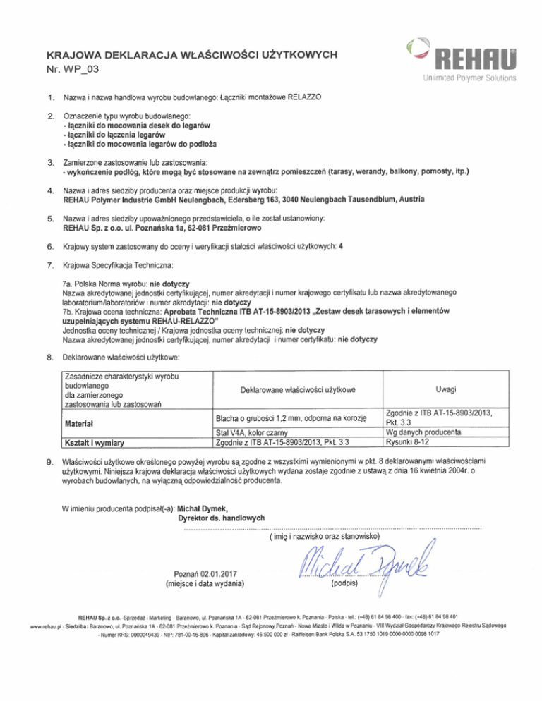 KRAJOWA DEKLARACJA Wt.ASCIWOSCI UZVTKOWYCH Nr. WP_03 C)REHRU Unlimited Polymer Solutions 1. Nazwa i nazwa hand Iowa wyrobu budowlanego: Laczniki montazowe RELAZZO 2. Oznaczenie typu wyrobu budowlanego: • lacznikl do mocowania desek do legarow · Ictczniki do Ictczenia legarow · Ictczniki do mocowania legarow do podloza 3. Zamierzone zastosowanie lub zastosowania: · wykoriczenie podlog, ktöre mogct bye stosowane na zewnatrz pomieszczeri (tarasy, werandy, balkony, pomosty, itp.) 4. Nazwa i adres siedziby producenta oraz miejsce produkcji wyrobu: REHAU Polymer Industrie GmbH Neulengbach, Edersberg 163, 3040 Neulengbach Tausendblum, Austria 5. Nazwa i adres siedziby upowaznionego przedstawiciela, 0 ile zostal ustanowiony: REHAU Sp. z 0.0. ul, Poznariska 1a, 62·081 Przezmierowo 6. Krajowy system zastosowany do oceny i weryfikacji stalosci wlasciwosci uzytkowych: 4 7. Krajowa Specyfikacja Techniczna: 7a. Polska Norma wyrobu: nie dotyczy Nazwa akredytowanej jednostki certyfikujq_cej, numer akredytacji i numer krajowego certyfikatu lub nazwa akredytowanego lsboratoriumäaboratoriöwi numer akredytacji: nie dotyczy 7b. Krajowa ocena techniczna: Aprobata Techniczna ITB AT·15·8903/2013 "Zestaw desek tarasowych i elementöw uzupemiajacych systemu REHAU·RELAZZO" Jednostka oceny technicznej / Krajowa jednostka oceny technicznej: nie dotyczy Nazwa akredytowanej jednostki certyfikujq_cej, numer akredytacji i numer certyfikatu: nie dotyczy 8. Deklarowane wlasciwosci uzytkowe: Zasadnicze charakterystyki wyrobu budowlanego dia zamierzonego zastosowania lub zastosowan Material Ksztatt i wymiary 9. Deklarowane wlasciwosci uzylkowe Blacha 0 qrubosc' 1,2 mm, odporna na korozje Stal V4A, kolor czarnv Zgodnie z ITB AT-15-8903/2013, Pkt. 3.3 Uwagi Zgodnie z ITB AT-15-8903/2013, Pkt. 3.3 Wq danvch producenta Rysunki 8-12 Wlasciwosci uzytkowe okrestoneqo powyze] wyrobu sa zgodne z wszystkimi wymienionymi w pkt. 8 deklarowanymi wlasciwosciami uzyikowymi. Niniejsza krajowa deklaracja wlasciwosci uzylkowych wydana zostaje zgodnie z ustawaz dnia 16 kwietnia 2004r. 0 wyrobach budowlanych, na wylq_cznq odpowiedzialnosc producenta. W imieniu producenta podpisal(-a): Michal Dymek, Dyrektor ds. handlowych Poznan 02.01.2017 (miejsce i data wydania) REHAU Sp. z 0.0. -Sprzedaz i Marketing· Baranowo, ul. Poznanska lA . 62-081 Przeimierowo k. Poznania . Polska tel.: (->48) 61 8498400· fax: (->48) 61 8498401 www.rehau.pl.Siedziba:Baranowo.uI.PoznanskalA.62-081Przeimierowok.Poznania.SilcdRejonowyPoznan-NoweMiastoiWildawPoznaniu·VIIi Wydzial Gospodarczy Krajowego Rejestru Silcdowego . Numer KRS: 0000049439· NIP: 781·00-16-806· Kapital zakladowy: 46 500 000 zl· Raiffeisen Bank Polska S.A. 531750 1019 0000 0000 00981017