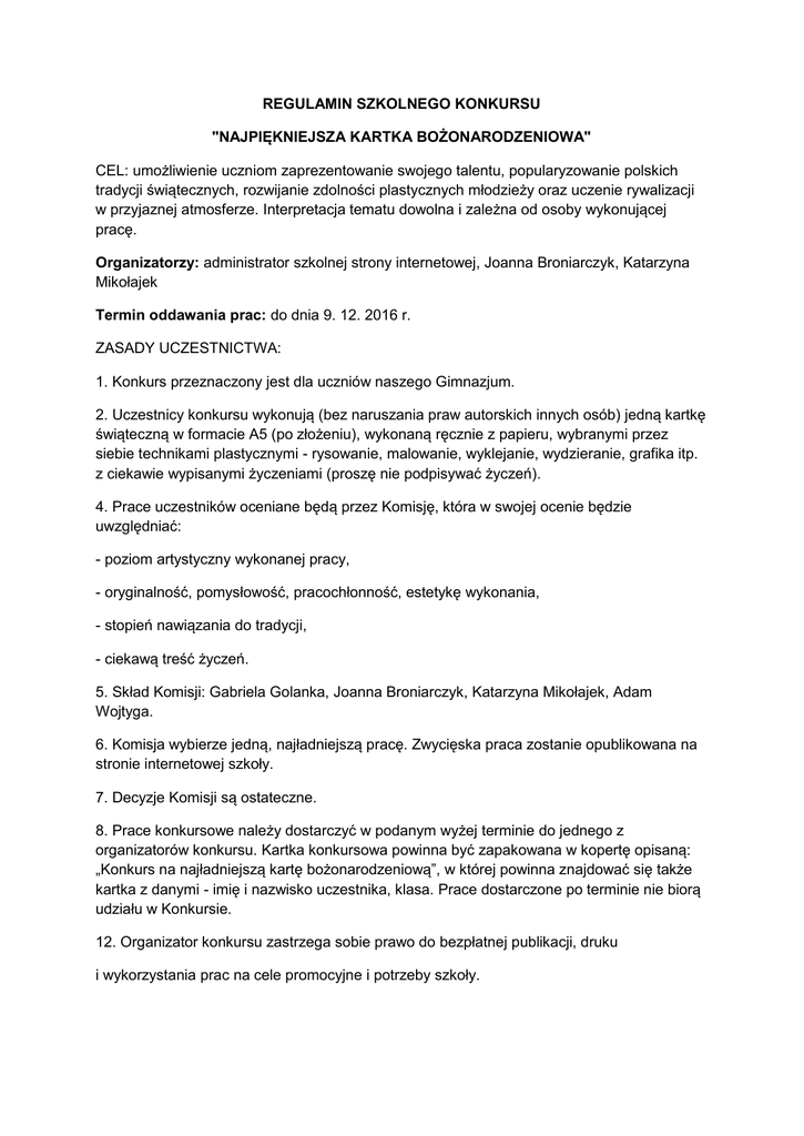REGULAMIN SZKOLNEGO KONKURSU "NAJPIĘKNIEJSZA KARTKA BOŻONARODZENIOWA" CEL: umożliwienie uczniom zaprezentowanie swojego talentu, popularyzowanie polskich tradycji świątecznych, rozwijanie zdolności plastycznych młodzieży oraz uczenie rywalizacji w przyjaznej atmosferze. Interpretacja tematu dowolna i zależna od osoby wykonującej pracę. Organizatorzy: administrator szkolnej strony internetowej, Joanna Broniarczyk, Katarzyna Mikołajek Termin oddawania prac: do dnia 9. 12. 2016 r. ZASADY UCZESTNICTWA: 1. Konkurs przeznaczony jest dla uczniów naszego Gimnazjum. 2. Uczestnicy konkursu wykonują (bez naruszania praw autorskich innych osób) jedną kartkę świąteczną w formacie A5 (po złożeniu), wykonaną ręcznie z papieru, wybranymi przez siebie technikami plastycznymi - rysowanie, malowanie, wyklejanie, wydzieranie, grafika itp. z ciekawie wypisanymi życzeniami (proszę nie podpisywać życzeń). 4. Prace uczestników oceniane będą przez Komisję, która w swojej ocenie będzie uwzględniać: - poziom artystyczny wykonanej pracy, - oryginalność, pomysłowość, pracochłonność, estetykę wykonania, - stopień nawiązania do tradycji, - ciekawą treść życzeń. 5. Skład Komisji: Gabriela Golanka, Joanna Broniarczyk, Katarzyna Mikołajek, Adam Wojtyga. 6. Komisja wybierze jedną, najładniejszą pracę. Zwycięska praca zostanie opublikowana na stronie internetowej szkoły. 7. Decyzje Komisji są ostateczne. 8. Prace konkursowe należy dostarczyć w podanym wyżej terminie do jednego z organizatorów konkursu. Kartka konkursowa powinna być zapakowana w kopertę opisaną: „Konkurs na najładniejszą kartę bożonarodzeniową”, w której powinna znajdować się także kartka z danymi - imię i nazwisko uczestnika, klasa. Prace dostarczone po terminie nie biorą udziału w Konkursie. 12. Organizator konkursu zastrzega sobie prawo do bezpłatnej publikacji, druku i wykorzystania prac na cele promocyjne i potrzeby szkoły.