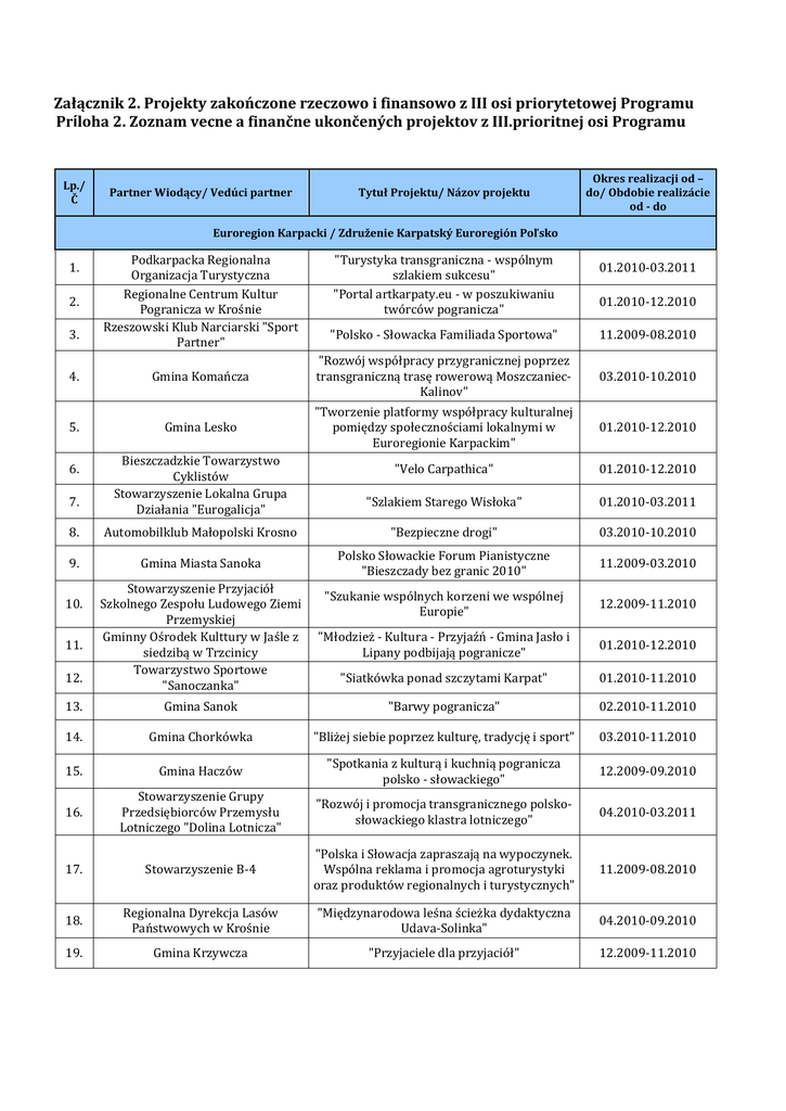 Załącznik 2. Projekty zakończone rzeczowo i finansowo z III osi priorytetowej Programu Príloha 2. Zoznam vecne a finančne ukončených projektov z III.prioritnej osi Programu Lp./ Č Partner Wiodący/ Vedúci partner Tytuł Projektu/ Názov projektu Okres realizacji od – do/ Obdobie realizácie od - do Euroregion Karpacki / Združenie Karpatský Euroregión Poľsko 1. 2. 3. Podkarpacka Regionalna Organizacja Turystyczna Regionalne Centrum Kultur Pogranicza w Krośnie Rzeszowski Klub Narciarski "Sport Partner" "Turystyka transgraniczna - wspólnym szlakiem sukcesu" "Portal artkarpaty.eu - w poszukiwaniu twórców pogranicza" 01.2010-03.2011 01.2010-12.2010 "Polsko - Słowacka Familiada Sportowa" 11.2009-08.2010 4. Gmina Komańcza "Rozwój współpracy przygranicznej poprzez transgraniczną trasę rowerową MoszczaniecKalinov" 03.2010-10.2010 5. Gmina Lesko "Tworzenie platformy współpracy kulturalnej pomiędzy społecznościami lokalnymi w Euroregionie Karpackim" 01.2010-12.2010 "Velo Carpathica" 01.2010-12.2010 "Szlakiem Starego Wisłoka" 01.2010-03.2011 6. 7. Bieszczadzkie Towarzystwo Cyklistów Stowarzyszenie Lokalna Grupa Działania "Eurogalicja" 8. Automobilklub Małopolski Krosno "Bezpieczne drogi" 03.2010-10.2010 9. Gmina Miasta Sanoka Polsko Słowackie Forum Pianistyczne "Bieszczady bez granic 2010" 11.2009-03.2010 "Szukanie wspólnych korzeni we wspólnej Europie" 12.2009-11.2010 "Młodzież - Kultura - Przyjaźń - Gmina Jasło i Lipany podbijają pogranicze" 01.2010-12.2010 "Siatkówka ponad szczytami Karpat" 01.2010-11.2010 10. 11. 12. Stowarzyszenie Przyjaciół Szkolnego Zespołu Ludowego Ziemi Przemyskiej Gminny Ośrodek Kulttury w Jaśle z siedzibą w Trzcinicy Towarzystwo Sportowe "Sanoczanka" 13. Gmina Sanok "Barwy pogranicza" 02.2010-11.2010 14. Gmina Chorkówka "Bliżej siebie poprzez kulturę, tradycję i sport" 03.2010-11.2010 15. Gmina Haczów "Spotkania z kulturą i kuchnią pogranicza polsko - słowackiego" 12.2009-09.2010 16. Stowarzyszenie Grupy Przedsiębiorców Przemysłu Lotniczego "Dolina Lotnicza" "Rozwój i promocja transgranicznego polskosłowackiego klastra lotniczego" 04.2010-03.2011 17. Stowarzyszenie B-4 "Polska i Słowacja zapraszają na wypoczynek. Wspólna reklama i promocja agroturystyki oraz produktów regionalnych i turystycznych" 11.2009-08.2010 18. Regionalna Dyrekcja Lasów Państwowych w Krośnie "Międzynarodowa leśna ścieżka dydaktyczna Udava-Solinka" 04.2010-09.2010 19. Gmina Krzywcza "Przyjaciele dla przyjaciół" 12.2009-11.2010 20. Państwowa Wyższa Szkoła Zawodowa w Krośnie "Aktywność na całe Zycie" Polsko-Słowacka platforma kultury fizycznej i promocji zdrowia studentów 12.2009-11.2010 21. Caritas Diecezji Rzeszowskiej Ośrodek Wypoczynkowo Rehabilitacyjny w Myczkowcach "Transgraniczna wymiana dziedzictwa kulturowego i przyrodniczego - Myczkowce, Mała Domasza" 09.2009-08.2010 22. Nadleśnictwo Ustrzyki Dolne; Rynek 6; 38-700 Ustrzyki Dolne "Kłokoczka południowa roślinnym symbolem współpracy polskich i słowackich regionów nadgranicznych" 11.2009-10.2010 23. Ośrodek kultury w Wiśniowej "Przyjaźń w kolorach tęczy" 12.2009-11.2010 24. Gmina miejska Jarosław "Przywracając dawną świetność - Jarmark Jarosławski na mapie kulturalno gospodarczej Euroregionu Karpackiego" 01.2010-12.2010 25. Gmina Krosno "Anioły pogranicza" 11.2009-03.2010 26. Województwo Podkarpackie "Transgraniczny produkt turystyczny Zaklęte w drewnie" 01.2010-08.2010 27. I Liceum Ogólnokształcące im. Mikołaja Kopernika w Krośnie "Projekt Kopernik" 01.2010-12.2010 28. Towarzystwo Jezusowe Prowincja Polski Południowej 29. Bieszczadzkie Forum Europejskie 30. Stowarzyszenie Samorządów Terytorialnych "Aglomeracja Rzeszowska" 31. Rzeszowska Agencja Rozwoju Regionalnego S.A. 32. Gmina Zarszyn 33. Gmina Tryńcza 34. Powiat Rzeszowski 35. Powiat Krośnieński 36. Komenda Wojewódzka Policji w Rzeszowie 37. Gmina Żurawica 38. Powiat Sanocki 39. Zespół Szkół Licealnych im. Józefa Piłsudskiego w Ustrzykach Dolnych 40. 41. 42. Środowiskowy Dom Samopomocy w Ustrzykach Dolnych Bieszczadzkie Stowarzyszenie Ekoturystyczne "Baszta" Muzeum Rzemiosła w Krośnie "Transgraniczna wymiana kulturalno turystyczna - Księża Jezuici w Starej Wsi i Gmina Drienica" Agroturystyka szansą na rozwój polskich i słowackich terenów przygranicznych" "Polskie i Słowackie Aglomeracje Euroregionu Karpackiego - studium rozwoju" "Poszerzając horyzonty- transgraniczna promocja turystyki Podkarpacia i Kraju Preszowskiego" "Wspólna historia podstawą przyjaźni polskosłowackiej" "Kultura łączy narody, Polsko-słowackie spotkania kulturowo-sportowe" Samorząd Polski i Słowacki - partnerstwo na rzecz rozwoju" "Centrum Wspierania Inicjatyw Transgranicznych" "Bezpieczne pogranicze" "Piknik ekologiczny - promocja ekologii i lokalnego dziedzictwa przyrodniczego" "Polsko-słowacki projekt edukacyjno badawczy "Wspólne Karpaty" "Odnajdujemy wymiary wspólnego sąsiedztwa - budujemy wspólnotę sąsiadujących społeczności" 11.2009-10.2010 10.2009-09.2010 10.2009-09.2010 09.2010-06.2011 03.2010-02.2011 04.2010-10.2010 06.2009-12.2009 01.2010-09.2010 01.2010-10.2010 11.2009-06.2010 01.2010-12.2010 12.2009-11.2010 "Terapia nie zna granic" 01.2010-12.2010 "Promocja twórczości rękodzielniczej" 03.2010-10.2010 "Dobre sąsiedztwo - współpraca kulturalna Krosna i Presova" 03.2010-02.2011 43. Podkarpacka Izba Gospodarcza "Bieszczadzkie Zbójowanie na rowerze" 03.2010-12.2010 44. Małopolski Instytut Gospodarczy w Rzeszowie Analiza porównawcza bezpośrednich inwestycji zagranicznych w Kraju Preszowskim i na Podkarpaciu 06.2011-01.2012 45. Gmina Lesko Instytucjonalizacja współpracy terytorialnej w zakresie turystyki w Euroregionie Karpackim 06.2011-04.2012 Wspólna strategia-możliwością rozwoju pogranicza polsko-słowackiego 07.2011-07.2012 Ratownictwo wodne bez granic 04.2012-09.2012 Bajkowa Kraina Pogranicza 06.2011-05.2012 46. 47. 48. Rzeszowska Agencj