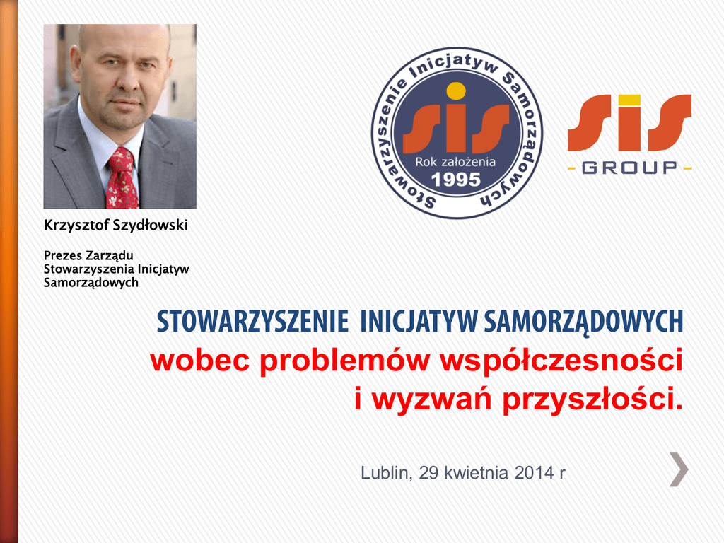 Krzysztof Szydłowski Prezes Zarządu Stowarzyszenia Inicjatyw Samorządowych wobec problemów współczesności i wyzwań przyszłości. Lublin, 29 kwietnia 2014 r Konferencja realizowana jest w ramach projektu „Wsparcie Stowarzyszenia Inicjatyw Samorządowych jako instytucji otoczenia biznesu i transferu wiedzy poprzez opracowanie strategii rozwoju” Projekt współfinansowany jest ze środków EFFR w ramach II Osi Priorytetowej Regionalnego Programu Operacyjnego Województwa Lubelskiego na lata 2007-2013, Działanie 2.3 Schemat B – „Wsparcie instytucji otoczenia biznesu i transferu wiedzy” Klika słów o nas Klika słów o nas Miejsca realizacji projektów SIS www.sis-dotacje.pl DZIAŁANIA NA RZECZ MŚP DORADZTWO DLA PRZEDSIĘBIORSTW. SIS doradza w zakresie pozyskiwania środków UE, współpracy ze środowiskiem naukowobadawczym, prowadzenia inwestycji i dialogu społecznego. SPECJALISTYCZNE SZKOLENIA. SIS pomaga podnosić kompetencje kadr polskich firm. SIS organizuje szkolenia specjalistyczne, zawodowe, podnoszące kwalifikacje: - finanse, księgowość, spin-off, spin out, giełda papierów wartościowych, grafika komputerowa, sieci informatyczne, oprogramowanie kwalifikacje dla kierowców, fotografia, film protokół dyplomatyczny, międzykulturowość w biznesie standardy współpracy międzysektorowej prawo i wiele innych DZIAŁANIA NA RZECZ MŚP SPECJALISTYCZNE SZKOLENIA. Projektowanie i montaż sieci światłowodowych Montaż instalacji OZE Centrum certyfikacji OZE DZIAŁANIA NA RZECZ MŚP KLASTERING. SIS wspiera ideę klasteringu i współpracy międzysektorowej. Jest inicjatorem utworzenia Klastra Designu, Innowacji i Mody oraz Klastra Zrównoważonej Energetyki i OZE. SIS działa na rzecz Lubelskiego Partnerstwa Publiczno Społecznego (LPPS) i jest członkiem licznych porozumień o charakterze klastrowym. SYSTEM PORADNICTWA PRAWNEGO Honorowy Patronat Marszałek Poseł do Województwa Parlamentu Lubelskiego Europejskiego Krzysztof Arkadiusz Hetman Bratkowski Miasto Opole Lubelskie SYSTEM PORADNICTWA PRAWNEGO SIS opracował ogólnopolski system bezpłatnego poradnictwa prawnego, który jest testowo wdrażany na terenie 14 powiatów woj. lubelskiego w ramach sieci 9 lokalnych biur porad prawnych i internetowej e-kancelarii. Tylko w ciągu 3 lat udzielono w ramach tak zbudowanej sieci blisko 100 000 porad. SIS uczestniczy obecnie w rządowych pracach nad stworzeniem rozwiązań systemowych w tym obszarze. SIS wraz z partnerami opracował także regionalny system pomocy prawnej i wsparcia ekonomii społecznej – tzw. „sześciopak” – który zgłoszony został na listę projektów o kluczowym znaczeniu dla wdrażania Strategii Rozwoju Województwa Lubelskiego na lata 2014-2020. SYSTEM PORADNICTWA PRAWNEGO „Regionalny System Poradnictwa Prawnego, obywatelskiego i wsparcia ekonomii społecznej ”tzw. „Sześciopak”. Cele projektu: 1) Zapewnienie mieszkańcom Lubelszczyzny powszechnego i bezpłatnego dostępu do informacji prawnej oraz przedsądowej pomocy prawnej 2) Wsparcie prawne i organizacyjne podmiotów ekonomii społecznej 3) Pomoc samorządom i obywatelom w procesach inwestycyjnych – (na linii: Inwestor – Samorząd – Obywatel) 4) Wsparcie doradcze dla MSP 5) Rozwój edukacji prawnej mieszkańców województwa lubelskiego 6) Wsparcie prawne sektora pozarządowego (NGOs) SIS – Partnerem społecznym SAMORZĄDY: SIS wspiera rozwój instytucjonalny samorządów Prowadzi na ich rzecz m.in. szkolenia podnoszące poziom kompetencji urzędników, wdraża systemy zarządzania jakością ISO oraz systemy (w tym narzędzia IT) usprawniające obsługę mieszkańców. l SIS – Partnerem społecznym DIALOG SPOŁECZNY. SIS tworzy standardy współpracy międzysektorowej, uczestniczy jako partner społeczny w rozwiązywaniu konfliktów społecznych, występuje w roli mediatora. Obecnie, w związku z trwającymi pracami związanymi z poszukiwaniem i wydobyciem gazu łupkowego na terenie woj. lubelskiego, SIS bierze aktywny udział w dialogu społecznym pomiędzy mieszkańcami, a koncesjonariuszami. ROLNICTWO I OBSZARY WIEJSKIE. Przy SIS działa specjalnie powołany do obsługi rolników Instytut Doradztwa Rolniczego zajmujący się doradztwem i szkoleniami, pomocą przy pozyskiwaniu środków UE i promocją nowych technologii. WAŻNIEJSZE OSIĄGNIĘCIA SIS Ponad 3000 przeszkolonych osób w kraju i zagranicy. 100 000 udzielonych porad prawnych i obywatelskich. 35 zrealizowanych projektów finansowanych ze środków UE 45 000 000,00 zł pozyskanych dotacji z UE na projekty własne (z POKL, POPT, ZPORR, RPO WL, MSZ, INTERREG) 60 000 000,00 zł pozyskanych dotacji z UE na projekty naszych klientów (z LAWP i ARiMR) SIS jest w złotej setce przedsiębiorstw opublikowanej przez Kurier Lubelski – za rok 2012 KIERUNKI DZIAŁANIA: • WSPARCIE PRZEDSIĘBIORCÓW POPRZEZ SPECJALISTYCZNE USŁUGI I INWESTYCJE • INTEGRACJA ŚRODOWISK IOB I B+R NA RZECZ INNOWACJI • PROMOCJA ENERGETYKI ZRÓWNOWAŻONEJ OPARTEJ O ODNAWIALNE ŹRÓDŁA ENERGII • ROZWÓJ DESIGNU JAKO ISTOTNEGO CZYNNIKA INNOWACJI • ROZWÓJ ROLNICTWA OPARTEGO O NOWOCZESNE TECHNOLOGIE • PORADNICTWO PRAWNE I WSPARCIE EKONOMII SPOŁECZNEJ • TECHNOLOGIE I INNOWACJE SPOŁECZNE NA RZECZ AKTYWIZACJI OSÓB STARSZYCH KIERUNKI DZIAŁANIA: Europa 2020 - 3 x 20 - Energetyka niskoemisyjna - Inteligentne sieci - Nowoczesny rynek prosumentów OZE KIERUNKI DZIAŁANIA: TECHNOLOGIE INSPIRACJE ROZWÓJ INWESTYCJE: 3 ELEKTROWNIE SŁONECZNE - 2,6 MW SIS planuje uruchomienie jednego z pierwszych w regionie zespołu farm fotowoltaicznych. SIS w porozumieniu ze swoimi partnerami buduje sieć elektrowni wykorzystujących energię słoneczną o łącznej mocy 2,6 MW. W trzy farmy GRUPA SIS zainwestuje ponad 14 milionów złotych. Będą one nie tylko miejscem produkcji energii elektrycznej ale także edukacji i promocji nowych technologii. SIS planuje także uruchomienie centrum promocji OZE i certyfikacji z obszaru OZE. TECHNOLOG