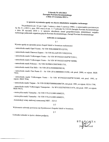 Uchwała Nr 451/2013 Powiatu Krośnieńskiego z dnia 13 września 2013 r. Zarządu w sprawie wyrażenia zgody na zbycie skła dników majątku ruchomego Na podstawie art. 32 ust. 2 pkt. 3 ustawy z dnia 5 czerwca 1998 r. o samorządzie powiatow ym /tj. Dz. U. z 2013 r., poz. 5951 oraz § 6 ust. 1 i 7 uchwały Nr 519/10 Zarządu Pow iatu Kroś nień skiego z dnia 20 stycz nia 2010 r. w sprawie określenia zasad gosp odar owa nia składnikami majątku ruchomego jedn oste k organizacyjnych Pow iatu Krośnieńskiego, Zarząd Powiatu Krośnień skiego uchwala co następuje: §I Wyraża zgodę na sprzedaż przez Zespół Szkół w Iwoniczu ruchomości: - samochodu marki Opel Vect ra - Nr VIN WOL 000087P5122755, - samochodu marki Daew oo Esp ero- Nr VIN KLA JF19 VlV B22 5334 , - samochodu marki Volkswagen Vento - Nr VIN WVW ZZZ 1HZP W75 39 l l, - samochodu marki Volkswagen Vento - Nr VIN WVW ZZZ l HZPW740980, - samochodu marki Polo nez - Nr VIN SUPB O 1CE HTW 83l7 33, - samochodu marki Fiat Stilo - Nr VIN ZF A 192000005903 18, - samochodu marki Fiat Punto II - Nr VIN ZFA18800000135290, rok prod. 2000, nr rejestr. RKR 74GJ, - samochodu marki Volkswagen Vento Nr VIN WVW ZZZ 1HZ PW7 4246 9, rok prod . 1993, nr rejestr. RKR 7F66, - samochodu marki Tarp an-N r VIN SURD7SO OOMA006729, rok prod. 1991, nr rejestr. KUA 1746, - samochodu marki Volkswagen Transporter - Nr WV1 ZZZ 70ZV H13 1474 , rok prod. 1997 , nr rejestr. RKR 94CS, - motocykla marki Yam acha -Nr VIN VTL 21LS001A060233, - motocykla marki Yam acha - Nr VIN VTL 21LS001A060251, - konstrukcji wiaty stalowej oznaczonej NBT - 323 Z. §2 Wykonanie uchwały powierza się Dyrektorowi Zespołu §3 Uchwała wchodzi w życie z dniem podjęcia. Szkół w Iwoniczu.