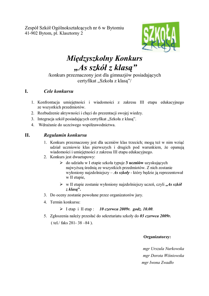 Zespół Szkół Ogólnokształcących nr 6 w Bytomiu 41-902 Bytom, pl. Klasztorny 2 Międzyszkolny Konkurs „As szkół z klasą” /konkurs przeznaczony jest dla gimnazjów posiadających certyfikat „Szkoła z klasą”/ I. Cele konkursu 1. Konfrontacja umiejętności i wiadomości z zakresu III etapu edukacyjnego ze wszystkich przedmiotów. 2. Rozbudzenie aktywności i chęci do prezentacji swojej wiedzy. 3. Integracja szkół posiadających certyfikat „Szkoła z klasą”. 4. Wdrażanie do uczciwego współzawodnictwa. II. Regulamin konkursu 1. Konkurs przeznaczony jest dla uczniów klas trzecich; mogą też w nim wziąć udział uczniowie klas pierwszych i drugich pod warunkiem, że opanują wiadomości i umiejętności z zakresu III etapu edukacyjnego. 2. Konkurs jest dwuetapowy: Ø do udziału w I etapie szkoła typuje 3 uczniów uzyskujących najwyższą średnią ze wszystkich przedmiotów. Z nich zostanie wyłoniony najzdolniejszy – As szkoły - który będzie ją reprezentował w II etapie, Ø w II etapie zostanie wyłoniony najzdolniejszy uczeń, czyli „As szkół z klasą”. 3. Do oceny zostanie powołane przez organizatorów jury. 4. Termin konkursu: Ø I etap i II etap : 10 czerwca 2009r. godz. 10.00. 5. Zgłoszenia należy przesłać do sekretariatu szkoły do 03 czerwca 2009r. ( tel./ faks 281- 38 –84 ). Organizatorzy: mgr Urszula Nurkowska mgr Dorota Wiśniowska mgr Iwona Zwadło