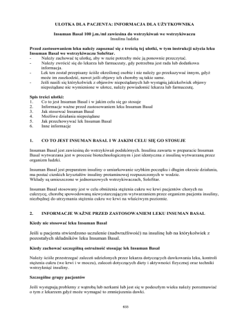 ULOTKA DLA PACJENTA: INFORMACJA DLA UŻYTKOWNIKA Insuman Basal 100 j.m./ml zawiesina do wstrzykiwań we wstrzykiwaczu Insulina ludzka Przed zastosowaniem leku należy zapoznać się z treścią tej ulotki, w tym instrukcji użycia leku Insuman Basal we wstrzykiwaczu SoloStar. Należy zachować tę ulotkę, aby w razie potrzeby móc ją ponownie przeczytać. Należy zwrócić się do lekarza lub farmaceuty, gdy potrzebna jest rada lub dodatkowa informacja. Lek ten został przepisany ściśle określonej osobie i nie należy go przekazywać innym, gdyż może im zaszkodzić, nawet jeśli objawy ich choroby są takie same. Jeśli nasili się którykolwiek z objawów niepożądanych lub wystąpią jakiekolwiek objawy niepożądane nie wymienione w ulotce, należy powiadomić lekarza lub farmaceutę. Spis treści ulotki: 1. Co to jest Insuman Basal i w jakim celu się go stosuje 2. Informacje ważne przed zastosowaniem leku Insuman Basal 3. Jak stosować Insuman Basal 4. Możliwe działania niepożądane 5. Jak przechowywać lek Insuman Basal 6. Inne informacje 1. CO TO JEST INSUMAN BASAL I W JAKIM CELU SIĘ GO STOSUJE Insuman Basal jest zawiesiną do wstrzykiwań podskórnych. Insulina zawarta w preparacie Insuman Basal wytwarzana jest w procesie biotechnologicznym i jest identyczna z insuliną wytwarzaną przez organizm ludzki. Insuman Basal jest preparatem insuliny o umiarkowanie szybkim początku i długim okresie działania, ma postać cienkich kryształów insuliny protaminowej rozpuszczonych w wodzie. Wkłady są umieszczone w jednorazowych wstrzykiwaczach, SoloStar. Insuman Basal stosowany jest w celu obniżenia stężenia cukru we krwi pacjentów chorych na cukrzycę, chorobę spowodowaną niewystarczającym wytwarzaniem przez organizm pacjenta insuliny, niezbędnej do utrzymania stężenia cukru we krwi na właściwym poziomie. 2. INFORMACJE WAŻNE PRZED ZASTOSOWANIEM LEKU INSUMAN BASAL Kiedy nie stosować leku Insuman Basal Jeśli u pacjenta stwierdzono uczulenie (nadwrażliwość) na insulinę lub na którykolwiek z pozostałych składników leku Insuman Basal. Kiedy zachować szczególną ostrożność stosując lek Insuman Basal Należy ściśle przestrzegać zaleceń udzielonych przez lekarza dotyczących dawkowania leku, kontroli stężenia cukru (we krwi i w moczu), zaleceń dotyczących diety i aktywności fizycznej oraz techniki wstrzyknięć insuliny. Szczególne grupy pacjentów Jeśli występują problemy z wątrobą lub nerkami lub jest się w podeszłym wieku należy porozmawiać o tym z lekarzem gdyż może wymagać to zmniejszenia dawki. 633 Podróże Przed udaniem się w podróż należy omówić z lekarzem następujące zagadnienia: dostępność stosowanej insuliny w kraju docelowym, zaopatrzenie w insulinę, strzykawki itd, właściwe przechowywanie insuliny w czasie podróży, czas spożywania posiłków i przyjmowania insuliny w czasie podróży, ewentualne skutki zmiany strefy czasowej, ewentualne nowe czynniki ryzyka dotyczące zdrowia w kraju docelowym, co powinno się zrobić w sytuacjach zagrożenia gdy pacjent źle się poczuje lub zachoruje. Choroby i urazy W następujących przypadkach kontrolowanie cukrzycy powinno być bardzo staranne: - wystąpienie choroby lub poważny uraz mogą stać się przyczyną wzrostu stężenia cukru we krwi (hiperglikemii), - w przypadku spożycia zbyt małej ilości pokarmu stężenie cukru we krwi może się obniżyć (hipoglikemia). Często konieczna jest pomoc lekarza. Pacjent powinien mieć zapewniony szybki kontakt z lekarzem. Pacjenci z cukrzycą typu 1 (cukrzyca insulinozależna) powinni przyjmować dostateczną ilość węglowodanów i kontynuować leczenie insuliną. Osoby opiekujące się pacjentem powinny być poinformowane o konieczności stosowania insuliny przez pacjenta. Stosowanie leku Insuman Basal z innymi lekami Niektóre leki powodują zmiany stężenia cukru we krwi (zmniejszenie, zwiększenie albo jedno i drugie, zależnie od sytuacji). W każdym z takich przypadków konieczna może być zmiana dawki insuliny aby uniknąć zbyt małego lub zbyt dużego stężenia cukru we krwi. Wskazane jest zachowanie ostrożności podczas rozpoczynania stosowania innego leku lub podczas kończenia jego przyjmowania. Należy powiedzieć lekarzowi o wszystkich przyjmowanych ostatnio lekach, również tych, które wydawane są bez recepty. Przed zastosowaniem nowego leku należy ustalić z lekarzem, jaki wpływ może mieć ten lek na stężenie cukru we krwi i jakie, jeśli zajdzie potrzeba, środki zaradcze należy podjąć. Do leków, które mogą powodować zmniejszenie stężenia cukru we krwi (hipoglikemia) należą: - wszystkie inne leki w leczeniu cukrzycy, - inhibitory enzymu konwertazy angiotensyny (ACE) (stosowane w leczeniu niektórych chorób serca lub wysokiego ciśnienia krwi), - dizopyramid (stosowany w leczeniu niektórych chorób serca), - fluoksetyna (stosowana w leczeniu depresji), - fibraty (stosowane do obniżenia podwyższonego poziomu tłuszczów we krwi), - inhibitory monoaminooksydazy (MAO) (stosowane w leczeniu depresji), - pentoksyfilina, propoksyfen, salicylany (takie jak kwas acetylosalicylowy stosowany w łagodzeniu bólu i obniżaniu gorączki), - antybiotyki sulfonamidowe. Do leków, które mogą powodować zwiększenie stężenia cukru we krwi (hiperglikemia) należą: - kortykosteroidy (takie jak kortyzon stosowany w leczeniu stanów zapalnych), - danazol (lek wpływający na owulację), - diazoksyd (stosowany w leczeniu wysokiego ciśnienia krwi), - leki moczopędne (stosowane w leczeniu wysokiego ciśnienia krwi lub nadmiernego zatrzymywania płynów), - glukagon (hormon trzustki stosowany w leczeniu ciężkiej hipoglikemii), 634 - izoniazyd (stosowany w leczeniu gruźlicy), - estrogeny i progestageny (takie jak leki antykoncepcyjne stosowane do kontroli urodzeń), - pochodne fenotiazyny (stosowane w leczeniu zaburzeń psychicznych), - somatropina (hormon wzrostu), - leki sympatykom