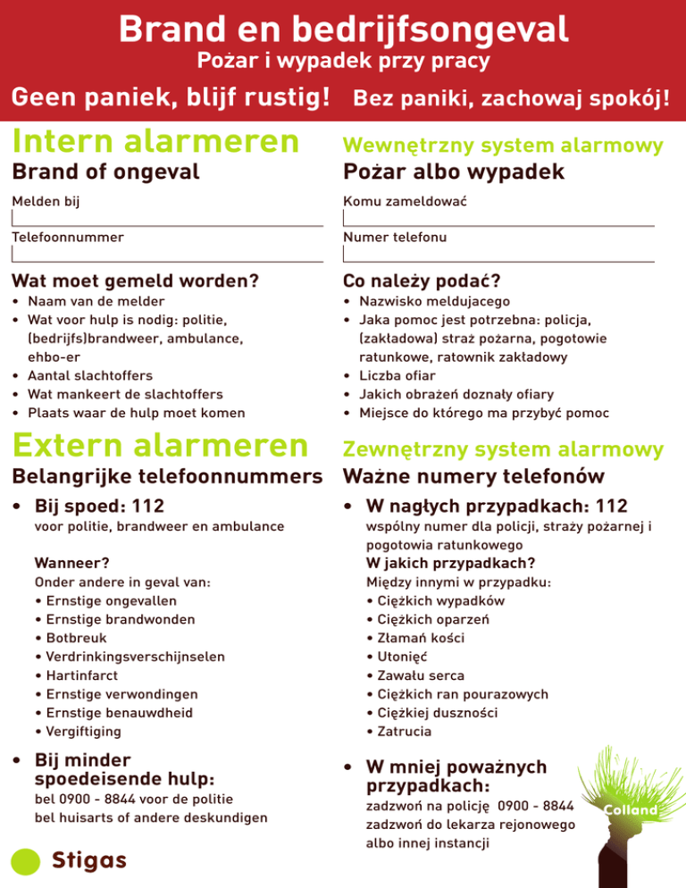 Brand en bedrijfsongeval Pozar i wypadek przy pracy Geen paniek, blijf rustig! Bez paniki, zachowaj spokój! Intern alarmeren e Wewnetrzny system alarmowy Brand of ongeval Pozar albo wypadek Melden bij Komu zameldowac Telefoonnummer Numer telefonu Wat moet gemeld worden? Co nalezy podac? • Naam van de melder • Wat voor hulp is nodig: politie, (bedrijfs)brandweer, ambulance, ehbo-er • Aantal slachtoffers • Wat mankeert de slachtoffers • Plaats waar de hulp moet komen • Nazwisko meldujacego • Jaka pomoc jest potrzebna: policja, (zakladowa) straz pozarna, pogotowie ratunkowe, ratownik zakladowy • Liczba ofiar • Jakich obrazen doznaly ofiary • Miejsce do którego ma przybyc c pomoc Extern alarmeren e Zewnetrzny system alarmowy Belangrijke telefoonnummers Wazne numery telefonów • Bij spoed: 112 • W naglych przypadkach: 112 voor politie, brandweer en ambulance wspólny numer dla policji, strazy pozarnej i pogotowia ratunkowego Wanneer? W jakich przypadkach? Onder andere in geval van: • Ernstige ongevallen • Ernstige brandwonden • Botbreuk • Verdrinkingsverschijnselen • Hartinfarct • Ernstige verwondingen • Ernstige benauwdheid • Vergiftiging e Miedzy innymi w przypadku: e • Ciezkich wypadków e • Ciezkich oparzen n • Zlaman s n kosci es • Utoniec • Zawalu serca e • Ciezkich ran pourazowych e • Ciezkiej dusznosci s • Zatrucia • Bij minder spoedeisende hulp: bel 0900 - 8844 voor de politie bel huisarts of andere deskundigen • W mniej powaznych przypadkach: e 0900 - 8844 zadzwon s na policje zadzwons do lekarza rejonowego albo innej instancji