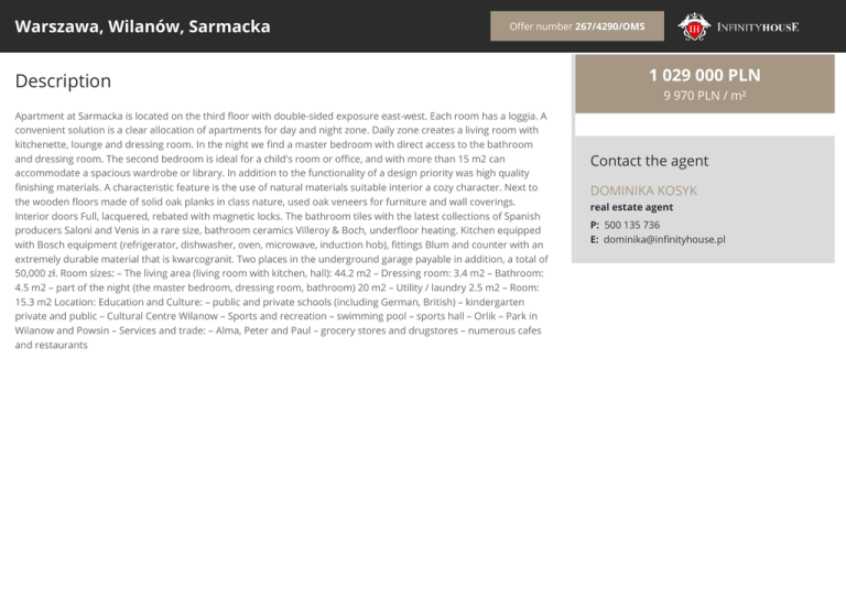 Warszawa, Wilanów, Sarmacka Offer number 267/4290/OMS Description Apartment at Sarmacka is located on the third floor with double-sided exposure east-west. Each room has a loggia. A convenient solution is a clear allocation of apartments for day and night zone. Daily zone creates a living room with kitchenette, lounge and dressing room. In the night we find a master bedroom with direct access to the bathroom and dressing room. The second bedroom is ideal for a child's room or office, and with more than 15 m2 can accommodate a spacious wardrobe or library. In addition to the functionality of a design priority was high quality finishing materials. A characteristic feature is the use of natural materials suitable interior a cozy character. Next to the wooden floors made of solid oak planks in class nature, used oak veneers for furniture and wall coverings. Interior doors Full, lacquered, rebated with magnetic locks. The bathroom tiles with the latest collections of Spanish producers Saloni and Venis in a rare size, bathroom ceramics Villeroy & Boch, underfloor heating. Kitchen equipped with Bosch equipment (refrigerator, dishwasher, oven, microwave, induction hob), fittings Blum and counter with an extremely durable material that is kwarcogranit. Two places in the underground garage payable in addition, a total of 50,000 zł. Room sizes: – The living area (living room with kitchen, hall): 44.2 m2 – Dressing room: 3.4 m2 – Bathroom: 4.5 m2 – part of the night (the master bedroom, dressing room, bathroom) 20 m2 – Utility / laundry 2.5 m2 – Room: 15.3 m2 Location: Education and Culture: – public and private schools (including German, British) – kindergarten private and public – Cultural Centre Wilanow – Sports and recreation – swimming pool – sports hall – Orlik – Park in Wilanow and Powsin – Services and trade: – Alma, Peter and Paul – grocery stores and drugstores – numerous cafes and restaurants 1 029 000 PLN 9 970 PLN / m² Contact the agent DOMINIKA KOSYK real estate agent P: 500 135 736 E: dominika@infinityhouse.pl Warszawa, Wilanów, Sarmacka Gallery Offer number 267/4290/OMS Warszawa, Wilanów, Sarmacka Offer number 267/4290/OMS Warszawa, Wilanów, Sarmacka Offer number 267/4290/OMS Warszawa, Wilanów, Sarmacka Offer number 267/4290/OMS Warszawa, Wilanów, Sarmacka Offer number 267/4290/OMS Warszawa, Wilanów, Sarmacka Offer number 267/4290/OMS Warszawa, Wilanów, Sarmacka Offer number 267/4290/OMS Warszawa, Wilanów, Sarmacka Offer number 267/4290/OMS Warszawa, Wilanów, Sarmacka Offer number 267/4290/OMS Warszawa, Wilanów, Sarmacka Offer number 267/4290/OMS Warszawa, Wilanów, Sarmacka Map Offer number 267/4290/OMS
