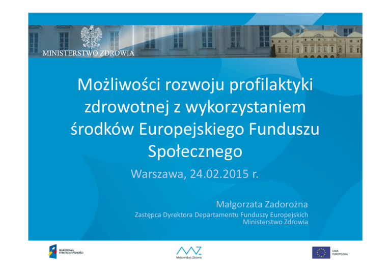 Możliwości rozwoju profilaktyki zdrowotnej z wykorzystaniem środków Europejskiego Funduszu Społecznego Warszawa, 24.02.2015 r. Małgorzata Zadorożna Zastępca Dyrektora Departamentu Funduszy Europejskich Ministerstwo Zdrowia Plan prezentacji • Perspektywa finansowa 2014-2020 – informacje ogólne • Profilaktyka w Programie Operacyjnym Wiedza Edukacja Rozwój • Profilaktyka w Regionalnych Programach Operacyjnych Logika interwencji Zasada koncentracji: na głównych problemach epidemiologicznych powodujących dezaktywizację zawodową na problemie starzejącego się społeczeństwa. Logika interwencji Koordynacja działań regionalnych i krajowych zapewnienie spójności działań wspólne ramy strategiczne: „Policy paper dla ochrony zdrowia na lata 2014-2020 Krajowe Strategiczne Ramy" komplementarność działań (EFS, EFRR, programy krajowe i regionalne) Zasada koncentracji • choroby układu krążenia, • choroby nowotworowe, • choroby psychiczne, • choroby układu kostno-stawowo –mięśniowego, • choroby układu oddechowego. Stan negocjacji • Luty 2015 - Komisja Europejska zaakceptowała wszystkie programy operacyjne na nową perspektywę. • II kwartał 2015 r. – planowane pierwsze konkursy w ramach PO WER Profilaktyka w Programie Wiedza Edukacja Rozwój Typ projektu: Projekty pilotażowe i testujące w zakresie programów profilaktycznych zawierające m.in. komponent badawczy, edukacyjny oraz wspierający współpracę pomiędzy wysokospecjalistycznym ośrodkiem a lekarzami podstawowej opieki zdrowotnej oraz szpitalami ogólnymi, w celu przeciwdziałania zjawisku fragmentacji opieki nad pacjentem Profilaktyka w Programie Wiedza Edukacja Rozwój • Programy pilotażowe muszą zawierać komponent: – badawczy, – edukacyjny, – wspierający współpracę pomiędzy wysokospecjalistycznym ośrodkiem a lekarzami POZ oraz szpitalami ogólnymi - przeciwdziałanie zjawisku fragmentacji opieki nad pacjentem. • W programach profilaktycznych mogą być finansowane procedury i badania medyczne. Profilaktyka w Programie Wiedza Edukacja Rozwój Ogólne informacje: • Ogólnopolski/subregionalny charakter programów • Konieczna współpraca pomiędzy wysokospecjalistycznym ośrodkiem a placówkami POZ • Alokacja: 195 mln zł, • Zasada koncentracji na 5 grupach chorób Profilaktyka w Programie Wiedza Edukacja Rozwój Wskaźniki: • Liczba opracowanych programów profilaktycznych w zakresie chorób negatywnie wpływających na zasoby pracy – 15 • Liczba wdrożonych programów profilaktycznych w zakresie chorób negatywnie wpływających na zasoby pracy - 15 • Liczba osób współpracujących lub pracujących na rzecz placówek podstawowej opieki zdrowotnej, które zostały przeszkolone z zakresu wdrażania innowacyjnych programów profilaktycznych – 12 238 Profilaktyka w Programie Wiedza Edukacja Rozwój Wskaźniki: • Liczba osób, które skorzystały z usługi medycznej w programie profilaktycznym dofinansowanej w ramach EFS – 65 000 • Liczba osób współpracujących lub pracujących na rzecz placówek podstawowej opieki zdrowotnej, które podniosły kwalifikacje z zakresu wdrażania programów profilaktycznych opracowanych ze środków EFS – 10 403 Profilaktyka w Programie Wiedza Edukacja Rozwój W celu zapewnienia wysokiej efektywności projektów testowych i innowacyjnych, ich realizacją (opracowaniem, wdrożeniem, monitoringiem efektów klinicznych i prowadzeniem działań edukacyjnych) powinny zająć się wysokospecjalistyczne jednostki o największym potencjale naukowym: • uczelnie medyczne, • szpitale kliniczne, • instytuty badawcze nadzorowane przez Ministra Zdrowia. Ważnym elementem projektów są działania w zakresie edukacji zdrowotnej Profilaktyka w Programie Wiedza Edukacja Rozwój Programy powinny dotyczyć: – profilaktyki wczesnej – profilaktyki pierwotnej (I fazy) – profilaktyki wtórnej (II fazy) – Wszystkie programy muszą uzyskać pozytywną ocenę AOTM Ministerstwo Zdrowia odpowiadać będzie za ustalenie priorytetowych programów zdrowotnych do realizacji oraz opracowanie ich założeń, natomiast sama realizacja w trybie konkursowym powierzona zostanie wysokospecjalistycznym jednostkom o największym potencjale naukowym. Profilaktyka w Regionalnych Programach Operacyjnych Typy projektów: • wdrożenie projektów profilaktycznych dotyczących chorób będących istotnym problemem zdrowotnym regionu • wdrożenie programów rehabilitacji medycznej ułatwiających powroty do pracy • wdrożenie programów ukierunkowanych na eliminowanie zdrowotnych czynników ryzyka w miejscu pracy • rozwój profilaktyki nowotworowej w kierunku wykrywania raka jelita grubego, szyjki macicy i piersi • wdrożenie programów wczesnego wykrywania wad rozwojowych i rehabilitacji dzieci zagrożonych niepełnosprawnością i niepełnosprawnych Dziękuję za uwagę