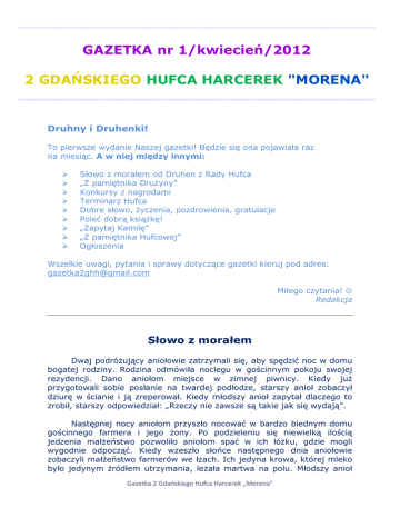 GAZETKA nr 1/kwiecień/2012 2 GDAŃSKIEGO HUFCA HARCEREK "MORENA" Druhny i Druhenki! To pierwsze wydanie Naszej gazetki! Będzie się ona pojawiała raz na miesiąc. A w niej między innymi: Słowo z morałem od Druhen z Rady Hufca „Z pamiętnika Drużyny” Konkursy z nagrodami Terminarz Hufca Dobre słowo, życzenia, pozdrowienia, gratulacje Poleć dobrą książkę! „Zapytaj Kamilę” „Z pamiętnika Hufcowej” Ogłoszenia Wszelkie uwagi, pytania i sprawy dotyczące gazetki kieruj pod adres: [email protected] Miłego czytania! ☺ Redakcja Słowo z morałem Dwaj podróżujący aniołowie zatrzymali się, aby spędzić noc w domu bogatej rodziny. Rodzina odmówiła noclegu w gościnnym pokoju swojej rezydencji. Dano aniołom miejsce w zimnej piwnicy. Kiedy już przygotowali sobie posłanie na twardej podłodze, starszy anioł zobaczył dziurę w ścianie i ją zreperował. Kiedy młodszy anioł zapytał dlaczego to zrobił, starszy odpowiedział: „Rzeczy nie zawsze są takie jak się wydają”. Następnej nocy aniołom przyszło nocować w bardzo biednym domu gościnnego farmera i jego żony. Po podzieleniu się niewielką ilością jedzenia małżeństwo pozwoliło aniołom spać w ich łóżku, gdzie mogli wygodnie odpocząć. Kiedy wzeszło słońce następnego dnia aniołowie zobaczyli małżeństwo farmerów we łzach. Ich jedyna krowa, której mleko było jedynym źródłem utrzymania, leżała martwa na polu. Młodszy anioł Gazetka 2 Gdańskiego Hufca Harcerek „Morena” był wzburzony i zapytał starszego anioła: „Jak mogłeś na to pozwolić!? Pierwszy mężczyzna miał wszystko, a ty mu pomogłeś” - biadolił. „Ta druga rodzina miała mało, ale chętnie podzieliła się wszystkim, a ty pozwoliłeś ich krowie zdechnąć!”. „Rzeczy nie zawsze są takie jak się nam wydają” odpowiedział starszy anioł. „Kiedy byliśmy w piwnicy rezydencji zauważyłem, że w tej dziurze w ścianie schowane było złoto. Jego właściciel był tak obsesyjnie chciwy i niechętny by dzielić się swoją fortuną więc zreperowałem ścianę tak by nie mógł znaleźć schowka. Wtedy, kiedy spaliśmy w łóżku farmera, przyszedł anioł śmierci po jego żonę. Ja dałem mu w zamian krowę. Rzeczy nie zawsze są takie jak się wydają.” Czasami dzieje się dokładnie tak, kiedy rzeczy nie idą po naszej myśli. Tak jest z losem, musisz zaufać, że wszystko co cię spotyka jest zawsze dla Twojego najwyższego dobra. Często możesz się o tym przekonać dopiero po pewnym czasie. pwd. Zofia Rzepiak wędr. Sekretarz Hufca Z pamiętnika 8 GDH Ostatnio miałyśmy okazję do przeniesienia się w rejon pięknej Austrii (na zbiórkach drużyny w tym roku poznajemy wybrane kraje europejskie;)) i dowiedziałyśmy się o niej paru ciekawych rzeczy. Nasza wiedza została wzbogacona również dzięki mieszkańcom Moreny - bez nich nie przyszłoby nam do głowy, że Kopernik był jednym z trzech słynnych austriackich kompozytorów :P Również naszym dziełem jest obecny porządek w harcówce :D A tak poza tym, to zastępowe wraz ze swoimi podopiecznymi wspinają się na kolejne wysokości punktacji hufcowej, na co przeznaczają czas na zbiórkach zastępów. pwd. Kamila Kula wędr. Drużynowa 8 GDH P.S. Mamy cztery nowe kapelusze Gazetka 2 Gdańskiego Hufca Harcerek „Morena” Konkursy z nagrodami ☺ KONKURS NR 1 Ogłaszamy konkurs na nazwę gazetki ! Można zgłaszać swoje propozycję na adres: [email protected] Wystarczy w temacie wiadomości wpisać: „nazwa gazetki”, a w treści propozycję nazwy. Na zwyciężczynię czeka nagroda :-) Nazwa musi być: - związana z Hufcem - jedyna w swoim rodzaju - bardzo pomysłowa Konkurs trwa to końca kwietnia (czyli 30.04 do godziny 20:00) KONKURS NR 2 W każdym wydaniu gazetki pojawiać się będzie jedna z kilku części konkursu, w którym będzie można zdobyć nagrody. Na początek konkurs będzie 3 częściowy, czyli 3 miesięczny. Model postępowania: 1) Rozszyfruj hasło z quizu/rebusu/zagadki zamieszczonej w gazetce 2) Wyślij odpowiedź/rozwiązanie na adres: [email protected] (zanim ukaże się kolejny numer, czyli przed 10 maja). 3) W gazetce nr 2 zamieszczona zostanie lista osób, które odpowiedziały dobrze oraz kolejny rebus/zagadka. 4) W gazetce nr 3 będzie ostatnia część głównego hasła oraz instrukcja jak to trzyczęściowe hasło odszyfrować ;) 5) W czerwcu musisz śledzić stronę Hufca, gdzie zostaną wyłonieni zwycięzcy. Gazetka 2 Gdańskiego Hufca Harcerek „Morena” A oto pierwsze hasełko: Terminarz Hufca na najbliższy miesiąc 13 – 14 kwietnia – Wielki Chorągwiany Turniej Szóstek Zuchowych 14 kwietnia – Warsztaty dla Zastępowych (od godziny 16 do 18 w harcówce) 14 kwietnia – Harcerski Festiwal Filmowy w Gdyni 15 kwietnia – Msza święta na Morenie, w kaplicy o g. 17.00 (po mszy św. – spotkanie dla kadry) 21 kwietnia – Harce Św. Jerzego (obowiązkowe dla wszystkich drużyn harcerek i wędrowniczek) 22 kwietnia – Akcja dla Rady Hufca, w godzinach 11 – 14 25 kwietnia – Rada Hufca, w godzinach 18 – 21 w harcówce 29 kwietnia – Msza św. na Czarnej (obstawia Morena) 11 – 13 maja – WZS Gazetka 2 Gdańskiego Hufca Harcerek „Morena” Dobre słowo ☺ Redakcja bardzo dziękuję Kamili Kula za dział "z pamiętnika" i dh. Hufcowej za terminarz ;) Redakcja przekazuje serdeczne życzenia z gorącej Hiszpanii dla całego Hufca, a w szczególności dla całej Dziewiątki od byłej drużynowej - druhny Magdaleny Różańskiej. Ty również możesz publicznie podziękować, ale także przekazać gratulacje, pozdrowienia oraz życzenia (nie tylko te urodzinowe) i dobre słowo dowolnej osobie z Hufca, a nawet i zastępowi lub drużynie. Wystarczy, że wyślesz treść pod adres: [email protected] (w tytule: dobre słowo). Poleć dobrą książkę! Prześlij na adres gazetki tytuł książki, którą kiedyś lub ostatnio czytałaś i która jest Twoim zdaniem warta pole
