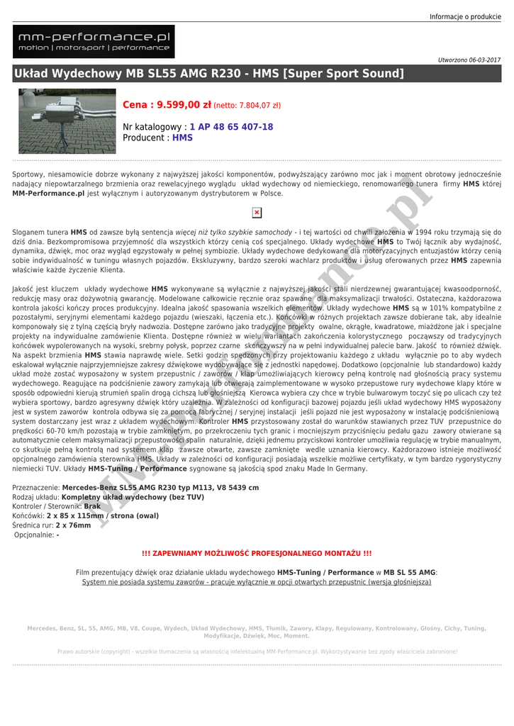 Informacje o produkcie Utworzono 06-03-2017 Układ Wydechowy MB SL55 AMG R230 - HMS [Super Sport Sound] Cena : 9.599,00 zł (netto: 7.804,07 zł) Nr katalogowy : 1 AP 48 65 407-18 Producent : HMS ce .p l Sportowy, niesamowicie dobrze wykonany z najwyższej jakości komponentów, podwyższający zarówno moc jak i moment obrotowy jednocześnie nadający niepowtarzalnego brzmienia oraz rewelacyjnego wyglądu układ wydechowy od niemieckiego, renomowanego tunera firmy HMS której MM-Performance.pl jest wyłącznym i autoryzowanym dystrybutorem w Polsce. an Sloganem tunera HMS od zawsze byłą sentencja więcej niż tylko szybkie samochody - i tej wartości od chwili założenia w 1994 roku trzymają się do dziś dnia. Bezkompromisowa przyjemność dla wszystkich którzy cenią coś specjalnego. Układy wydechowe HMS to Twój łącznik aby wydajność, dynamika, dźwięk, moc oraz wygląd egzystowały w pełnej symbiozie. Układy wydechowe dedykowane dla motoryzacyjnych entuzjastów którzy cenią sobie indywidualność w tuningu własnych pojazdów. Ekskluzywny, bardzo szeroki wachlarz produktów i usług oferowanych przez HMS zapewnia właściwie każde życzenie Klienta. M M -P er fo rm Jakość jest kluczem układy wydechowe HMS wykonywane są wyłącznie z najwyższej jakości stali nierdzewnej gwarantującej kwasoodporność, redukcję masy oraz dożywotnią gwarancję. Modelowane całkowicie ręcznie oraz spawane dla maksymalizacji trwałości. Ostateczna, każdorazowa kontrola jakości kończy proces produkcyjny. Idealna jakość spasowania wszelkich elementów. Układy wydechowe HMS są w 101% kompatybilne z pozostałymi, seryjnymi elementami każdego pojazdu (wieszaki, łączenia etc.). Końcówki w różnych projektach zawsze dobierane tak, aby idealnie komponowały się z tylną częścią bryły nadwozia. Dostępne zarówno jako tradycyjne projekty owalne, okrągłe, kwadratowe, miażdżone jak i specjalne projekty na indywidualne zamówienie Klienta. Dostępne również w wielu wariantach zakończenia kolorystycznego począwszy od tradycyjnych końcówek wypolerowanych na wysoki, srebrny połysk, poprzez czarne skończywszy na w pełni indywidualnej palecie barw. Jakość to również dźwięk. Na aspekt brzmienia HMS stawia naprawdę wiele. Setki godzin spędzonych przy projektowaniu każdego z układu wyłącznie po to aby wydech eskalował wyłącznie najprzyjemniejsze zakresy dźwiękowe wydobywające się z jednostki napędowej. Dodatkowo (opcjonalnie lub standardowo) każdy układ może zostać wyposażony w system przepustnic / zaworów / klap umożliwiających kierowcy pełną kontrolę nad głośnością pracy systemu wydechowego. Reagujące na podciśnienie zawory zamykają lub otwierają zaimplementowane w wysoko przepustowe rury wydechowe klapy które w sposób odpowiedni kierują strumień spalin drogą cichszą lub głośniejszą Kierowca wybiera czy chce w trybie bulwarowym toczyć się po ulicach czy też wybiera sportowy, bardzo agresywny dźwięk który uzależnia. W zależności od konfiguracji bazowej pojazdu jeśli układ wydechowy HMS wyposażony jest w system zaworów kontrola odbywa się za pomocą fabrycznej / seryjnej instalacji jeśli pojazd nie jest wyposażony w instalację podciśnieniową system dostarczany jest wraz z układem wydechowym. Kontroler HMS przystosowany został do warunków stawianych przez TUV przepustnice do prędkości 60-70 km/h pozostają w trybie zamkniętym, po przekroczeniu tych granic i mocniejszym przyciśnięciu pedału gazu zawory otwierane są automatycznie celem maksymalizacji przepustowości spalin naturalnie, dzięki jednemu przyciskowi kontroler umożliwia regulację w trybie manualnym, co skutkuje pełną kontrolą nad systemem klap zawsze otwarte, zawsze zamknięte wedle uznania kierowcy. Każdorazowo istnieje możliwość opcjonalnego zamówienia sterownika HMS. Układy w zależności od konfiguracji posiadają wszelkie możliwe certyfikaty, w tym bardzo rygorystyczny niemiecki TUV. Układy HMS-Tuning / Performance sygnowane są jakością spod znaku Made In Germany. Przeznaczenie: Mercedes-Benz SL55 AMG R230 typ M113, V8 5439 cm Rodzaj układu: Kompletny układ wydechowy (bez TUV) Kontroler / Sterownik: Brak Końcówki: 2 x 85 x 115mm / strona (owal) Średnica rur: 2 x 76mm Opcjonalnie: !!! ZAPEWNIAMY MOŻLIWOŚĆ PROFESJONALNEGO MONTAŻU !!! Film prezentujący dźwięk oraz działanie układu wydechowego HMS-Tuning / Performance w MB SL 55 AMG: System nie posiada systemu zaworów - pracuje wyłącznie w opcji otwartych przepustnic (wersja głośniejsza) Mercedes, Benz, SL, 55, AMG, MB, V8, Coupe, Wydech, Układ Wydechowy, HMS, Tłumik, Zawory, Klapy, Regulowany, Kontrolowany, Głośny, Cichy, Tuning, Modyfikacje, Dźwięk, Moc, Moment. Prawo autorskie (copyright) - wszelkie tłumaczenia są własnością intelektualną MM-Performance.pl. Wykorzystywanie bez zgody właściciela zabronione!