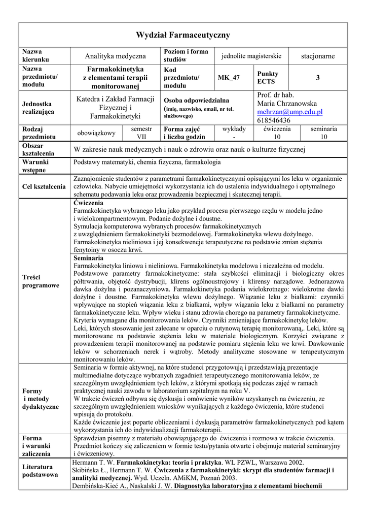 Wydział Farmaceutyczny Nazwa kierunku Nazwa przedmiotu/ modułu Jednostka realizująca Rodzaj przedmiotu Obszar kształcenia Warunki wstępne Cel kształcenia Treści programowe Formy i metody dydaktyczne Forma i warunki zaliczenia Literatura podstawowa Analityka medyczna Poziom i forma studiów Farmakokinetyka z elementami terapii monitorowanej Kod przedmiotu/ modułu Katedra i Zakład Farmacji Fizycznej i Farmakokinetyki obowiązkowy semestr VII jednolite magisterskie MK_47 Osoba odpowiedzialna (imię, nazwisko, email, nr tel. słuŜbowego) Forma zajęć i liczba godzin wykłady - stacjonarne Punkty ECTS 3 Prof. dr hab. Maria Chrzanowska [email protected] 618546436 ćwiczenia 10 seminaria 10 W zakresie nauk medycznych i nauk o zdrowiu oraz nauk o kulturze fizycznej Podstawy matematyki, chemia fizyczna, farmakologia Zaznajomienie studentów z parametrami farmakokinetycznymi opisującymi los leku w organizmie człowieka. Nabycie umiejętności wykorzystania ich do ustalenia indywidualnego i optymalnego schematu podawania leku oraz prowadzenia bezpiecznej i skutecznej terapii. Ćwiczenia Farmakokinetyka wybranego leku jako przykład procesu pierwszego rzędu w modelu jedno i wielokompartmentowym. Podanie doŜylne i doustne. Symulacja komputerowa wybranych procesów farmakokinetycznych z uwzględnieniem farmakokinetyki bezmodelowej. Farmakokinetyka wlewu doŜylnego. Farmakokinetyka nieliniowa i jej konsekwencje terapeutyczne na podstawie zmian stęŜenia fenytoiny w osoczu krwi. Seminaria Farmakokinetyka liniowa i nieliniowa. Farmakokinetyka modelowa i niezaleŜna od modelu. Podstawowe parametry farmakokinetyczne: stała szybkości eliminacji i biologiczny okres półtrwania, objętość dystrybucji, klirens ogólnoustrojowy i klirensy narządowe. Jednorazowa dawka doŜylna i pozanaczyniowa. Farmakokinetyka podania wielokrotnego: wielokrotne dawki doŜylne i doustne. Farmakokinetyka wlewu doŜylnego. Wiązanie leku z białkami: czynniki wpływające na stopień wiązania leku z białkami, wpływ wiązania leku z białkami na parametry farmakokinetyczne leku. Wpływ wieku i stanu zdrowia chorego na parametry farmakokinetyczne. Kryteria wymagane dla monitorowania leków. Czynniki zmieniające farmakokinetykę leków. Leki, których stosowanie jest zalecane w oparciu o rutynową terapię monitorowaną,. Leki, które są monitorowane na podstawie stęŜenia leku w materiale biologicznym. Korzyści związane z prowadzeniem terapii monitorowanej na podstawie pomiaru stęŜenia leku we krwi. Dawkowanie leków w schorzeniach nerek i wątroby. Metody analityczne stosowane w terapeutycznym monitorowaniu leków. Seminaria w formie aktywnej, na które studenci przygotowują i przedstawiają prezentacje multimedialne dotyczące wybranych zagadnień terapeutycznego monitorowania leków, ze szczególnym uwzględnieniem tych leków, z którymi spotkają się podczas zajęć w ramach praktycznej nauki zawodu w laboratorium szpitalnym na roku V. W trakcie ćwiczeń odbywa się dyskusja i omówienie wyników uzyskanych na ćwiczeniu, ze szczególnym uwzględnieniem wniosków wynikających z kaŜdego ćwiczenia, które studenci wpisują do protokołu. KaŜde ćwiczenie jest poparte obliczeniami i dyskusją parametrów farmakokinetycznych pod kątem wykorzystania ich do indywidualizacji farmakoterapii. Sprawdzian pisemny z materiału obowiązującego do ćwiczenia i rozmowa w trakcie ćwiczenia. Przedmiot kończy się zaliczeniem w formie testu/pytania otwarte i obejmuje materiał seminaryjny i ćwiczeniowy. Hermann T. W. Farmakokinetyka: teoria i praktyka. WL PZWL, Warszawa 2002. Skibińska Ł., Hermann T. W. Ćwiczenia z farmakokinetyki: skrypt dla studentów farmacji i analityki medycznej. Wyd. Uczeln. AMiKM, Poznań 2003. Dembińska-Kieć A., Naskalski J. W. Diagnostyka laboratoryjna z elementami biochemii klinicznej. Elsevier Urban&Partner, Wrocław 2010 Literatura uzupełniająca Przedmiotowe efekty kształcenia (symbol) P_W01 P_W02 P_W03 P_W04 P_W05 P_W06 P_W07 Orzechowska-Juzwenko K. (red.) Farmakologia kliniczna: znaczenie w praktyce medycznej. Górnicki Wydawnictwo Medyczne, Wrocław 2006. Efekty kształcenia Odniesienie do kierunkowych efektów kształcenia Odniesienie do obszarowych efektów kształcenia Zna modele farmakokinetyczne Zna podstawowe parametry farmakokinetyczne Zna drogi podania leku Zna farmakokinetykę wielokrotnego podania leku Zna problematykę wiązania leku z białkiem Zna czynniki zmieniające farmakokinetykę leków Zna problematykę terapeutycznego monitorowania leków M2_U01 M2_U02 M2_U05 M2_U06 M2_U07 M2_U08 M2_U01 M2_U02 M2_U05 M2_U06 M2_U07 M2_U08 M2_U01 M2_U02 M2_U05 M2_U06 M2_U07 M2_U08 M2_U01 M2_U02 M2_U05 M2_U06 M2_U07 M2_U08 M2_K01 M2_K02 P_U01 Potrafi obliczać parametry farmakokinetyczne K_U27 P_U02 Potrafi obliczać jak zmienić dawkę leku o farmakokinetyce liniowej i nieliniowej K_U27 P_U03 Potrafi obliczać dawkę leku dla pacjentów z niewydolnością nerek K_U27 P_U04 Potrafi uzyskiwać wiarygodne wyniki monitorowania stęŜenia leków w materiale biologicznym K_U27 P_K01 Rozumie potrzebę uczenia się przez całe Ŝycie, potrafi inspirować i organizować proces uczenia się innych osób K_K01 P_K02 Wykazuje umiejętność i nawyk samokształcenia K_K06 M2_K01 3 x 3h i 1x1h 5 x 2h 10 h 10 h 3 x 3h 1 x 1h 5 x 3h 1 x 5h 9h 1h 15 h 5h 50 h Liczba godzin Liczba ECTS Godziny kontaktowe z nauczycielem akademickim udział w ćwiczeniach * udział w seminariach * Bilans nakładu pracy studenta Samodzielna praca studenta przygotowanie do ćwiczeń * przygotowanie do seminariów * przygotowanie do kolokwiów Łączny nakład pracy studenta Wskaźniki ilościowe Nakład pracy studenta związany z zajęciami wymagającymi bezpośredniego udziału nauczyciela 20 h 1 * Nakład pracy studenta związany z zajęciami o charakterze praktycznym 45 h 2 Metody weryfikacji efektu kształcenia Nr efektu kształcenia P_W01 P_W07 P_U01 P_U04 P_K01 P_K02 Data opracowania programu Fo
