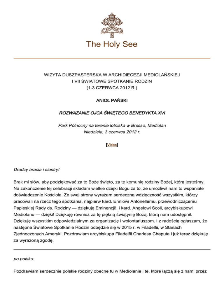 The Holy See WIZYTA DUSZPASTERSKA W ARCHIDIECEZJI MEDIOLAŃSKIEJ I VII ŚWIATOWE SPOTKANIE RODZIN (1-3 CZERWCA 2012 R.) ANIOŁ PAŃSKI ROZWAŻANIE OJCA ŚWIĘTEGO BENEDYKTA XVI Park Północny na terenie lotniska w Bresso, Mediolan Niedziela, 3 czerwca 2012 r. [Video] Drodzy bracia i siostry! Brak mi słów, aby podziękować za to Boże święto, za tę komunię rodziny Bożej, którą jesteśmy. Na zakończenie tej celebracji składam wielkie dzięki Bogu za to, że umożliwił nam to wspaniałe doświadczenie Kościoła. Ze swej strony wyrażam serdeczną wdzięczność wszystkim, którzy pracowali na rzecz tego spotkania, najpierw kard. Enniowi Antonellemu, przewodniczącemu Papieskiej Rady ds. Rodziny — dziękuję Eminencji!, i kard. Angelowi Scoli, arcybiskupowi Mediolanu — dzięki! Dziękuję również za tę piękną świątynię Bożą, którą nam udostępnił. Dziękuję wszystkim odpowiedzialnym za organizację i wolontariuszom. I z radością ogłaszam, że następne Światowe Spotkanie Rodzin odbędzie się w 2015 r. w Filadelfii, w Stanach Zjednoczonych Ameryki. Pozdrawiam arcybiskupa Filadelfii Charlesa Chaputa i już teraz dziękuję za wyrażoną zgodę. po polsku: Pozdrawiam serdecznie polskie rodziny obecne tu w Mediolanie i te, które łączą się z nami przez 2 środki przekazu. Niech podjęte tutaj kwestie: «Rodzina, praca, świętowanie», umocnią was w miłości, wierności i uczciwości małżeńskiej, zachęcą młodych, by pragnęli bardziej «być» aniżeli «mieć», pomogą wszystkim przeżywać niedzielę jako spotkanie z Chrystusem w radości rodzinnego świętowania. Na następne Światowe Spotkanie Rodzin zapraszam was do Filadelfii w Stanach Zjednoczonych — jeśli Bóg pozwoli — za trzy lata. Wasze rodziny zawierzam Maryi, Królowej Rodzin. © Copyright 2012 - Libreria Editrice Vaticana © Copyright - Libreria Editrice Vaticana