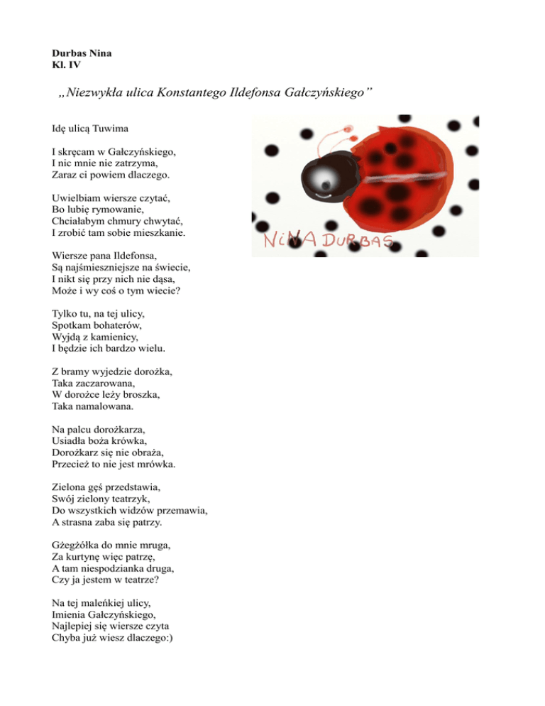 Durbas Nina Kl. IV „Niezwykła ulica Konstantego Ildefonsa Gałczyńskiego” Idę ulicą Tuwima I skręcam w Gałczyńskiego, I nic mnie nie zatrzyma, Zaraz ci powiem dlaczego. Uwielbiam wiersze czytać, Bo lubię rymowanie, Chciałabym chmury chwytać, I zrobić tam sobie mieszkanie. Wiersze pana Ildefonsa, Są najśmieszniejsze na świecie, I nikt się przy nich nie dąsa, Może i wy coś o tym wiecie? Tylko tu, na tej ulicy, Spotkam bohaterów, Wyjdą z kamienicy, I będzie ich bardzo wielu. Z bramy wyjedzie dorożka, Taka zaczarowana, W dorożce leży broszka, Taka namalowana. Na palcu dorożkarza, Usiadła boża krówka, Dorożkarz się nie obraża, Przecież to nie jest mrówka. Zielona gęś przedstawia, Swój zielony teatrzyk, Do wszystkich widzów przemawia, A strasna zaba się patrzy. Gżegżółka do mnie mruga, Za kurtynę więc patrzę, A tam niespodzianka druga, Czy ja jestem w teatrze? Na tej maleńkiej ulicy, Imienia Gałczyńskiego, Najlepiej się wiersze czyta Chyba już wiesz dlaczego:) Inspiracje: 1. Konstanty Ildefons Gałczyński „Zaczarowana dorożka”, 2. Konstanty Ildefons Gałczyński „Satyra na bożą krówkę”, 3. Konstanty Ildefons Gałczyński „Teatrzyk Zielona Gęś”, 4. Konstanty Ildefons Gałczyński „Strasna zaba”, 5. Konstanty Ildefons Gałczyński „Zaręczyny gżegżółki”,