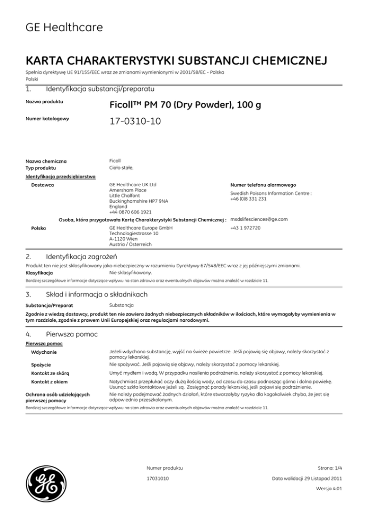 GE Healthcare KARTA CHARAKTERYSTYKI SUBSTANCJI CHEMICZNEJ Spełnia dyrektywę UE 91/155/EEC wraz ze zmianami wymienionymi w 2001/58/EC - Polska Polski 1. Identyfikacja substancji/preparatu Nazwa produktu Ficoll™ PM 70 (Dry Powder), 100 g Numer katalogowy 17-0310-10 Nazwa chemiczna Typ produktu Ficoll Ciało stałe. Identyfikacja przedsiębiorstwa GE Healthcare UK Ltd Amersham Place Little Chalfont Buckinghamshire HP7 9NA England +44 0870 606 1921 Dostawca Numer telefonu alarmowego Swedish Poisons Information Centre : +46 (0)8 331 231 Osoba, która przygotowała Kartę Charakterystyki Substancji Chemicznej : [email protected] GE Healthcare Europe GmbH Technologiestrasse 10 A-1120 Wien Austria / Österreich Polska 2. +43 1 972720 Identyfikacja zagrożeń Produkt ten nie jest sklasyfikowany jako niebezpieczny w rozumieniu Dyrektywy 67/548/EEC wraz z jej późniejszymi zmianami. Nie sklasyfikowany. Klasyfikacja Bardziej szczegółowe informacje dotyczące wpływu na stan zdrowia oraz ewentualnych objawów można znaleźć w rozdziale 11. 3. Skład i informacja o składnikach Substancja/Preparat Substancja Zgodnie z wiedzą dostawcy, produkt ten nie zawiera żadnych niebezpiecznych składników w ilościach, które wymagałyby wymienienia w tym rozdziale, zgodnie z prawem Unii Europejskiej oraz regulacjami narodowymi. 4. Pierwsza pomoc Pierwsza pomoc Wdychanie Jeżeli wdychano substancję, wyjść na świeże powietrze. Jeśli pojawią się objawy, należy skorzystać z pomocy lekarskiej. Spożycie Nie spożywać. Jeśli pojawią się objawy, należy skorzystać z pomocy lekarskiej. Kontakt ze skórą Umyć mydłem i wodą. W przypadku nasilenia podrażnenia, należy skorzystać z pomocy lekarskiej. Kontakt z okiem Natychmiast przepłukać oczy dużą ilością wody, od czasu do czasu podnosząc górna i dolna powiekę. Usunąć szkła kontaktowe jeżeli są. Zasięgnąć porady lekarskiej, jeśli pojawi się podrażnienie. Ochrona osób udzielających pierwszej pomocy Nie należy podejmować żadnych działań, które stwarzałyby ryzyko dla kogokolwiek chyba, że jest się odpowiednio przeszkolonym. Bardziej szczegółowe informacje dotyczące wpływu na stan zdrowia oraz ewentualnych objawów można znaleźć w rozdziale 11. Numer produktu 17031010 Strona: 1/4 Data walidacji 29 Listopad 2011 Wersja 4.01 Ficoll™ PM 70 (Dry Powder), 100 g 5. Postępowanie w przypadku pożaru Środki gaśnicze Odpowiednie Nieodpowiednie Szczególne ryzyko narażenia Specjalne wyposażenie ochronne dla strażaków 6. 17-0310-10 Użyć środka gaśniczego, właściwego dla otaczającego ognia. Nie znane. Brak specyficznego zagrożenia pożarowego lub wybuchowego. Szybko izolować teren przez wyprowadzenie wszystkich osób z najbliższej okolicy wypadku, jeżeli wybuchł pożar. Nie należy podejmować żadnych działań, które stwarzałyby ryzyko dla kogokolwiek chyba, że jest się odpowiednio przeszkolonym. Strażacy powinni nosić odpowiednie urządzenia ochronne oraz indywidualne aparaty oddechowe (SCBA) z maska zakrywającą całą twarz działająca przy dodatnim ciśnieniu. Podstawowy poziom ochrony podczas wypadków chemicznych zapewnia odzież stosowana przez strażaków (włączając hełmy, buty ochronne i rękawice), zgodna z normą europejską EN 469. Postępowanie w przypadku niezamierzonego uwolnienia do środowiska Osobiste środki ostrożności Nie należy podejmować żadnych działań, które stwarzałyby ryzyko dla kogokolwiek chyba, że jest się odpowiednio przeszkolonym. Ewakuować ludzi z okolicznych terenów. Nie udzielać zezwolenia na wejście - niepotrzebnemu i nie zabezpieczonemu personelowi. Nie dotykać, ani nie przechodzić, po rozlanym materiale. Nosić właściwe wyposażenie ochrony osobistej (patrz część 8). Środki ostrożności w zakresie ochrony środowiska Należy unikać rozprzestrzeniania się rozlanego materiału jego spływania do gleby lub kontaktu z glebą, ciekami wodnymi, drenami i kanalizacją. Należy poinformować odpowiednie władze, w przypadku kiedy produkt spowodował zanieczyszczenie środowiska (ścieków, cieków wodnych, gleby lub powietrza). Duże rozlanie Wynieść pojemniki z obszaru rozlania. Zabezpieczyć ujścia kanalizacji, instalacji wodnych oraz wejścia do piwnic i obszarów zamkniętych. Wessać lub zebrać materiał i umieścić w oznakowanym pojemniku. Utylizować w licencjonowanym przedsiębiorstwie utylizacji odpadów. Małe rozlanie Wynieść pojemniki z obszaru rozlania. Wessać lub zebrać materiał i umieścić w oznakowanym pojemniku. Utylizować w licencjonowanym przedsiębiorstwie utylizacji odpadów. 7. Postępowanie z substancją/preparatem i jej/jego magazynowanie Postępowanie z substancją/preparatem Magazynowanie Materiał opakowaniowy Zalecane 8. Nosić właściwe wyposażenie ochrony osobistej (patrz część 8). Należy zabronić spożywania pokarmów i napojów oraz palenia tytoniu w obszarze, w którym ten materiał jest przechowywany, przemieszczany i przetwarzany. Pracownicy powinni umyć ręce i twarz przed jedzeniem, piciem i paleniem tytoniu. Przed wejściem do jadalni zdjąć zanieczyszczoną odzież oraz sprzęt ochronny. Należy przechowywać zgodnie z miejscowymi przepisami. Przechowywać w oryginalnym opakowaniu, zdala od promieni słonecznych; w suchym, chłodnym i dobrze wentylowanym pomieszczeniu; zdala od niezgodnych materiałów (patrz dział 10), napojów i jedzenia. Pojemnik powinien pozostać zamknięty i szczelny aż do czasu użycia. Pojemniki, które zostały otwarte muszą być ponownie uszczelnione i przechowywane w położeniu pionowym aby nie dopuścić do wycieku substancji. Nie przechowywać w nieoznakowanych pojemnikach. Używać odpowiednich pojemników zapobiegających skażeniu środowiska. Stosować oryginalny pojemnik. Kontrola narażenia i środki ochrony indywidualnej Wartości graniczne narażenia Niedostępne. Kontrola narażenia Kontrola narażenia w miejscu pracy Ochrona dr