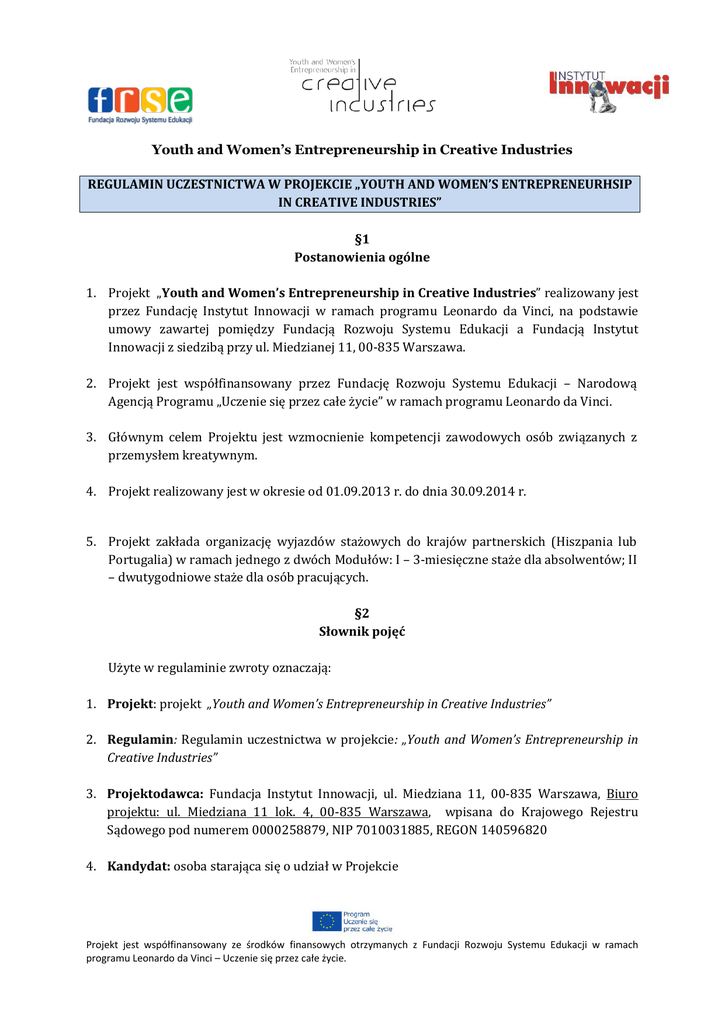 Youth and Women’s Entrepreneurship in Creative Industries REGULAMIN UCZESTNICTWA W PROJEKCIE „YOUTH AND WOMEN’S ENTREPRENEURHSIP IN CREATIVE INDUSTRIES” §1 Postanowienia ogólne 1. Projekt „Youth and Women’s Entrepreneurship in Creative Industries” realizowany jest przez Fundację Instytut Innowacji w ramach programu Leonardo da Vinci, na podstawie umowy zawartej pomiędzy Fundacją Rozwoju Systemu Edukacji a Fundacją Instytut Innowacji z siedzibą przy ul. Miedzianej 11, 00-835 Warszawa. 2. Projekt jest współfinansowany przez Fundację Rozwoju Systemu Edukacji – Narodową Agencją Programu „Uczenie się przez całe życie” w ramach programu Leonardo da Vinci. 3. Głównym celem Projektu jest wzmocnienie kompetencji zawodowych osób związanych z przemysłem kreatywnym. 4. Projekt realizowany jest w okresie od 01.09.2013 r. do dnia 30.09.2014 r. 5. Projekt zakłada organizację wyjazdów stażowych do krajów partnerskich (Hiszpania lub Portugalia) w ramach jednego z dwóch Modułów: I – 3-miesięczne staże dla absolwentów; II – dwutygodniowe staże dla osób pracujących. §2 Słownik pojęć Użyte w regulaminie zwroty oznaczają: 1. Projekt: projekt „Youth and Women’s Entrepreneurship in Creative Industries” 2. Regulamin: Regulamin uczestnictwa w projekcie: „Youth and Women’s Entrepreneurship in Creative Industries” 3. Projektodawca: Fundacja Instytut Innowacji, ul. Miedziana 11, 00-835 Warszawa, Biuro projektu: ul. Miedziana 11 lok. 4, 00-835 Warszawa, wpisana do Krajowego Rejestru Sądowego pod numerem 0000258879, NIP 7010031885, REGON 140596820 4. Kandydat: osoba starająca się o udział w Projekcie Projekt jest współfinansowany ze środków finansowych otrzymanych z Fundacji Rozwoju Systemu Edukacji w ramach programu Leonardo da Vinci – Uczenie się przez całe życie. Youth and Women’s Entrepreneurship in Creative Industries 5. Uczestnik: kandydat, który po spełnieniu wymogów określonych w niniejszym Regulaminie został zakwalifikowany do udziału w Projekcie 6. Koordynator Projektu: osoba zarządzająca Projektem 7. Strona internetowa: www.ii.org.pl §3 Warunki uczestnictwa w Projekcie 1. W projekcie mogą wziąć udział: a) absolwenci uczelni artystycznych do 2 lat od zakończenia studiów (Moduł I); b) kobiety pracujące w firmach i organizacjach przemysłu kreatywnego obejmującego następujące dziedziny: reklama, film i video, architektura, muzyka, rynek sztuki i antyków, sztuki performatywne, gry komputerowe, rynek wydawniczy, rzemiosło, oprogramowanie, wzornictwo, radio i telewizja oraz projektowanie mody (Moduł II). 2. Projekt skierowany jest do Kandydatów w wieku do 30 lat (Moduł I) i do 35 lat (Moduł II). 3. Spośród Kandydatów spełniających powyższe wymagania zostanie wybranych grupa 35 Uczestników (Moduł I – 15, Moduł II – 20). 4. Warunkiem uczestnictwa w Projekcie, po spełnieniu warunków określonych w § 3 ust. 1 i 2 Regulaminu jest wypełnienie i dostarczenie do biura Projektu, którego adres podany jest w §2 ust 3, następujących dokumentów: a) aplikacji – patrz § 4 ust. 2; b) oświadczenia Uczestnika Projektu o wyrażeniu zgody na przetwarzanie danych osobowych (wg wzoru stanowiącego załącznik nr 1 do Regulaminu); c) deklaracji uczestnictwa w Projekcie (wg wzoru stanowiącego załącznik nr 2 do Regulaminu); Wypełnione załączniki wymienione w §3 pkt. 4 należy dostarczyć w formie oryginałów osobiście lub drogą pocztową na adres biura projektu w czasie trwania rekrutacji. §4 Rekrutacja 1. W ramach projektu odbędzie się rekrutacja prowadzona przez Komisję, w skład której wchodzą koordynator projektu oraz specjaliści z organizacji wysyłającej i instytucji partnerskich. Projekt jest współfinansowany ze środków finansowych otrzymanych z Fundacji Rozwoju Systemu Edukacji w ramach programu Leonardo da Vinci – Uczenie się przez całe życie. Youth and Women’s Entrepreneurship in Creative Industries 2. Warunkiem uczestnictwa w procesie rekrutacji jest złożenie aplikacji, która składa się z następujących dokumentów: Moduł I a) kopia dyplomu ukończenia uczelni artystycznej (nie dłużej niż 2 lata temu); b) kopia dokumentu tożsamości; c) zaświadczenie o znajomości języka angielskiego min. na poziomie B2 (certyfikat Cambridge, kopia ukończenie studiów językowych); d) dokumenty potwierdzające znajomość języka hiszpańskiego/portugalskiego będą dodatkowym atutem; e) Curriculum Vitae (według wzoru Europass); f) portfolio zawierające dotychczasowe prace i projekty. Moduł II a) kopia dokumentu tożsamości; b) zaświadczenie o znajomości języka angielskiego min. na poziomie B2 (certyfikat Cambridge, kopia ukończenie studiów językowych); c) dokumenty potwierdzające znajomość języka hiszpańskiego/portugalskiego będą dodatkowym atutem; d) Curriculum Vitae (według wzoru Europass); e) portfolio zawierające dotychczasowe prace i projekty; f) biznesplan przedstawiający pomysł na produkt/usługę/własną działalność możliwą do wdrożenia po zakończeniu stażu. 3. Proces rekrutacji składać się będzie z następujących etapów: a) dostarczenie do biura Projektu dokumentów, o których mowa w §3 pkt. 4, zgodnie z terminem rekrutacji ogłoszonym na stronie internetowej Projektu; b) weryfikacja kryteriów formalnych; c) wyłonienie grupy kandydatów, którzy przejdą do II etapu rekrutacji; d) II etap (dla obu Modułów) – rozmowy kwalifikacyjne; e) wyłonienie finałowej grupy Uczestników (Moduł I: 15 osób, Moduł II: 20 osób). 4. Nabór Uczestników jest otwarty dla wszystkich zainteresowanych spełniających warunki określone w §3 ust 1 i 2. 5. Odmowa podania danych osobowych oraz brak zgody na ich przetwarzanie są równoznaczne z brakiem możliwości udzielania wsparcia w ramach Projektu. 6. Przyjmowane będą jedynie kompletne aplikacje, opatrzone datą i podpisem Kandydata. 7. Złożone dokumenty zgłoszeniowe