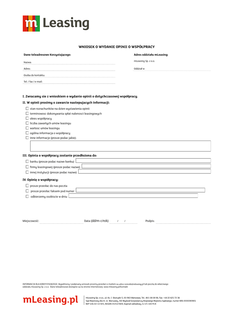 WNIOSEK O WYDANIE OPINII O WSPÓŁPRACY Dane teleadresowe Korzystającego: Adres oddziału mLeasing: Nazwa: mLeasing Sp. z o.o. Adres: Oddział w Osoba do kontaktu: Tel. / fax / e-mail: I. Zwracamy sie z wnioskiem o wydanie opinii o dotychczasowej współpracy. II. W opinii prosimy o zawarcie nastepujacych informacji: stan rozrachunków na dzien wystawienia opinii terminowosc dokonywania spłat nalenosci leasingowych okres współpracy liczba zawartych umów leasingu wartosc umów leasingu ogólna informacja o współpracy inne informacje (prosze podac jakie): III. Opinia o współpracy zostanie przedłożona do: banku (prosze podac nazwe banku) firmy leasingowej (prosze podac nazwe) innej instytucji (prosze podac nazwe) IV. Opinię o współpracy: prosze przesłac do nas poczta prosze przesłac faksem pod numer odbierzemy osobiscie w dniu Miejscowość: Data (dd/m-c/rok) / / Podpis: INFORMACJA DLA KORZYSTAJĄCEGO. Wypełniony i podpisany wniosek prosimy przesłać e-mailem na adres [email protected] lub pocztą do właściwego oddziału mLeasing Sp. z o.o. Dane teleadresowe dostępne są na stronie internetowej: www.mleasing.pl/kontakt