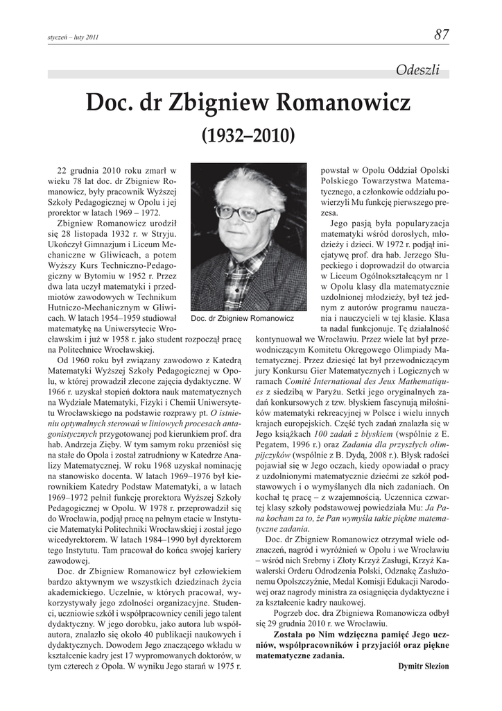 D. Slezion, Odeszli Doc. dr Zbigniew Romanowicz 1932