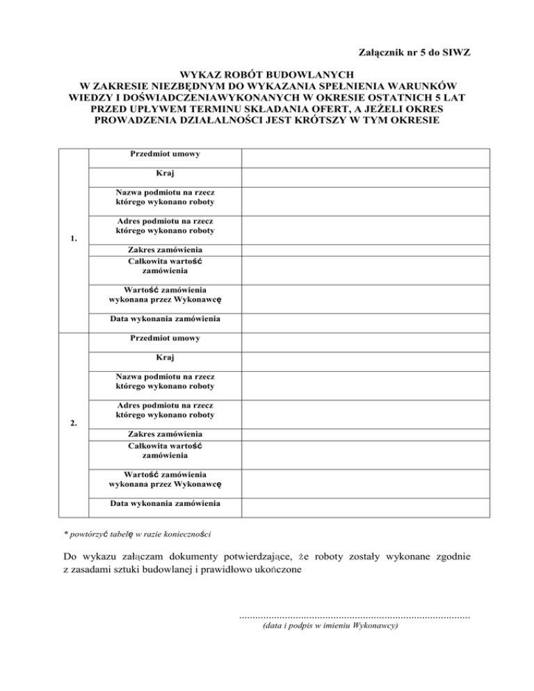 Załącznik nr 5 do SIWZ WYKAZ ROBÓT BUDOWLANYCH W ZAKRESIE NIEZBĘDNYM DO WYKAZANIA SPEŁNIENIA WARUNKÓW WIEDZY I DOŚWIADCZENIAWYKONANYCH W OKRESIE OSTATNICH 5 LAT PRZED UPŁYWEM TERMINU SKŁADANIA OFERT, A JEśELI OKRES PROWADZENIA DZIAŁALNOŚCI JEST KRÓTSZY W TYM OKRESIE Przedmiot umowy Kraj Nazwa podmiotu na rzecz którego wykonano roboty Adres podmiotu na rzecz którego wykonano roboty 1. Zakres zamówienia Całkowita wartość zamówienia Wartość zamówienia wykonana przez Wykonawcę Data wykonania zamówienia Przedmiot umowy Kraj Nazwa podmiotu na rzecz którego wykonano roboty Adres podmiotu na rzecz którego wykonano roboty 2. Zakres zamówienia Całkowita wartość zamówienia Wartość zamówienia wykonana przez Wykonawcę Data wykonania zamówienia * powtórzyć tabelę w razie konieczności Do wykazu załączam dokumenty potwierdzające, że roboty zostały wykonane zgodnie z zasadami sztuki budowlanej i prawidłowo ukończone ...................................................................................... (data i podpis w imieniu Wykonawcy)