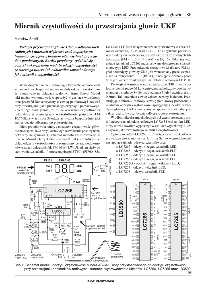 Miernik czêstotliwoci do przestrajania g³owic UKF Miernik czêstotliwoci do przestrajania g³owic UKF Miros³aw Sokó³ Podczas przestrajania g³owic UKF w odbiornikach radiowych i tunerach wiêkszoæ osób napotyka na trudnoci zwi¹zane z brakiem odpowiednich przyrz¹dów pomiarowych. Bardzo przydatny wyda³ mi siê pomys³ wykorzystania modu³u odczytu czêstotliwoci ze starszego tunera lub odbiornika samochodowego jako miernika czêstotliwoci. ¯arzenie ~ 2.2V Do uk³adu LC7266 do³¹czono rezonator kwarcowy o czêstotliwoci wzorcowej 7.2MHz (n.19 i 20). Dla uzyskania prawid³owych odczytów wybiera siê czêstotliwoæ zastosowanych filtrów p.cz. (FM - n.12 ÷ 14 i AM - n.15, 16). Odmian¹ tego uk³adu jest uk³ad LC7265 przystosowany do sterowania wskaników typu LED. Przy odczycie czêstotliwoci dla toru FM sygna³ heterodyny g³owicy UKF jest wzmacniany przez wzmacniacz na tranzystorze T101 (BF314), a nastêpnie dzielony przez 8, w preskalerze zbudowanym na uk³adzie scalonym LB3500. Do wejcia wzmacniacza na tranzystorze T101 mo¿na doW niektórych tunerach, radiomagnetofonach i odbiornikach ³¹czyæ cienki przewód koncentryczny zakoñczony cewk¹ posamochodowych spotkaæ mo¿na modu³y odczytu czêstotliwowietrzn¹ o rednicy 8÷10mm, z³o¿on¹ z 3 lub 4 zwojów drutu ci zbudowane na uk³adach scalonych firmy Sanyo. Modu³ 0.8mm. Tak nawiniêt¹ cewkê zabezpieczamy lakierem. Przetaki mo¿na wymontowaæ, wyposa¿yæ w zasilacz wtyczkowy strajaj¹c odbiornik radiowy, cewkê pomiarow¹ po³¹czon¹ z oraz przewód koncentryczny z cewk¹ pomiarow¹ i u¿ywaæ modu³em odczytu czêstotliwoci sprzêgamy z cewk¹ heteroprzy przestrajaniu jako przenonego przyrz¹du pomiarowego. dyny g³owicy UKF i mierzymy w sposób bezporedni jaki Zalet¹ tego rozwi¹zania jest to, ¿e wskazania czêstotliwoci zakres czêstotliwoci bêdzie odbierany po przestrojeniu. heterodyny s¹ pomniejszane o czêstotliwoæ poredniej FM W odbiornikach samochodowych by³ czêsto stosowany mo10.7MHz i w ten sposób odczytaæ mo¿na bezporednio jaki du³ odczytu na uk³adzie scalonym LC7265 i wskaniku LED, zakres bêdzie odbierany po przestrojeniu. który mo¿na równie¿ wyposa¿yæ w zasilacz wtyczkowy +12V Diora produkowa³a tunery z odczytem czêstotliwoci g³ówi u¿ywaæ jako przenonego miernika czêstotliwoci. nie na eksport. Jako przyk³ad takiego rozwi¹zania pos³u¿y nam, Oprócz uk³adów LC7265 i LC7266, których rozk³ad wypokazany na rysunku 1, schemat modu³u zastosowanego w prowadzeñ pokazano na rys.1, firma Sanyo wyprodukowa³a tunerze AS-641 Diory. Uk³ad scalony IC101 (LC7266) jest to nastêpuj¹ce uk³ady odczytu czêstotliwoci: uk³ad odczytu czêstotliwoci przeznaczony do radioodbiorni• LC7267 - odczyt + zegar, wskanik LED, ków o trzech zakresach fal: FM, MW i LW. Uk³ad ten s³u¿y do • LC7268 - odczyt + zegar, wskanik FLT, sterowania wskanika fluorescencyjnego FT101 (FIP6A 85). • LC7250 - odczyt + zegar, wskanik LED, • LC7253 - odczyt + zegar, wskanik FLT, FT101 FIP6A 85 • LC7253G - odczyt + zegar, wskanik LED, 3 FM MHz FIP6A85 • LC7257 - odczyt, wskanik LED, R101 - wska¿nik 10R AM kHz • LC7258 - odczyt, wskanik FLT. fluorescencyjny L108 40mH Zasilanie +15V - FM C102 C109 10p 10p GND 6 C104 C105 C106 4n7 10n 10n R106 3k R107 1M LB3500 - dzielnik czêstotliwoœci 1/8 5 Oscylator AM 40 f b 3 40 f b&c 4 39 a b&c 4 39 a g 5 38 b g 5 38 b MHz 6 37 g MHz 6 37 g kHz 7 36 c kHz 7 36 c Vss 8 35 d FMI 9 AMI 10 Przewód koncentryczny 34 e FMI 8 AMI 9 35 Vss 34 d 33 f TEST 10 32 a FIF 1 11 31 b FIF 2 12 30 g FIF 3 13 FIF 3 14 29 c AIF 1 14 29 g AIF 1 15 28 d AIF 2 15 28 c AIF 2 16 27 e HLD 16 27 d HLD 17 26 f BLK 17 26 e BLK 18 25 a Xin 18 25 f Xout 19 24 a TEST 11 FIF 1 12 Xin 19 Cewka pomiarowa cyfra 5 3 FIF 2 13 R108 100R C110 100p 6 NC 8 OUT 9 T101 BF314 4 Oscylator FM C111 4n7 41 e b 24 b&c cyfra 3 5 INH 7 R109 220R 2 Zasilanie +15V - AM NC 3 SUB 5 9 42 d 33 e 32 f 31 a 30 b cyfra 2 D102 4,55V BAYP94 1k IN+ 2 IN- 4 1 g 2 cyfra 1 510R 4 X101 7,2MHz c 41 e LC7265 LB3500 2 10 19 C107 4n7 IC102 6 D101 R103 BZP683 820R 1 7 5V6 R104 R105 C102 D103 0.22µ BAYP94 1 9 LC7266 - odczyt czêstotliwoœci 42 d cyfra 3 C103 0.22µ LC7266 1 g 2 c Vcc 1 cyfra 2 22 18 17 15 8 16 14 13 2012 cyfra 5 21 cyfra 4 cyfra 1 L107 40mH 5,6V cyfra 4 11,7V LC7266 R102 27k IC101 LB3500 C101 - 0.22µ R110 47k Xout 20 23 50Hz A/F 20 23 b&c A/F 21 22 Vdd Vdd 21 22 50Hz Rys.1. Schemat modu³u odczytu czêstotliwoœci tunera AS-641 Diory przystosowanego do odczytu czêstotliwoœci przy przestrajaniu odbiorników radiowych i tunerów; wyprowadzenia uk³adów LC7266, LC7265 oraz LB3500. } SERWIS ELEKTRONIKI