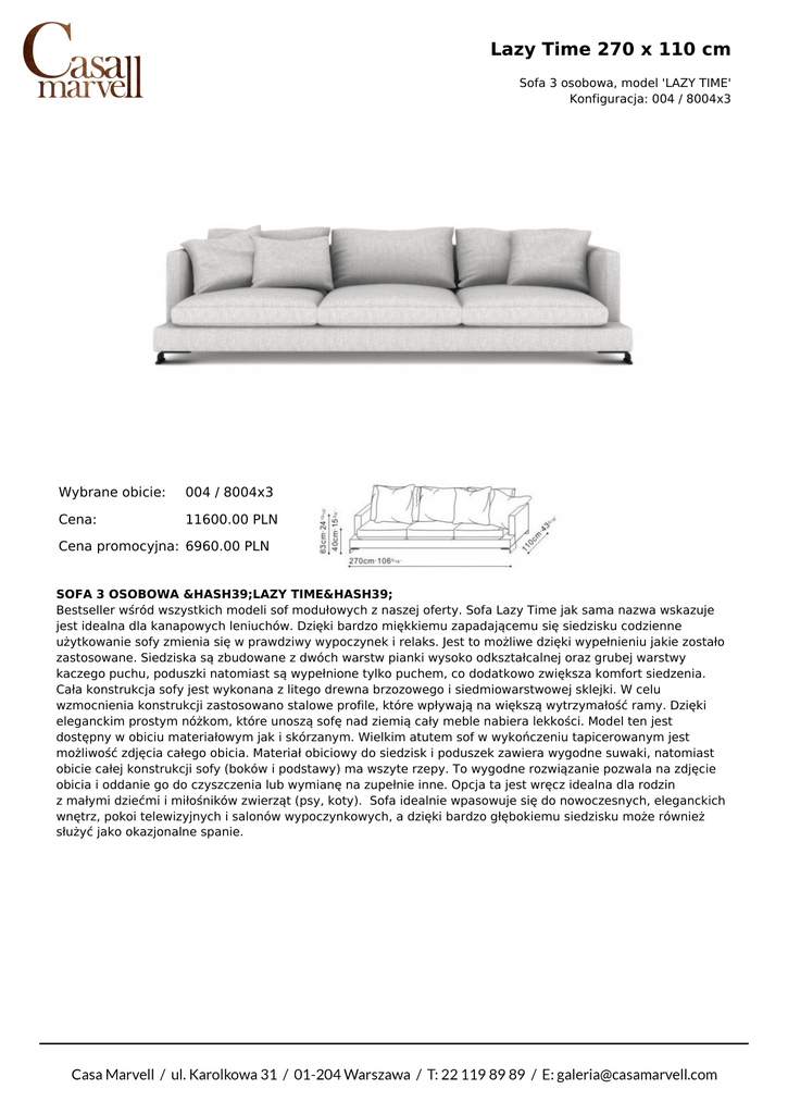 Lazy Time 270 x 110 cm Sofa 3 osobowa, model 'LAZY TIME' Konfiguracja: 004 / 8004x3 Wybrane obicie: 004 / 8004x3 Cena: 11600.00 PLN Cena promocyjna: 6960.00 PLN SOFA 3 OSOBOWA &HASH39;LAZY TIME&HASH39; Bestseller wśród wszystkich modeli sof modułowych z naszej oferty. Sofa Lazy Time jak sama nazwa wskazuje jest idealna dla kanapowych leniuchów. Dzięki bardzo miękkiemu zapadającemu się siedzisku codzienne użytkowanie sofy zmienia się w prawdziwy wypoczynek i relaks. Jest to możliwe dzięki wypełnieniu jakie zostało zastosowane. Siedziska są zbudowane z dwóch warstw pianki wysoko odkształcalnej oraz grubej warstwy kaczego puchu, poduszki natomiast są wypełnione tylko puchem, co dodatkowo zwiększa komfort siedzenia. Cała konstrukcja sofy jest wykonana z litego drewna brzozowego i siedmiowarstwowej sklejki. W celu wzmocnienia konstrukcji zastosowano stalowe profile, które wpływają na większą wytrzymałość ramy. Dzięki eleganckim prostym nóżkom, które unoszą sofę nad ziemią cały meble nabiera lekkości. Model ten jest dostępny w obiciu materiałowym jak i skórzanym. Wielkim atutem sof w wykończeniu tapicerowanym jest możliwość zdjęcia całego obicia. Materiał obiciowy do siedzisk i poduszek zawiera wygodne suwaki, natomiast obicie całej konstrukcji sofy (boków i podstawy) ma wszyte rzepy. To wygodne rozwiązanie pozwala na zdjęcie obicia i oddanie go do czyszczenia lub wymianę na zupełnie inne. Opcja ta jest wręcz idealna dla rodzin z małymi dziećmi i miłośników zwierząt (psy, koty). Sofa idealnie wpasowuje się do nowoczesnych, eleganckich wnętrz, pokoi telewizyjnych i salonów wypoczynkowych, a dzięki bardzo głębokiemu siedzisku może również służyć jako okazjonalne spanie.