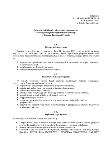 Załącznik do Uchwały Nr XVIII/98/16 Rady Gminy Turek z dnia 22 lutego 2016 r. Program opieki nad zwierzętami bezdomnymi oraz zapobiegania bezdomności zwierząt w Gminie Turek na 2016 rok. § 1. Główne cele programu Zgodnie z art. 11a ust. 1 ustawy z dnia 21 sierpnia 1997 r. o ochronie zwierząt (t.j. Dz. U. z 2013 poz. 856 ze zm.) Gmina Turek wprowadza program opieki nad zwierzętami bezdomnymi oraz zapobiegania bezdomności zwierząt, którego głównymi celami są: 1. zapewnienie opieki nad zwierzętami bezdomnymi w rozumieniu art. 4 pkt. 16 ustawy o ochronie zwierząt, 2. zapobieganie bezdomności zwierząt, 3. zmniejszanie populacji bezdomnych zwierząt. § 2. Zadania w ramach programu W ramach programu Gmina Turek realizuje następujące zadania, wynikające z art. 11a ust. 2 ustawy o ochronie zwierząt: 1. zapewnienie bezdomnym zwierzętom miejsca w schronisku, 2. opieka nad wolno żyjącymi kotami, w tym ich dokarmianie, 3. odławianie bezdomnych zwierząt, 4. obligatoryjną sterylizację albo kastrację zwierząt w schronisku dla zwierząt, 5. poszukiwanie właścicieli dla bezdomnych zwierząt, 6. usypianie ślepych miotów, 7. wskazanie gospodarstwa rolnego w celu zapewnienie miejsca dla zwierząt gospodarskich, 8. zapewnienie całodobowej opieki weterynaryjnej w przypadkach zdarzeń drogowych z udziałem zwierząt. § 3. Wykonawcy programu Realizację zadań w ramach programu prowadzą: 1. Urząd Gminy Turek w zakresie koordynatora zadań realizowanych w ramach projektu poprzez Referat Inwestycji, Gospodarki Komunalnej i Rozwoju Lokalnego. 2. Sołectwa reprezentowane przez sołtysów właściwych sołectw. 3. Schronisko dla zwierząt w Wojtyszkach, którego właścicielem jest Pan Longin Siemiński HOTEL DLA ZWIERZĄT I PTACTWA DOMOWEGO GABINET 4. 5. 6. 7. WETERYNARYJNY, SCHRONISKO, CENTRUM REHABILITACYJNOSZKOLENIOWO-ADOPCYJNE, ul. Kosodrzewiny 56 lok. 2 , 92-411 Łódź - zwane w dalszej części „Schroniskiem”. Organizacje społeczne, stowarzyszenia, fundacje, których statutowym celem działania jest przeciwdziałanie bezdomności zwierząt we współpracy z organami gminy. Jednostki wymienione w ust. 1 i 2 współpracują w swym zakresie z Powiatową Inspekcją Weterynaryjną. Wskazane gospodarstwo rolne Pana Mariusza Przygońskiego znajdujące się w miejscowości Słodków Kolonia 29 , 62-700 Turek na podstawie umowy zawartej z właścicielem gospodarstwa w momencie zaistnienia okoliczności wymagających interwencji. Całodobowa opieka weterynaryjna w przypadkach zdarzeń drogowych z udziałem zwierząt na terenie wyznaczonym administracyjnymi granicami Gminy Turek, realizowana poprzez: GABINET WETERYNARYJNY ul. Kosodrzewiny 56 lok. 2, 92-411 Łódź. § 4. Zapewnienie bezdomnym zwierzętom miejsca w schronisku dla zwierząt 1. Schronisko przyjmuje i zapewnia opiekę bezdomnym zwierzętom domowym z terenu gminy Turek, na podstawie zawartej umowy. 2. Szczegółowy sposób postępowania ze zwierzętami w Schronisku określa Regulamin Schroniska. § 5. Opieka nad wolno żyjącymi kotami Opiekę nad wolno żyjącymi kotami, w tym ich dokarmianie, organizowane będzie przez Urząd Gminy Turek w przypadku wystąpienia takiej potrzeby, na terenie wyznaczonym administracyjnymi granicami Gminy Turek. § 6. Odławianie bezdomnych zwierząt 1. Odławianiu podlegają zwierzęta domowe i gospodarskie, które uciekły, zabłąkały się bądź zostały porzucone przez człowieka, a nie jest możliwe ustalenie właściciela lub innej osoby, pod której opieką zwierzę dotąd pozostawało. 2. Bezdomne zwierzęta z terenu gminy Turek podlegają stałemu odławianiu – zgłoszenia od mieszkańców dotyczące bezdomnych zwierząt przyjmuje pracownik Urzędu Gminy Turek. 3. Odławianie zwierząt bezdomnych może być prowadzone wyłącznie za pomocą specjalistycznego sprzętu, który nie będzie stwarzał zagrożenia dla życia i zdrowia wyłapanych zwierząt, a także nie będzie zadawał im cierpienia. 4. Odłowione zwierzęta domowe podlegają przewiezieniu do Schroniska. 5. Odłowione zwierzęta gospodarskie podlegają przewiezieniu do gospodarstwa rolnego wskazanego przez Gminę. § 7. Sterylizacja / kastracja zwierząt w schronisku 1. Gmina realizuje obligatoryjną sterylizację/kastrację zwierząt umieszczonych w Schronisku zgodnie z Regulaminem Schroniska. bezdomnych 2. Zabiegom, o których mowa w ust. 1, nie podlegają: a) zwierzęta w okresie 14 dni od umieszczenia ich w Schronisku z uwagi na możliwość zgłoszenia się właściciela lub opiekuna; b) zwierzęta, u których z uwagi na stan zdrowia lub wiek istnieją przeciwwskazania do wykonania tych zabiegów. § 8. Poszukiwanie właścicieli dla bezdomnych zwierząt 1. Poszukiwaniem właścicieli dla bezdomnych zwierząt zajmuje się Schronisko. 2. Akcje adopcyjne każdorazowo wspierać będzie Urząd Gminy Turek poprzez informowanie o możliwości adopcji w sposób zwyczajowo przyjęty na terenie Gminy Turek, w tym na stronach internetowych, w lokalnej prasie, poprzez kurendy i ogłoszenia. § 9. Usypianie ślepych miotów 1. Usypianie ślepych miotów bezdomnych zwierząt wykonywane jest w Schronisku, zgodnie z jego regulaminem. 2. Zabiegi usypiania ślepych miotów wykonuje lekarz weterynarii zatrudniony w Schronisku. §10. Zapewnienie miejsca dla zwierząt gospodarskich we wskazanym gospodarstwie rolnym 1. Wskazanie gospodarstwa rolnego w celu zapewnienia miejsc dla bezdomnych zwierząt gospodarskich następuje na podstawie umowy zawartej przez Gminę Turek z właścicielem gospodarstwa zgodnie z § 3 pkt. 6 w momencie zaistnienia okoliczności wymagającej interwencji. 2. Zakres umowy może określać gotowość zapewnienia opieki bezdomnym zwierzętom gospodarskim lub dotyczyć indywidualnych przypadków przekazania zwierząt. 3. W przypadku zwierząt traktowanych w sposób określony w art. 6 ust. 2 ustawy o ochronie zwierząt, decyzja o umieszczeniu zwierzęcia gospodarskiego we wskazanym gospodarstwie o