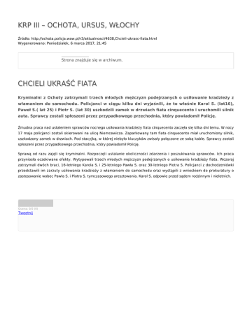 KRP III – OCHOTA, URSUS, WŁOCHY Źródło: http://ochota.policja.waw.pl/r3/aktualnosci/4638,Chcieli-ukrasc-fiata.html Wygenerowano: Poniedziałek, 6 marca 2017, 21:45 Strona znajduje się w archiwum. CHCIELI UKRAŚĆ FIATA Kryminalni z Ochoty zatrzymali trzech młodych mężczyzn podejrzanych o usiłowanie kradzieży z włamaniem do samochodu. Policjanci w ciągu kilku dni wyjaśnili, że to właśnie Karol S. (lat16), Paweł S.( lat 25) i Piotr S. (lat 30) uszkodzili zamek w drzwiach fiata cinquecento i uruchomili silnik auta. Sprawcy zostali spłoszeni przez przypadkowego przechodnia, który powiadomił Policję. Żmudna praca nad ustaleniem sprawców nocnego usiłowania kradzieży fiata cinquecento zaczęła się kilka dni temu. W nocy 17 maja policjanci zostali skierowani na ulicę Niemcewicza. Zaparkowany tam fiata cinquecento miał uruchomiony silnik, uszkodzony zamek w drzwiach. Pod stacyjką, w której niebyło kluczyków zwisały połączone ze sobą kable. Sprawcy zostali spłoszeni przez przypadkowego przechodnia, który powiadomił Policję. Sprawą od razu zajęli się kryminalni. Rozpoczęli ustalanie okoliczności zdarzenia i poszukiwania sprawców. Ich praca przyniosła oczekiwane efekty. Wytypowali trzech młodych mężczyzn podejrzanych o usiłowanie kradzieży fiata. Wczoraj zatrzymali dwóch braci, 16-letniego Karola S. i 25-letniego Pawła S. oraz 30-letniego Piotra S. Policjanci z dochodzeniówki przedstawili im zarzuty usiłowania kradzieży z włamaniem do samochodu oraz wystąpili z wnioskiem do prokuratury o zastosowanie wobec Pawła S. i Piotra S. tymczasowego aresztowania. Karol S. odpowie przed sądem rodzinnym i nieletnich. Ocena: 0/5 (0) Tweetnij