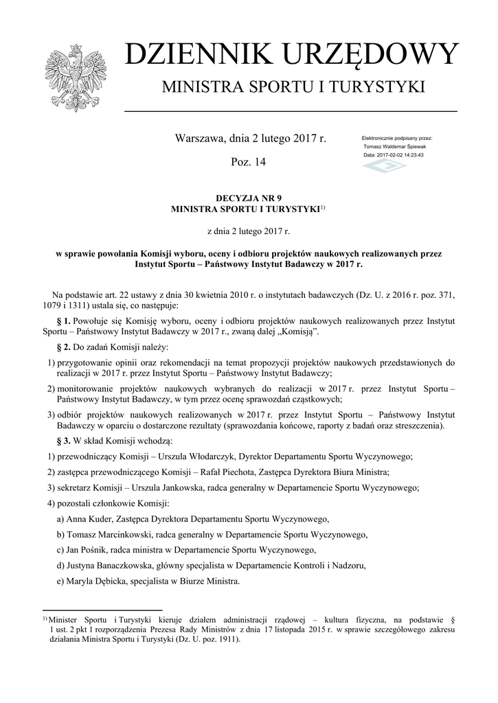 DZIENNIK URZĘDOWY MINISTRA SPORTU I TURYSTYKI Warszawa, dnia 2 lutego 2017 r. Elektronicznie podpisany przez: Tomasz Waldemar Śpiewak Poz. 14 Data: 2017-02-02 14:23:43 DECYZJA NR 9 MINISTRA SPORTU I TURYSTYKI1) z dnia 2 lutego 2017 r. w sprawie powołania Komisji wyboru, oceny i odbioru projektów naukowych realizowanych przez Instytut Sportu – Państwowy Instytut Badawczy w 2017 r. Na podstawie art. 22 ustawy z dnia 30 kwietnia 2010 r. o instytutach badawczych (Dz. U. z 2016 r. poz. 371, 1079 i 1311) ustala się, co następuje: § 1. Powołuje się Komisję wyboru, oceny i odbioru projektów naukowych realizowanych przez Instytut Sportu – Państwowy Instytut Badawczy w 2017 r., zwaną dalej „Komisją”. § 2. Do zadań Komisji należy: 1) przygotowanie opinii oraz rekomendacji na temat propozycji projektów naukowych przedstawionych do realizacji w 2017 r. przez Instytut Sportu – Państwowy Instytut Badawczy; 2) monitorowanie projektów naukowych wybranych do realizacji w 2017 r. przez Instytut Sportu – Państwowy Instytut Badawczy, w tym przez ocenę sprawozdań cząstkowych; 3) odbiór projektów naukowych realizowanych w 2017 r. przez Instytut Sportu – Państwowy Instytut Badawczy w oparciu o dostarczone rezultaty (sprawozdania końcowe, raporty z badań oraz streszczenia). § 3. W skład Komisji wchodzą: 1) przewodniczący Komisji – Urszula Włodarczyk, Dyrektor Departamentu Sportu Wyczynowego; 2) zastępca przewodniczącego Komisji – Rafał Piechota, Zastępca Dyrektora Biura Ministra; 3) sekretarz Komisji – Urszula Jankowska, radca generalny w Departamencie Sportu Wyczynowego; 4) pozostali członkowie Komisji: a) Anna Kuder, Zastępca Dyrektora Departamentu Sportu Wyczynowego, b) Tomasz Marcinkowski, radca generalny w Departamencie Sportu Wyczynowego, c) Jan Pośnik, radca ministra w Departamencie Sportu Wyczynowego, d) Justyna Banaczkowska, główny specjalista w Departamencie Kontroli i Nadzoru, e) Maryla Dębicka, specjalista w Biurze Ministra. 1) Minister Sportu i Turystyki kieruje działem administracji rządowej – kultura fizyczna, na podstawie § 1 ust. 2 pkt 1 rozporządzenia Prezesa Rady Ministrów z dnia 17 listopada 2015 r. w sprawie szczegółowego zakresu działania Ministra Sportu i Turystyki (Dz. U. poz. 1911). Dziennik Urzędowy Ministra Sportu i Turystyki –2– Poz. 14 § 4. Tryb pracy Komisji wyboru, oceny i odbioru projektów naukowych realizowanych przez Instytut Sportu – Państwowy Instytut Badawczy w 2017 r. określa Regulamin prac Komisji stanowiący załącznik do decyzji. § 5. Komisja sporządza protokół z oceny propozycji projeków naukowych, zgłoszonych do realizacji w 2017 r. przez Instytut Sportu – Państwowy Instytut Badawczy oraz przedstawia kierownictwu Ministerstwa Sportu i Turystyki rekomendacje co do wyboru projektów do realizacji. § 6. Komisja w przypadku monitorowania lub odbioru projektów naukowych realizowanych przez Instytut Sportu – Państwowy Instytut Badawczy w 2017 r. sporządza każdorazowo opinię odbioru projektu na podstawie sprawozdania cząstkowego oraz protokół odbioru projektu na podstawie sprawozdania końcowego z realizacji projektu. § 7. W posiedzeniach Komisji na zaproszenie Przewodniczącego mogą brać udział eksperci z głosem doradczym (bez prawa głosu). § 8. Obsługę prac Komisji zapewnia Departament Sportu Wyczynowego. § 9. Komisja po wykonaniu prac, o których mowa w § 5, ulega rozwiązaniu. § 10. Decyzja wchodzi w życie z dniem następującym po dniu podpisania. Minister Sportu i Turystyki Witold Bańka Dziennik Urzędowy Ministra Sportu i Turystyki –3– Poz. 14 Załącznik do Decyzji Nr 9 Ministra Sportu i Turystyki z dnia 2 lutego 2017 r. REGULAMIN PRAC KOMISJI § 1. Komisja wyboru, oceny i odbioru projektów naukowych realizowanych przez Instytut Sportu – Państwowy Instytut Badawczy w 2017 roku, zwana dalej „Komisją”, obraduje na posiedzeniach zamkniętych. § 2. 1. Posiedzenia Komisji prowadzi przewodniczący lub w przypadku jego nieobecności – zastępca przewodniczącego Komisji lub inny członek Komisji upoważniony przez przewodniczącego Komisji. 2. Prowadzenie dokumentacji z prac Komisji nadzoruje jej Sekretarz. Z prac Komisji Sekretarz sporządza: 1) protokół z oceny propozycji projektów naukowych przedstawionych do realizacji w 2017 r. przez Instytut Sportu – Państwowy Instytut Badawczy oraz przedstawia kierownictwu Ministerstwa Sportu i Turystyki rekomendacje co do wyboru projektów do realizacji; 2) w przypadku monitorowania lub odbioru projektów naukowych realizowanych przez Instytut Sportu – Państwowy Instytut Badawczy w 2017 r. każdorazowo opinię lub protokół odbioru projektu na podstawie sprawozdania cząstkowego oraz protokół odbioru na podstawie sprawozdania końcowego z realizacji projektu w oparciu o dostarczone rezultaty m.in. raporty z badań oraz streszczenia. 3. Udział w pracach Komisji odbywa się w ramach obowiązków służbowych bez prawa do dodatkowego wynagrodzenia z tego tytułu. 4. Posiedzenia Komisji zwoływane są przez przewodniczącego Komisji w zależności od potrzeb związanych z etapem realizacji projektów. 5. Komisja podejmuje decyzję dotyczącą wyboru projektów naukowych oraz wysokości ich dofinansowania zwykłą większością głosów, w obecności co najmniej 5 członków Komisji. Przy równej liczbie głosów decydujący jest głos przewodniczącego. § 3. 1. Komisja ocenia propozycje projektów naukowych pod względem formalnym i merytorycznym. 2. Wartość merytoryczną projektów naukowych Komisja ocenia według nw. kryteriów: 1) wartość naukowo-badawcza projektu; 2) znaczenie badań naukowych dla rozwoju sportów olimpijskich; 3) zgodność z zakresem tematycznym; 4) adekwatność, jakość, efektywność alokacji zasobów finansowych; 5) dorobek i doświadczenie badawcze wykonawców, zastosowane metody i aparatura badawcza, grupa badawcza (poziom sportowy, wielkość, zróżnicow