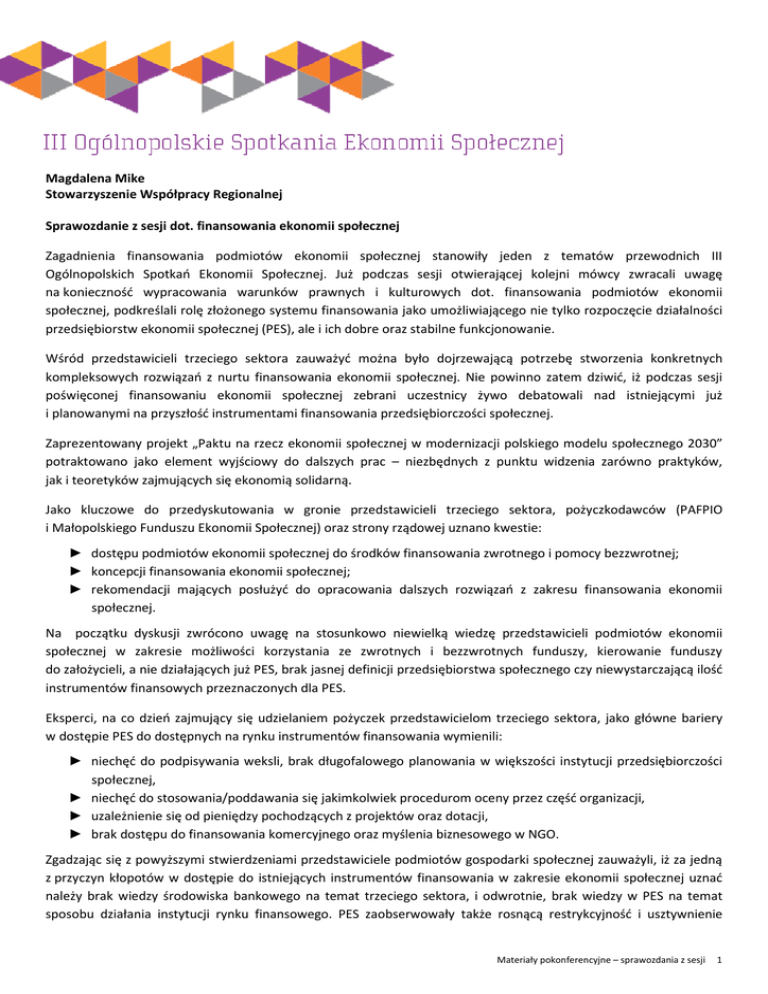 Magdalena Mike Stowarzyszenie Współpracy Regionalnej Sprawozdanie z sesji dot. finansowania ekonomii społecznej Zagadnienia finansowania podmiotów ekonomii społecznej stanowiły jeden z tematów przewodnich III Ogólnopolskich Spotkań Ekonomii Społecznej. Już podczas sesji otwierającej kolejni mówcy zwracali uwagę na konieczność wypracowania warunków prawnych i kulturowych dot. finansowania podmiotów ekonomii społecznej, podkreślali rolę złożonego systemu finansowania jako umożliwiającego nie tylko rozpoczęcie działalności przedsiębiorstw ekonomii społecznej (PES), ale i ich dobre oraz stabilne funkcjonowanie. Wśród przedstawicieli trzeciego sektora zauważyć można było dojrzewającą potrzebę stworzenia konkretnych kompleksowych rozwiązań z nurtu finansowania ekonomii społecznej. Nie powinno zatem dziwić, iż podczas sesji poświęconej finansowaniu ekonomii społecznej zebrani uczestnicy żywo debatowali nad istniejącymi już i planowanymi na przyszłość instrumentami finansowania przedsiębiorczości społecznej. Zaprezentowany projekt „Paktu na rzecz ekonomii społecznej w modernizacji polskiego modelu społecznego 2030” potraktowano jako element wyjściowy do dalszych prac – niezbędnych z punktu widzenia zarówno praktyków, jak i teoretyków zajmujących się ekonomią solidarną. Jako kluczowe do przedyskutowania w gronie przedstawicieli trzeciego sektora, pożyczkodawców (PAFPIO i Małopolskiego Funduszu Ekonomii Społecznej) oraz strony rządowej uznano kwestie: ► dostępu podmiotów ekonomii społecznej do środków finansowania zwrotnego i pomocy bezzwrotnej; ► koncepcji finansowania ekonomii społecznej; ► rekomendacji mających posłużyć do opracowania dalszych rozwiązań z zakresu finansowania ekonomii społecznej. Na początku dyskusji zwrócono uwagę na stosunkowo niewielką wiedzę przedstawicieli podmiotów ekonomii społecznej w zakresie możliwości korzystania ze zwrotnych i bezzwrotnych funduszy, kierowanie funduszy do założycieli, a nie działających już PES, brak jasnej definicji przedsiębiorstwa społecznego czy niewystarczającą ilość instrumentów finansowych przeznaczonych dla PES. Eksperci, na co dzień zajmujący się udzielaniem pożyczek przedstawicielom trzeciego sektora, jako główne bariery w dostępie PES do dostępnych na rynku instrumentów finansowania wymienili: ► niechęć do podpisywania weksli, brak długofalowego planowania w większości instytucji przedsiębiorczości społecznej, ► niechęć do stosowania/poddawania się jakimkolwiek procedurom oceny przez część organizacji, ► uzależnienie się od pieniędzy pochodzących z projektów oraz dotacji, ► brak dostępu do finansowania komercyjnego oraz myślenia biznesowego w NGO. Zgadzając się z powyższymi stwierdzeniami przedstawiciele podmiotów gospodarki społecznej zauważyli, iż za jedną z przyczyn kłopotów w dostępie do istniejących instrumentów finansowania w zakresie ekonomii społecznej uznać należy brak wiedzy środowiska bankowego na temat trzeciego sektora, i odwrotnie, brak wiedzy w PES na temat sposobu działania instytucji rynku finansowego. PES zaobserwowały także rosnącą restrykcyjność i usztywnienie Materiały pokonferencyjne – sprawozdania z sesji 1 instytucji rynku finansowego w stosunku do trzeciego sektora, skutkujące zahamowaniem udzielania pożyczek i kredytów dla tego sektora. Gdy dodamy do tego kolejne: niezrozumienie specyfiki działania, panujące stereotypy, małą liczbę specjalistów posiadających zarówno wiedzę nt. sektora obywatelskiego, jak i bankowego oraz odgrywające niebagatelną rolę kwestie związane z brakiem środków własnych oraz formą prawną (stowarzyszenia, fundacje, spółdzielnie socjalne) jasne staje się, iż praca nad zbudowaniem nowych instrumentów finansowanych jest fundamentalna z punktu widzenia dalszego rozwoju ES. Biorąc pod uwagę zaprezentowane zagadnienia eksperci podkreślali, iż przejście od formy działania organizacji, której główne finansowanie uzależnione jest od środków projektowych, do modelu, w którym prowadzenie własnej działalności gospodarczej (a nie sięganie po dotacje) stanowić będzie podstawę dochodów może okazać się trudniejsze, niżby mogło się wydawać. Konieczne wydaje się wypracowanie takiego systemu wsparcia ES, który stworzyłby możliwości otrzymania pożyczki przez organizacje, nie mogące otrzymać kredytu z banku. Systemu, który byłby oparty na prostych procedurach, zrozumieniu specyfiki podmiotów trzeciego sektora oraz pozwalał na elastyczność w wielu kluczowych kwestiach, takich jak np. spłata zaciągniętej pożyczki. Zarówno paneliści, jak i zgromadzeni uczestnicy zgodnie stwierdzili, iż w związku z niemożliwością uzyskania realnego wsparcia finansowego od podmiotów komercyjnych rekomendować należy: ► ► ► ► powstanie Funduszu Przedsiębiorczości Społecznej finansowanego z 1% CIT; przeprowadzenie pilotażu funduszu poręczeniowego i pożyczkowego; tworzenie specjalistycznych instrumentów finansowania dla PES; wykorzystanie istniejących regionalnych funduszy poręczeniowych – ich doświadczeń i infrastruktury oraz kontynuowanie wzajemnego uczenia się świata bankowości i 3 sektora (np. poprzez zapewnienie podmiotom gospodarki społecznej opiekuna biznesowego). Wszystkie wyżej wymienione działania będą możliwe do urealnienia jedynie w sytuacji kooperacji pomiędzy przedstawicielami wszystkich sektorów oraz otwartości i partnerskiego podejścia. Warto podkreślić, iż wszystkie poruszone podczas sesji kwestie możliwe są do realizacji przy wykorzystaniu szans, jakie daje Program Operacyjny Kapitał Ludzki, Fundusz Inicjatyw Obywatelskich, programy LEADER i Odnowa Wsi oraz rozpoczęte (chociażby przy okazji OSES) konsultacje społeczne i międzysektorowe. Prelegentami w sesji na temat finansowania ekonomii społecznej byli: Krzysztof 