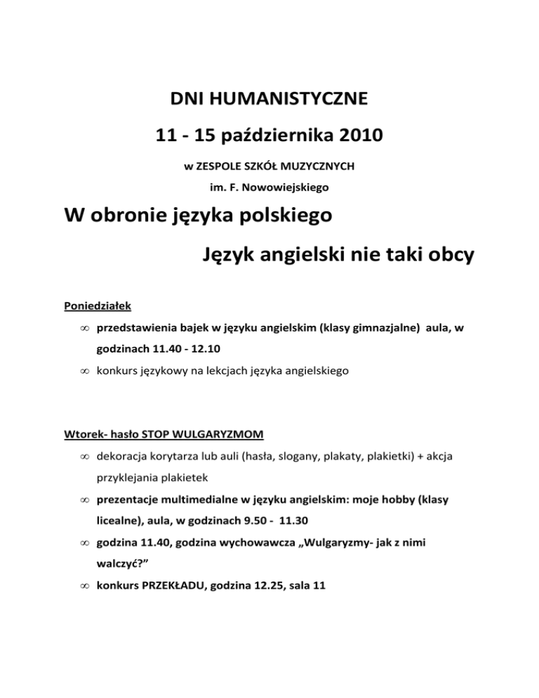 DNI HUMANISTYCZNE 11 - 15 października 2010 w ZESPOLE SZKÓŁ MUZYCZNYCH im. F. Nowowiejskiego W obronie języka polskiego Język angielski nie taki obcy Poniedziałek • przedstawienia bajek w języku angielskim (klasy gimnazjalne) aula, w godzinach 11.40 - 12.10 • konkurs językowy na lekcjach języka angielskiego Wtorek- hasło STOP WULGARYZMOM • dekoracja korytarza lub auli (hasła, slogany, plakaty, plakietki) + akcja przyklejania plakietek • prezentacje multimedialne w języku angielskim: moje hobby (klasy licealne), aula, w godzinach 9.50 - 11.30 • godzina 11.40, godzina wychowawcza „Wulgaryzmy- jak z nimi walczyć?” • konkurs PRZEKŁADU, godzina 12.25, sala 11 Środa – hasło POPRAWNA POLSZCZYZNA - PROSTA DROGA DO SUKCESU • konkurs MISTRZ ORTOGRAFII ZESPOŁU SZKÓŁ MUZYCZNYCH, aula, w godzinach 8.55- 9.40 • uroczyste pasowanie uczniów klas pierwszych - Święto Edukacji Narodowej - widowisko pt. Non scholae sed vitae, aula, godzina 11.00 • satyra na „byki” językowe w stylu HIP HOP lub dowolnym (ogłoszenie) Piątek – ogłoszenie wyników (laureaci), prezentacje, posumowanie Aula, od godziny 10.00 MISTRZ ORTOGRAFII MISTRZ PRZEKŁADU Najciekawsze widowisko i prezentacja Prezentacja satyry Wystawa i ocena plakatów ze sloganem Podsumowanie ankiet