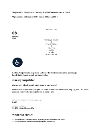Wojewódzki Inspektorat Ochrony Roślin i Nasiennictwa w Łodzi Ogłoszenie o naborze nr 1997 z dnia 28 lipca 2016 r. OFERTY DO 08 sierpnia 2016 WYMIAR ETATU 1 STANOWISKA 1 STATUS nabór w toku DODATKOWE Łódzki Wojewódzki Inspektor Ochrony Roślin i Nasiennictwa poszukuje kandydatów\kandydatek na stanowisko: starszy inspektor do spraw: bhp i p.poż. oraz spraw socjalnych stanowisko samodzielne, w tym 1/2 etatu zadania stanowiska ds bhp i p.poż. i 1/2 etatu zadania stanowiska ds socjalnych, łącznie 1 etat MIEJSCE WYKONYWANIA PRACY: Łódź ADRES URZĘDU: 94-250 Łódź, Siewna 13a WARUNKI PRACY praca biurowa z koniecznością wyjść/wyjazdów służbowych w teren, użytkowanie sprzętu biurowego (komputer, drukarka), praca przy komputerze powyżej 4 godz. dziennie, oświetlenie naturalne i sztuczne, praca samodzielna wymagająca wysokiej koncentracji, narzędzia pracy – komputer, miejsce pracy – parter w budynku jednopiętrowym, istnieją bariery architektoniczne w zakresie poruszania się po budynku – brak podjazdu, brak windy, brak dostępu na piętro dla osób poruszających się na wózkach inwalidzkich, niedostosowane toalety dla osób niepełnosprawnych. ZAKRES ZADAŃ nadzór nad przestrzeganiem przepisów i zasad bhp oraz przepisów p.poż w jednostce, opracowywanie wewnętrznych zarządzeń, regulaminów i instrukcji wdrażających przepisy bhp, prowadzenie szkoleń wstępnych nowo zatrudnionych pracowników oraz nadzór nad przeprowadzaniem szkoleń okresowych w zakresie bhp i p.poż, prowadzenie całości spraw związanych z zaopatrzeniem uprawnionych pracowników w odzież, obuwie robocze i środki ochrony indywidualnej, udział w badaniu okoliczności wypadków przy pracy i prowadzenie dokumentacji w tym zakresie, prowadzenie analiz i ocen ryzyka na stanowisku pracy oraz ich aktualizacja, bieżący nadzór i kontrola warunków pracy i prowadzenie dokumentacji związanej z bhp, prowadzenie całości spraw związanych z Zakładowym Funduszem Świadczeń Socjalnych. WYMAGANIA NIEZBĘDNE Wykształcenie: wyższe kierunkowe lub studia podyplomowe w zakresie bhp, średnie technik bezpieczeństwa i higieny pracy staż pracy: w tym 1 rok stażu pracy w służbie bhp przy wykształceniu wyższym i co najmniej 3 letni staż pracy w służbie bhp przy wykształceniu średnim kierunkowym aktualne szkolenie okresowe dla pracowników służby bhp, znajomość przepisów z zakresu prawa pracy, znajomość ustawy o zakładowym funduszu świadczeń socjalnych, bardzo dobra znajomość pakietu MS Office, systematyczne podejście do rozwiązywania problemów, samodzielność i elastyczność, dokładność i rzetelność w wykonywaniu obowiązków, komunikatywność i kreatywność. Posiadanie obywatelstwa polskiego Korzystanie z pełni praw publicznych Nieskazanie prawomocnym wyrokiem za umyślne przestępstwo lub umyśle przestępstwo skarbowe WYMAGANIA DODATKOWE umiejętność dobrej komunikacji i budowy relacji w zespołach, bardzo dobra organizacja pracy, staż pracy w administracji państwowej. DOKUMENTY I OŚWIADCZENIA NIEZBĘDNE Życiorys/CV i list motywacyjny Kopie dokumentów potwierdzających spełnienie wymagania niezbędnego w zakresie wykształcenia Kopie dokumentów potwierdzających spełnienie wymagania niezbędnego w zakresie doświadczenia zawodowego / stażu pracy Kopie dokumentów potwierdzających spełnienie wymagania niezbędnego w zakresie aktualnego szkolenia okresowego dla pracowników służby bhp, Oświadczenie o posiadaniu obywatelstwa polskiego albo kopia dokumentu potwierdzającego posiadanie polskiego obywatelstwa Oświadczenie o wyrażeniu zgody na przetwarzanie danych osobowych do celów naboru Oświadczenie o korzystaniu z pełni praw publicznych Oświadczenie o nieskazaniu prawomocnym wyrokiem za umyślne przestępstwo lub umyślne przestępstwo skarbowe DOKUMENTY I OŚWIADCZENIA DODATKOWE kopia dokumentu potwierdzającego niepełnosprawność - w przypadku kandydatek/kandydatów, zamierzających skorzystać z pierwszeństwa w zatrudnieniu w przypadku, gdy znajdą się w gronie najlepszych kandydatek/kandydatów Kopie dokumentów potwierdzających spełnienie wymagania dodatkowego w zakresie stażu pracy w administracji państwowej TERMINY I MIEJSCE SKŁADANIA DOKUMENTÓW Dokumenty należy złożyć do: 08 sierpnia 2016 r. Decyduje data: stempla pocztowego / osobistego dostarczenia oferty do urzędu Miejsce składania dokumentów: Wojewódzki Inspektorat Ochrony Roślin i Nasiennictwa w Łodzi ul. Siewna 13 a 94-250 Łódź INNE INFORMACJE: W miesiącu poprzedzającym datę upublicznienia ogłoszenia wskaźnik zatrudnienia osób niepełnosprawnych w urzędzie, w rozumieniu przepisów o rehabilitacji zawodowej i społecznej oraz zatrudnianiu osób niepełnosprawnych, nie wynosi co najmniej 6%. Przewidywane wynagrodzenie zasadnicze brutto : 2200,00zł. – 2400,00zł. Oferty otrzymane po terminie lub nie zawierające wszystkich „wymaganych dokumentów i oświadczeń” oraz „innych dokumentów i oświadczeń” nie będą rozpatrywane. Kandydaci spełniający wymagania formalne i niezbędne, którzy- po analizie ofert- zostaną zakwalifikowani do kolejnego etapu naboru, będą powiadomieni o terminie jego przeprowadzenia. Oferty odrzucone zostaną komisyjnie zniszczone po upływie roku od daty ogłoszenia naboru. Dodatkowe informacje można uzyskać pod numerem telefonu 42 6339972 w.30. Legenda Pierwszeństwo dla osób z niepełnosprawnościami Ogłoszenie z tym symbolem oznacza, że pierwszeństwo w zatrudnieniu mają osoby z niepełnosprawnościami, które spełniają wszystkie następujące warunki: złożyły w terminie ofertę wraz z dokumentem potwierdzającym niepełnosprawność, spełniają warunki wymienione w ogłoszeniu, po rekrutacji znalazły się w gronie najlepszych kandydatów.