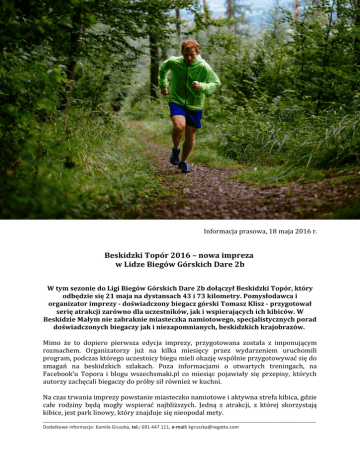 Informacja prasowa, 18 maja 2016 r. Beskidzki Topór 2016 – nowa impreza w Lidze Biegów Górskich Dare 2b W tym sezonie do Ligi Biegów Górskich Dare 2b dołączył Beskidzki Topór, który odbędzie się 21 maja na dystansach 43 i 73 kilometry. Pomysłodawca i organizator imprezy - doświadczony biegacz górski Tomasz Klisz - przygotował serię atrakcji zarówno dla uczestników, jak i wspierających ich kibiców. W Beskidzie Małym nie zabraknie miasteczka namiotowego, specjalistycznych porad doświadczonych biegaczy jak i niezapomnianych, beskidzkich krajobrazów. Mimo że to dopiero pierwsza edycja imprezy, przygotowana została z imponującym rozmachem. Organizatorzy już na kilka miesięcy przez wydarzeniem uruchomili program, podczas którego uczestnicy biegu mieli okazję wspólnie przygotowywać się do zmagań na beskidzkich szlakach. Poza informacjami o otwartych treningach, na Facebook’u Topora i blogu wszechsmaki.pl co miesiąc pojawiały się przepisy, których autorzy zachęcali biegaczy do próby sił również w kuchni. Na czas trwania imprezy powstanie miasteczko namiotowe i aktywna strefa kibica, gdzie całe rodziny będą mogły wspierać najbliższych. Jedną z atrakcji, z której skorzystają kibice, jest park linowy, który znajduje się nieopodal mety. _____________________________________________________________________________________________________ Dodatkowe informacje: Kamila Gruszka, tel.: 691 447 111, e-mail: [email protected] Dla samych startujących przygotowano pulę atrakcyjnych nagród, m.in. vouchery na zakupy w sklepach Regatta. Udział w biegu daje możliwość zdobycia punktów UTMB – prestiżowej klasyfikacji, na podstawie której biegacze zostają zakwalifikowani do jednego z najważniejszych biegów ultra, który rozgrywa się w Alpach. Beskidzki Topór odbywa się w ramach Ligi Biegów Górskich Dare 2b, która tylko w tym roku obejmuje 120 imprez biegowych oraz został zakwalifikowany do programu Regatta RUSZ SIĘ! Zgodnie z ideą tego ostatniego organizowane są aktywności, których formy mogą być dowolne. Ważne by nie zalegać nie kanapie, ale szukać atrakcyjnych i właściwych dla nas form sportu. W ośrodku Czarny Groń, będącym bazą biegu, pojawi się wiele rodzin z dziećmi, więc poza morderczym Toporem będzie to z pewnością czas wypełniony spacerami, aktywnościami i gorącymi emocjami podczas kibicowania najbliższym. Szczegóły wydarzenia: www.ruszsie.org Program „Regatta RUSZ SIĘ!” powstał z myślą o ludziach, którzy lubią wychodzić z inicjatywą i chcą zachęcać innych do aktywnego spędzania czasu. Każdy, kto chciałby zorganizować imprezę lub cykl wydarzeń, których celem jest zachęcanie do aktywnego wypoczynku, może zgłosić swój projekt poprzez formularz na stronie programu www.ruszsie.org. Każda ciekawa inicjatywa ma szansę uzyskać wsparcie produktowe od marki odzieży outdoorowej Regatta. Więcej informacji o wspieranych przez program imprezach w kalendarium na stronie www.ruszsie.org. Twórcą programu „RUSZ SIĘ!” jest marka Regatta, brytyjska marka odzieży outdoorowej, stworzona zarówno dla sportowców, jak i wszystkich miłośników spędzania czasu na świeżym powietrzu. Regatta to rodzinna firma istniejąca na rynku od ponad 30 lat, która swoją popularność zdobyła, oferując ubrania o wysokich parametrach, ale w przystępnych cenach. _____________________________________________________________________________________________________ Dodatkowe informacje: Kamila Gruszka, tel.: 691 447 111, e-mail: [email protected]