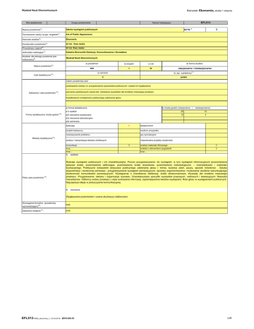 Kierunek: Ekonomia, studia 1 stopnia Wydział Nauk Ekonomicznych Rok akademicki: 1) Nazwa przedmiotu : Sztuka wystąpień publicznych Tłumaczenie nazwy na jęz. angielski 3): Art of Public Appearance Kierunek studiów4): Ekonomia Koordynator przedmiotu5): dr inż. Ewa Jaska ECTS Prowadzący zajęcia6): dr inż. Ewa Jaska Jednostka realizująca 7): Katedra Ekonomiki Edukacji, Komunikowania i Doradztwa Wydział, dla którego przedmiot jest realizowany8): Wydział Nauk Ekonomicznych Status przedmiotu 9): EFL513 Numer katalogowy: Grupa przedmiotów 3 2) a) przedmiot b) stopień c) rok d) forma studiów KW 1 III stacjonarne / niestacjonarne Cykl dydaktyczny10): a) semestr b) Jęz. wykładowy11) 5 polski Celem przedmiotu jest: przekazanie wiedzy nt. przygotowania wypowiedzi publicznych i zasad ich wygłaszania Założenia i cele przedmiotu 12): poznanie podstwowych zasad dot. udzielania wywiadów dla środków masowego przekazu kształtowanie umiejetności publicznego zabierania głosu a) forma dydaktyczna Formy dydaktyczne, liczba godzin13): b) liczba godzin (stacjonarne i niestacjonarne) a1) wykład 20 12 a2) ćwiczenia audytoryjne 10 4 a3) ćwiczenia laboratoryjne a4) seminaria dyskusja Metody dydaktyczne14): eksperyment projekt badawczy studium przypadku rozwiazywanie problemu gry symulacyjne analiza i interpretacja tekstów źródłowych konsultacje indywidualne projekty studenckie analiza materiału filmowego T inne… wykład z elementami pogadanki T inne… inne … A. Pełny opis przedmiotu 15): T T wykłady Rodzaje wystąpień publicznych i ich charakterystyka. Proces przygotowywania do wystąpień, w tym wystąpień informacyjnych (przemówienia opisowe ścisłe, przemówienia definiujące, przemówienia ścisłe dowodowe, przemówienia metodologiczno – instruktażowe) i materiału ilustracyjnego. Praktyczne wskazówki dotyczace publicznego zabierania głosu ( trema, budowa zdań, pauzy, sposób mówienia) . Sztuka argumentacji i skutecznej perswazji - przygotowywanie wystąpień perswazyjnych, sposoby argumentowania i budowania zaufania warunkującego skuteczność komunikatów perswazyjnych. Wystąpienia o charakterze deklaracji, ściśle okolicznościowe. Wywiady dla środków masowego przekazu. Przygotowanie, taktyka i organizacja wywiadu. Charakterystyka specyfiki wywiadów prasowych, radiowych i telewizyjnych. Retoryka menedżerów. Odbiorcy wobec przekazu ( style sortowania informacji, zapamiętywanie tekstów wystapień). Rola głosu w wystąpieniach publicznych. Najczęstsze błędy w polszczyźnie komunikacyjnej. B. ćwiczenia Wygłaszanie przemówień i ocena słuchaczy (odbiorców). Wymagania formalne (przedmioty wprowadzające)16): brak 17) brak EFL513 WNE_ekonomia_1_12.03.2012, 2013-05-31 Założenia wstępne : LW Kierunek: Ekonomia, studia 1 stopnia Wydział Nauk Ekonomicznych 01 - definiuje zasady przygotowania się do przemówień 05 - poznaje specyfikę poszczególnych rodzajów wywiadów w mediach 02 - rozróżnia rodzaje wystąpień publicznych 06 - 03 - rozwija umiejętności publicznego zabierania głosu 07 - 04 - poznaje i weryfikuje sposoby radzenia sobie ze stresem podczas wypowiedzi publicznych 08 - Efekty kształcenia 18): (z kolejnymi numerami, 01, 02, 03 itd.) kolokwium na zajęciach ćwiczeniowych ocena wykonanie zadania projektowego na zdefiniowany temat praca pisemna przygotowywana w ramach pracy własnej studenta Sposób weryfikacji efektów kształcenia 19) ocena wynikająca z obserwacji w trakcie zajęć ocena eksperymentów wykonywanych w trakcie : zajęć przygotowanie zespołowej analizy zdefiniowanego problemu ocena wystąpień i prezentacji w trakcie zajęć obserwacja w trakcie dyskusji zdefiniowanego problemu (aktywność) egzamin pisemny test komputerowy egzamin ustny ocena przemówień podczas ćwiczeń 1,2,4,5 zaliczenie pisemne okresowe prace pisemne imienne karty oceny studenta Forma dokumentacji osiągniętych efektów złożone projekty kształcenia 20): testy zaliczeniowe treść pytań egzaminacyjnych z oceną 1,2,4,5 inne… Element oceny inne.. inne.. Waga w % kolokwium na zajęciach ćwiczeniowych Elementy i wagi mające wpływ na ocenę końcową21): 3,4 inne Element oceny ocena wykonania zadania projektowego na zdefiniowany temat praca pisemna przygotowywana w ramach pracy własnej studenta ocena wynikająca z obserwacji w trakcie zajęć ocena eksperymentów wykonywanych w trakcie zajęć przygotowanie zespołowej analizy zdefiniowanego problemu ocena wystąpień i prezentacji w trakcie zajęć obserwacja w trakcie dyskusji zdefiniowanego problemu (aktywność) egzamin pisemny test egzamin ustny zaliczenie pisemne Waga w % ocena przemówień podczas ćwiczeń 50% Miejsce realizacji zajęć22): 50% inne.. sala dydaktyczna Literatura podstawowa i uzupełniająca23): a) podstawowa 1. Detz J. 2007. Sztuka przemawiania. Gdańskie Wydawnictwo Psychologiczne, Gdańsk 2. Mentzel W. (tłum. J. Borucka) 2009. Mistrzowska retoryka. Sekrety przekonujących wystąpień. Wydaw. Flashbook. Warszawa b) uzupełniająca 3. Andrzejewski P. 2002. Sztuka wystąpień publicznych i profesjonalnej korespondencji. Wydaw.Forum, Poznań 4. Deckert B. (tłum. Lipa M.) 2009. Wystąpienia publiczne. Wydaw.MT Biznes Sp.z o.o. Warszawa 5. Kochan M. 2007. Pojedynek na słowa. Techniki erystyczne w publicznych sporach. Wydawnictwo Znak. Kraków 6. Kuziak M. 2008. Sztuka mówienia. Poradnik praktyczny. Wydaw.Szkolne PWN. Warszawa - Bielsko -Biała 7. Murdoch A. 2000. Prezentacje i wystąpienia w public relations. Wydawnictwo Poltext, Warszawa 8. Wiszniewski A.1996. Jak przekonująco mówić i przemawiać. Wydawnictwo „Text”, Wrocław-Warszawa UWAGI24): EFL513 WNE_ekonomia_1_12.03.2012, 2013-05-31 LW