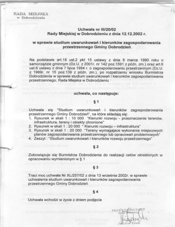 F"ADA MI'JSIłA uchwałanr l|l/20/02 Rady Mieiskiei w Dobrodzieniu z dńia 12'12'2002.' w spfawiestudiumuwafunkowańi kierunkówzagospodalowania pŻestrzennegoGminy Doblodzień Na podstaweań.18 ust'2pK 15 ustawyz dnia 8 marca1990 toku o gminnym (Dz.U samoEądzie ' 22001|.nr 142poz'1591 z późn ' zm.)onz ań.6 ust'6Ustawy z dnia7 |ipca1994r.o fagośpodarcwaniu p|zesl|zennym (Df.U' z 1999r' nt 15 poz'139z pÓ^' zm.)' po tozpatrzeniu wnioskuBurmislrza Dobrodieniaw sprawiesfudiumuwarunkowań i kierunkówzagospodarowania przesttz ennego, RadaMiejska w Dobrodzieniu uchwaIa,co nasĘpuje; sl Uchwa|a s.ę 'studium uwarunkowańi kierunków zagospodarowania przeŚlrzennego GminyDobrodzień'.' naktóreskładają się: j' Rysunekw ska|i1 : 10 000 "Kierunki rofwoju pzeznaczenie terenÓw' infrcslruktuta, tercnyi obiektychmnione" 2. Rysunekw skali 1 : 20 000 " Kierunkirozwoju- infrastruktura' 3. Rysunek w ska|i 1 : 20 000 .Tercnywymagajac€ wykonaniamiejscowych p|anóWfagospodarowaniaprzestrzennego|ubopracowańprob|emowych'' przestrzennego" 4 . zesfyt : .sludium uwarunkowańi kierunkówmzwo].u s2 zobowjązujesię Burmis|tzaDobrodfieniado rea|izacjic€lów okreś|onych w opEcowaniuwmienionymws 1 s3 Traci moc uchwałaNl xl/2s7l02 z dnia 13 w|z€śnia2002t.w spEwie uchwalenia sfudiumuwarunkowań i kierunków zagospodatowania przeslrzennegoGminy Dobrodźeń s4 Uchwaławchodfi w życiez dniempodjęcia