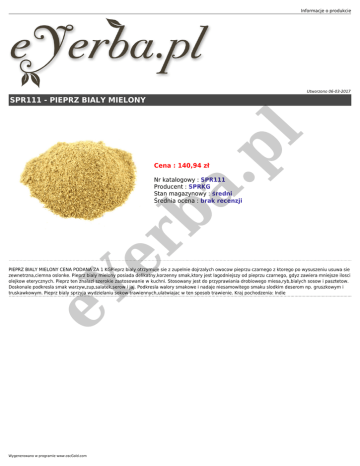 Informacje o produkcie Utworzono 06-03-2017 a. pl SPR111 - PIEPRZ BIALY MIELONY Cena : 140,94 zł er b Nr katalogowy : SPR111 Producent : SPRKG Stan magazynowy : średni Średnia ocena : brak recenzji eY PIEPRZ BIALY MIELONY CENA PODANA ZA 1 KGPieprz bialy otrzymuje sie z zupelnie dojrzalych owocow pieprzu czarnego z ktorego po wysuszeniu usuwa sie zewnetrzna,ciemna oslonke. Pieprz bialy mielony posiada delikatny,korzenny smak,ktory jest lagodniejszy od pieprzu czarnego, gdyz zawiera mniejsze ilosci olejkow eterycznych. Pieprz ten znalazl szerokie zastosowanie w kuchni. Stosowany jest do przyprawiania drobiowego miesa,ryb,bialych sosow i pasztetow. Doskonale podkresla smak warzyw,zup,salatek,serow i jaj. Podkresla walory smakowe i nadaje niesamowitego smaku slodkim deserom np. gruszkowym i truskawkowym. Pieprz bialy sprzyja wydzielaniu sokow trawiennych,ulatwiajac w ten sposob trawienie. Kraj pochodzenia: Indie Wygenerowano w programie www.oscGold.com