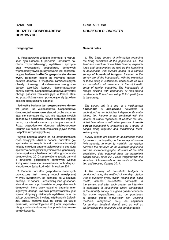 DZIAŁ VIII CHAPTER VIII BUDŻETY GOSPODARSTW DOMOWYCH HOUSEHOLD BUDGETS Uwagi ogólne General notes 1. Podstawowym źródłem informacji o warunkach bytu ludności, tj. poziomie i strukturze dochodu rozporządzalnego, wydatków i spożycia oraz wyposażeniu gospodarstw domowych w przedmioty trwałego użytkowania jest reprezentacyjne badanie budżetów gospodarstw domowych. Badaniem objęte są wszystkie gospodarstwa domowe, z wyjątkiem zamieszkujących obiekty zbiorowego zakwaterowania oraz gospodarstw członków korpusu dyplomatycznego państw obcych. Gospodarstwa domowe obywateli obcego państwa zamieszkujące w Polsce stale lub przez dłuższy czas i posługujące się językiem polskim biorą udział w badaniu. 1. The basic source of information regarding the living conditions of the population, i.e., the level and structure of available income, expenditures and consumption as well as the furnishing of households with durable goods, is a sample survey of household budgets. Included in the survey are all the households, with the exception of those living in institutional households as well as households of members of the diplomatic corps of foreign countries. The households of foreign citizens with permanent or long-lasting residence in Poland and using Polish participate in the survey. Jednostką badania jest gospodarstwo domowe jedno- lub wieloosobowe. Gospodarstwo domowe jednoosobowe stanowi osoba utrzymująca się samodzielnie, tzn. nie łącząca swoich dochodów z dochodami innych osób bez względu na to, czy mieszka sama czy z innymi osobami. Przez gospodarstwo domowe wieloosobowe rozumie się zespół osób zamieszkujących razem i wspólnie utrzymujących się. The survey unit is a one- or a multi-person household. A one-person household is understood as an individual independently maintained, i.e., income is not combined with the income of others regardless of whether the individual lives alone or with other persons. A multiperson household is understood as a group of people living together and maintaining themselves jointly. Wyniki badania oparte są na oświadczeniach osób biorących udział w badaniu budżetów gospodarstw domowych. W celu zachowania relacji między strukturą badanej zbiorowości a strukturą społeczno-demograficzną zbiorowości generalnej, dane uzyskane z badania budżetów gospodarstw domowych od 2010 r. przeważone zostały danymi o strukturze gospodarstw domowych według liczby osób i miejsca zamieszkania pochodzącą z Narodowego Spisu Ludności i Mieszkań 2011. Survey results are based on declarations made by persons participating in the survey of household budgets. In order to maintain the relation between the structure of the surveyed population and the socio-demographic structure of the total population, data obtained from the household budget survey since 2010 were weighted with the structure of households on the basis of Population and Housing Census 2011. 2. Badanie budżetów gospodarstw domowych prowadzone jest metodą rotacji miesięcznej w cyklu kwartalnym, co oznacza, że w każdym miesiącu w badaniu uczestniczą inne gospodarstwa domowe, a po kwartale w gospodarstwach domowych, które brały udział w badaniu miesięcznym danego kwartału przeprowadzany jest wywiad dotyczący niektórych wydatków, m.in. na zakup przedmiotów trwałego użytkowania (telewizor, pralka, lodówka itp.), na opłatę za usługi (lekarskie, stomatologiczne itp.) oraz wyposażenie gospodarstw domowych w przedmioty trwałego użytkowania. 2. The survey of household budgets is conducted using the method of monthly rotation with a quarterly cycle, which means that, each month, different households participate in the survey, and after each quarter an interview is conducted in households which participated in the monthly survey of a given quarter concerning some expenditures, i.e., on purchases of durable goods (a television set, washing machine, refrigerator, etc.), on payments for services (medical, dental, etc.) as well as on furnishing the household with durable goods. HOUSEHOLD BUDGETS 175 Badaniem objęto wszystkie gospodarstwa domowe zamieszkałe w wylosowanych mieszkaniach, reprezentujące społeczno-ekonomiczne grupy ludności, tj. gospodarstwa domowe: pracowników, rolników, pracujących na własny rachunek, emerytów i rencistów oraz utrzymujących się z niezarobkowych źródeł (innych niż emerytura i renta). The survey included all households within randomly selected dwellings representing of socio-economic groups of the population, i.e., households of: employees, farmers, self-employed, retirees, pensioners as well as households maintained from non-earned sources (other than retirement pay and pensions). 3. Kategorie osób występujących w gospodarstwach domowych (tabl. 1) ustalone zostały na podstawie ich głównego źródła utrzymania, czyli źródła przynoszącego największy dochód: 3. The categories of persons comprising households (table 1) were established on the basis of their primary source of maintenance, i.e., source deriving the greatest income: 1) osoby pracujące, do których zalicza się: 1) employed persons include: a) pracujących najemnie, dla których głównym źródłem utrzymania jest dochód z pracy najemnej, niezależnie od rodzaju umowy zawartej z pracodawcą (umowa o pracę na czas nieokreślony lub określony, mianowanie, powołanie, praca sezonowa, praca dorywcza, umowa o wykonanie pracy nakładczej, umowa-zlecenie, umowa ustna itd.), a) hired employees, for whom the main source of maintenance is income from hired work, regardless of the type of contract concluded with the employer (a labour contract for a specified or unspecified period, postings, appointments, seasonal work, odd jobs, outwork, , commission contracts, verbal contracts, etc.), b) pracujących w gospodarstwie indywidualnym w rolnictwie (łącznie z pomagającymi członkami ich rodzin), dla których głównym źródłem utrzymania jest doch