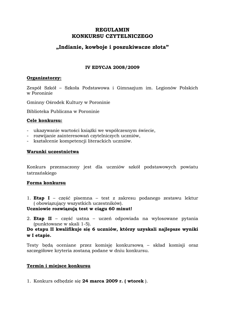 REGULAMIN KONKURSU CZYTELNICZEGO „Indianie, kowboje i poszukiwacze złota” IV EDYCJA 2008/2009 Organizatorzy: Zespół Szkół – Szkoła Podstawowa i Gimnazjum im. Legionów Polskich w Poroninie Gminny Ośrodek Kultury w Poroninie Biblioteka Publiczna w Poroninie Cele konkursu: - ukazywanie wartości książki we współczesnym świecie, rozwijanie zainteresowań czytelniczych uczniów, kształcenie kompetencji literackich uczniów. Warunki uczestnictwa Konkurs przeznaczony jest dla uczniów szkół podstawowych powiatu tatrzańskiego Forma konkursu 1. Etap I – część pisemna – test z zakresu podanego zestawu lektur ( obowiązujący wszystkich uczestników). Uczniowie rozwiązują test w ciągu 60 minut! 2. Etap II – część ustna – uczeń odpowiada na wylosowane pytania (punktowane w skali 1-5). Do etapu II kwalifikuje się 6 uczniów, którzy uzyskali najlepsze wyniki w I etapie. Testy będą oceniane przez komisję konkursową – skład komisji oraz szczegółowe kryteria zostaną podane w dniu konkursu. Termin i miejsce konkursu 1. Konkurs odbędzie się 24 marca 2009 r. ( wtorek ). 2. I etap rozpocznie się o godz. 12.30 w budynku Zespołu Szkół w Poroninie. 3. Zgłoszenia należy kierować na adres Zespołu Szkół w Poroninie (ul. Piłsudskiego 34, 34 – 520 Poronin), telefonicznie (tel./fax.: 018 20 74 186) lub na adres e-mail: [email protected] – do 13 marca 2009 r. Lista lektur: 1.Bahdaj Adam: Czarne sombrero 2.Curwood James Oliver: Łowcy wilków 3.London Jack: Biały Kieł 4.Sat – Okh: Biały Mustang 5.Szklarski Alfred: Tomek na wojennej ścieżce Postanowienia końcowe 1. Uczestnicy konkursu otrzymają dyplomy, laureaci – nagrody książkowe. 2. Poprawione testy będą udostępnione do wglądu w dniu konkursu. Serdecznie zapraszamy do udziału w konkursie!