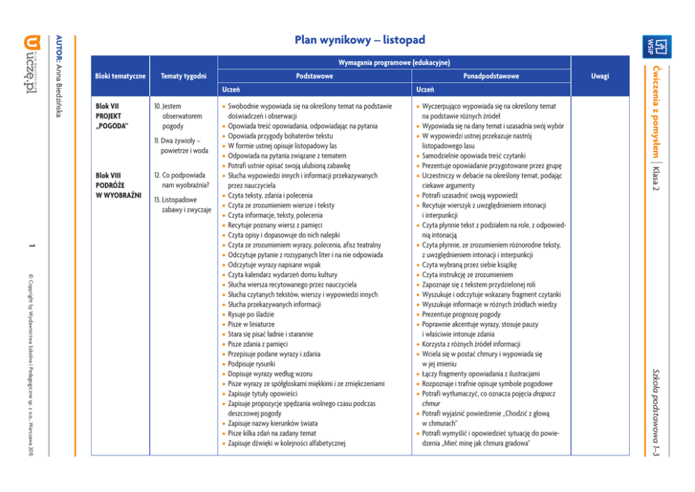 Wymagania programowe (edukacyjne) Bloki tematyczne Blok VII PROJEKT „POGODA” Tematy tygodni 10. Jestem obserwatorem pogody 11. Dwa żywioły – powietrze i woda Blok VIII PODRÓŻE W WYOBRAŹNI 12. Co podpowiada nam wyobraźnia? 13. Listopadowe zabawy i zwyczaje Podstawowe Ponadpodstawowe Uczeń Uczeń •• Swobodnie wypowiada się na określony temat na podstawie •• Wyczerpująco wypowiada się na określony temat na podstawie różnych źródeł •• Wypowiada się na dany temat i uzasadnia swój wybór •• W wypowiedzi ustnej przekazuje nastrój listopadowego lasu •• Samodzielnie opowiada treść czytanki •• Prezentuje opowiadanie przygotowane przez grupę •• Uczestniczy w debacie na określony temat, podając ciekawe argumenty •• Potrafi uzasadnić swoją wypowiedź •• Recytuje wierszyk z uwzględnieniem intonacji i interpunkcji •• Czyta płynnie tekst z podziałem na role, z odpowied- nią intonacją 1 •• Czyta płynnie, ze zrozumieniem różnorodne teksty, z uwzględnieniem intonacji i interpunkcji •• Czyta wybraną przez siebie książkę •• Czyta instrukcję ze zrozumieniem •• Zapoznaje się z tekstem przydzielonej roli •• Wyszukuje i odczytuje wskazany fragment czytanki •• Wyszukuje informacje w różnych źródłach wiedzy •• Prezentuje prognozę pogody •• Poprawnie akcentuje wyrazy, stosuje pauzy i właściwie intonuje zdania •• Korzysta z różnych źródeł informacji •• Wciela się w postać chmury i wypowiada się w jej imieniu •• Łączy fragmenty opowiadania z ilustracjami •• Rozpoznaje i trafnie opisuje symbole pogodowe •• Potrafi wytłumaczyć, co oznacza pojęcia drapacz chmur •• Potrafi wyjaśnić powiedzenie „Chodzić z głową w chmurach” •• Potrafi wymyślić i opowiedzieć sytuację do powie- dzenia „Mieć minę jak chmura gradowa” Szkoła podstawowa 1–3 © Copyright by Wydawnictwa Szkolne i Pedagogiczne sp. z o.o., Warszawa 2015 doświadczeń i obserwacji •• Opowiada treść opowiadania, odpowiadając na pytania •• Opowiada przygody bohaterów tekstu •• W formie ustnej opisuje listopadowy las •• Odpowiada na pytania związane z tematem •• Potrafi ustnie opisać swoją ulubioną zabawkę •• Słucha wypowiedzi innych i informacji przekazywanych przez nauczyciela •• Czyta teksty, zdania i polecenia •• Czyta ze zrozumieniem wiersze i teksty •• Czyta informacje, teksty, polecenia •• Recytuje poznany wiersz z pamięci •• Czyta opisy i dopasowuje do nich nalepki •• Czyta ze zrozumieniem wyrazy, polecenia, afisz teatralny •• Odczytuje pytanie z rozsypanych liter i na nie odpowiada •• Odczytuje wyrazy napisane wspak •• Czyta kalendarz wydarzeń domu kultury •• Słucha wiersza recytowanego przez nauczyciela •• Słucha czytanych tekstów, wierszy i wypowiedzi innych •• Słucha przekazywanych informacji •• Rysuje po śladzie •• Pisze w liniaturze •• Stara się pisać ładnie i starannie •• Pisze zdania z pamięci •• Przepisuje podane wyrazy i zdania •• Podpisuje rysunki •• Dopisuje wyrazy według wzoru •• Pisze wyrazy ze spółgłoskami miękkimi i ze zmiękczeniami •• Zapisuje tytuły opowieści •• Zapisuje propozycje spędzania wolnego czasu podczas deszczowej pogody •• Zapisuje nazwy kierunków świata •• Pisze kilka zdań na zadany temat •• Zapisuje dźwięki w kolejności alfabetycznej Uwagi Ćwiczenia z pomysłem | Klasa 2 Autor: Anna Biedzińska Plan wynikowy – listopad Bloki tematyczne Tematy tygodni Podstawowe Ponadpodstawowe Uczeń Uczeń •• Pisze kilka zdań na temat zrozumienia zdania „Musimy się starać •• Potrafi wytłumaczyć powiedzenia związane z wiatrem •• Potrafi wyjaśnić pojęcia utworzonych wyrazów •• Bezbłędnie pisze zdanie z pamięci •• Przypisuje podane wyrazy do ich rodzin •• Układa rodzinę wyrazu orzech •• Uzasadnia pisownię wyrazów z ch •• Pisze zdania płynnie i starannie •• Wpisuje rodzaje rzeczowników w odpowiednie miejsca •• Pisze bezbłędnie wyrazy z ó wymiennym i h •• Zapisuje nazwy miast i dat zgodnie z opisami •• Układa zdanie według określonego warunku i samo- dzielnie wymyśla zagadkę obrazkową •• Rozwiązuje zagadkę •• Samodzielnie układa zgrabny wierszyk •• Prezentuje własne przedstawienie teatrzyku cieni •• Przedstawia w scence pantomimicznej rzecz lub 2 osobę związaną z teatrem •• Uczestniczy w prezentacji przedstawienia dla młod- szych uczniów •• Pięknie śpiewa poznane piosenki •• W skupieniu słucha muzyki klasycznej, opowiada o swoich wyobrażeniach z nią związanych •• Potrafi odróżnić brzmienie harfy •• Zna rozmieszczenie poszczególnych dźwięków na pięciolinii •• Potrafi bezbłędnie przyporządkować nazwy literowe nut do nazw solmizacyjnych •• Bezbłędnie i czysto potrafi zagrać i zaśpiewać gamę C-dur •• Wykonuje oryginalne, staranne prace plastyczne •• Maluje barwną i oryginalną ilustrację do opowieści •• Potrafi przewodzić w grupie •• Pamięta, jakie informacje należy podać, dzwoniąc pod numer 112 •• Zawsze pamięta o właściwej postawie podczas słuchania i śpiewania hymnu Szkoła podstawowa 1–3 © Copyright by Wydawnictwa Szkolne i Pedagogiczne sp. z o.o., Warszawa 2015 żyć uważnie” •• Pisze określenia do podanego wyrazu •• Zapisuje nazwy lalek teatralnych •• Pisze wyrazy z ó wymiennym i h •• Tworzy pary wyrazów, gdzie ch wymienia się na sz •• Wyszukuje obrazki , w których nazwie występuje ch •• Potrafi wskazać w tekście wyrazy z ch •• Dopisuje wyrazy z ó wymiennym na o •• Wyszukuje w tekście i ćwiczeniu wyrazy z ó wymiennym na o i wyrazy z h •• Przyporządkowuje ortogramy do podanych wyrazów •• Potrafi wyjaśnić pisownię wyrazów z rz na podstawie podanego wzoru •