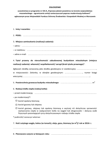 ZGŁOSZENIE uczestnictwa w programie nr OA-8 „Poprawa jakości powietrza na terenie województwa mazowieckiego - ograniczenie emisji zanieczyszczeń poprzez modernizację kotłowni” ogłoszonym przez Wojewódzki Fundusz Ochrony Środowiska i Gospodarki Wodnej w Warszawie 1. Imię i nazwisko: 2. PESEL: …………………………………………………………………………………….……………………….…………………………………………… ………………………………………………………………………………………………….………..….………………….…………………………………………… 3. Miejsce zamieszkania (realizacji zadania): – adres: ………………………………………………………………………………………………….………………………………………………………………..….………………………. – nr telefonu: – adres e-mail: ……………………………………………………………………………………………………………………………………….……………………………... ………………………………………………………………………………………………………………….……………………..………………………... 4. Tytuł prawny do nieruchomości zabudowanej budynkiem mieszkalnym (miejsca realizacji zadania): własność/ współwłasność/ zarząd (brak tytułu prawnego)*. Zgłaszam działkę oznaczoną jako działka geodezyjna nr ewidencyjny: w miejscowości: Zielonka, w obrębie geodezyjnym: ……………………………………….…..……, …………………………..……………….., numer księgi wieczystej …………………………………………………………………………………………………………………………………………………………………..………..; 5. Powierzchnia grzewcza budynku mieszkalnego: ………………………………………………………………………………… m 2 6. Rodzaj źródła ciepła (rodzaj kotła): – przed modernizacją: ………………………………………………………………………………………………………………………………………………………...…….. – po modernizacji*: kocioł opalany biomasą kocioł gazowy lub olejowy kocioł gazowy, olejowy lub opalany biomasą o wyższej niż dotychczas sprawności wytwarzania ciepła (z wyłączeniem kotła na węgiel lub ekogroszek) – dotyczy osób fizycznych pozostających przy dotychczasowym rodzaju źródła ciepła * podkreślić/ zaznaczyć właściwe 7. Ilość zużytego węgla, koksu (w tonach), oleju, gazu, biomasy (w m3)/ rok w 2016 r.: …………………………………………………….………………………………………………………………………………………………………………………………………………………………….. 8. Planowane zużycie w bieżącym roku: ….…………………………………………………………………………………………………….. 9. Rodzaj i typ planowanego do zakupu pieca (prośba o wyczerpujący opis, z uwzględnieniem parametrów technicznych oraz informację nt. wszystkich wymagań i okoliczności mogących mieć wpływ na realizację przedmiotowego przedsięwzięcia/ zadania): ………………………………………………………………………………………………………………………………………………………………………………………………………………………… ………………………………………………………………………………………………………………………………………………………………………………………………………………………… ………………………………………………………………………………………………………………………………………………………………………………………………………………………… ………………………………………………………………………………………………………………………………………………………………………………………………………………………… ………………………………………………………………………………………………………………………………………………………………………………………………………………………… ………………………………………………………………………………………………………………………………………………………………………………………………………………………… ………………………………………………………………………………………………………………………………………………………………………………………………………………………… ………………………………………………………………………………………………………………………………………………………………………………………………………………………… ………………………………………………………………………………………………………………………………………………………………………………………………………………………… ………………………………………………………………………………………………………………………………………………………………………………………………………………………… ………………