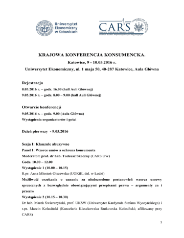 KRAJOWA KONFERENCJA KONSUMENCKA. Katowice, 9 - 10.05.2016 r. Uniwersytet Ekonomiczny, ul. 1 maja 50, 40-287 Katowice, Aula Główna Rejestracja 8.05.2016 r. – godz. 16.00 (hall Auli Głównej) 9.05.2016 r. – godz. 8.00 – 9.00 (hall Auli Głównej) Otwarcie konferencji 9.05.2016 r. – godz. 9.00 (Aula Główna) Wystąpienia organizatorów i gości Dzień pierwszy - 9.05.2016 Sesja I: Klauzule abuzywne Panel 1: Wzorce umów a ochrona konsumenta Moderator: prof. dr hab. Tadeusz Skoczny (CARS UW) Godz. 10.00 – 12.00 Wystąpienie 1 (10.00 – 10.15) R.pr. Anna Mlostoń-Olszewska (UOKiK, del. w Łodzi) Możliwość orzekania o uznaniu za niedozwolone postanowień wzorca umowy sprzecznych z bezwzględnie obowiązującymi przepisami prawa – argumenty za i przeciw Wystąpienie 2 (10.15 – 10.30) Dr hab. Marek Świerczyński, prof. UKSW (Uniwersytet Kardynała Stefana Wyszyńskiego) i r.pr. Marcin Kolasiński (Kancelaria Kieszkowska Rutkowska Kolasiński; afiliowany przy CARS) 1 Wybór prawa obcego w internetowych wzorcach umownych a ochrona konsumenta Wystąpienie 3 (10.30 – 10.45) Jacek Krzemiński (WPiA UMK) Przyszłość arbitrażu konsumenckiego – zapis na polski sąd polubowny jako niedozwolone postanowienie w umowach z konsumentami Kawa – 10.45 – 11.15 Panel 2: Modele kontroli wzorców umownych Moderator: dr Aneta Wiewiórowska-Domagalska (Uniwersytet w Osnabrück) Wystąpienie 1 (godz. 11.15 – 11.30) Krzysztof Lehmann (Del. UOKiK w Bydgoszczy) Eliminowanie postanowień niedozwolonych z wykonywanych umów o charakterze ciągłym w obrocie konsumenckim Wystąpienie 2 (godz. 11.30 – 11.45) Dr Antoni Bolecki (Kancelaria Greenberg Traurig, afiliowany przy CARS) Kontrola incydentalna klauzul abuzywnych Wystąpienie 3 (godz. 11.45 – 12.00) Patrycja Kozik (doktorantka WPiA UJ) Administracyjny może Prezesa efektywnie UOKiK model kontroli kontrolować na gruncie wzorców treść nowelizacji umownych umowy? ustawy Czyli o – nowe ochronie czy organ kompetencje konkurencji i konsumentów Łączna dyskusja do panelu 1 i 2 (godz. 12.00 – 12.30) Sesja II: Zakaz naruszania zbiorowych interesów konsumentów Panel 3: Istota naruszania zbiorowych interesów konsumentów Moderator: dr hab. Monika Namysłowska, prof. UŁ Godz. 12.30 – 13.15 Wystąpienie 1 (12.30 – 12.45) R.pr. Michał Strzelecki (autor bloga praworeklamy.pl) 2 Praktyki naruszające zbiorowe interesy konsumentów w świetle zupełnej harmonizacji praktyk handlowych wynikającej z dyrektywy 2005/29/WRE o nieuczciwych praktykach handlowych Wystąpienie 2: (12.45 – 13.00) Adw. dr Małgorzata Sieradzka (Kancelaria Adwokacka MSW, WPiA Uczelni Łazarskiego) Próba dookreślenia terminu ,,zbiorowy interes konsumentów”- definicja oraz jej wyznaczniki Wystąpienie 3: (13.00 – 13.15) Dr Aleksandra Kunkiel-Kryńska (Kancelaria Wierzbowski Eversheds), Naruszenie dobrych obyczajów a praktyka naruszająca zbiorowe interesy konsumentów Dyskusja do panelu 3 – 13.15 – 14.00 Lunch 14.00 – 15.00 Panel 4: Nowe rozwiązania w obszarze przeciwdziałania praktykom naruszającym zbiorowe interesy konsumentów Moderator: Dorota Karczewska (Wiceprezes UOKiK) Godz. 15.00 - 16.00 Wystąpienie 1(15.00 – 15.15) Dr Patrycja Dolniak-Mądrzycka (Akademia Wychowania Fizycznego w Katowicach) Nowy otwarty katalog praktyk naruszających zbiorowe interesy konsumentów Wystąpienie 2 (15.15 – 15.30) Dr Małgorzata Ganzar (WPiA KUL) Art. 24 ust. 2 pkt 4 - nowa praktyka naruszająca zbiorowe interesy konsumentów w świetle nowelizacji ustawy o ochronie konkurencji i konsumentów z 2015 r. Wystąpienie 3 (15.30 – 15.45) R.pr Marta Burnecka-Szczepańska (Gł. Specj. w del. UOKiK w Bydgodszczy) Nowe kompetencje Prezesa UOKiK w sprawach praktyk naruszających zbiorowe interesy konsumentów – instytucja tajemniczego klienta (mystery shopper) Wystąpienie 4 (15.45 – 16.00) Jan Szczygieł (doktorant UŚl) Nowa prerogatywa Prezesa Urzędu Ochrony Konkurencji i Konsumentów do przedstawienia istotnego poglądu w sprawie Dyskusja do panelu 4 – 16.00 – 16.30 3 Kawa – 16.30 – 17.00 Panel 5: Materialne i proceduralne konsekwencje stosowania zakazu praktyk naruszających zbiorowe interesy konsumentów Moderator: Dr hab. Anna Piszcz, prof. UwB Godz. 17.00 – 17.45 Wystąpienie 1 (17.00 – 17.15) R.pr. Łukasz Wroński (UOKiK, z-ca dyr. DOIK w UOKiK) Skutki stosowania praktyk naruszających zbiorowe interesy konsumentów a środki ich usunięcia w decyzjach Prezesa UOKiK Wystąpienie 2 (17.15 – 17.30) R. pr. Piotr Suski (doktorant WPiA, UJ, Kancelaria Markiewicz Sroczyński) Modyfikacja warunków umów zawieranych przez przedsiębiorstwa energetyczne i telekomunikacyjne z konsumentami na tle orzecznictwa Prezesa UOKiK w sprawach dotyczących naruszenia zbiorowych interesów konsumentów Wystąpienie 3 (17.30 – 17.45) R.pr. Jan Ulański (doktorant na WPiA UŁ; Dep. Prawny UOKiK) i Agnieszka Szafran (Gł. Specj. w Del. UOKiK w Bydgoszczy) Prejudycjalny charakter decyzji Prezesa UOKiK w indywidualnym sporze konsumenta z przedsiębiorcą (kwestie konsumenckiego private enforcement) Łączna dyskusja do panelu 5 – godz. 17.30 – 18.00 Uroczysta kolacja – 19.00 Dzień drugi – 10.05.2016 Sesja III: Ekonomia ochrony konsumentów Panel 6: Ekonomia ochrony konsumentów - przysporzenie konsumenckie Moderator: dr Marzena Czarnecka (UE w Katowicach) Godz. 10.00 – 11.30 Wystąpienie 1 (10.00 – 10.15) Dr. hab. Monika Namysłowska, prof. UŁ (WPiA Uniwersytetu Łódzkiego) Ekonomia ochrony konsumentów w prawie UE i w prawie polskim 4 Wystąpienie 2 (10.15 – 10.30) R.pr. Jarosław Sroczyński (Kancelaria Markiewicz Sroczyński; afiliowany przy CARS) UOKiK – co my z niego mamy? Próba metodologii badań tzw. przysporzenia konsumenckiego Wystąpienie 3 (10.30 – 10.45) R.pr. Jacek Marczak (Del. UOKiK w Bydgoszczy) Dobrowolne przysporzenie konsumenckie na przykładzie decyzji zobowiązujących Wystąpienie 4 (10.45 – 11.00) R.p