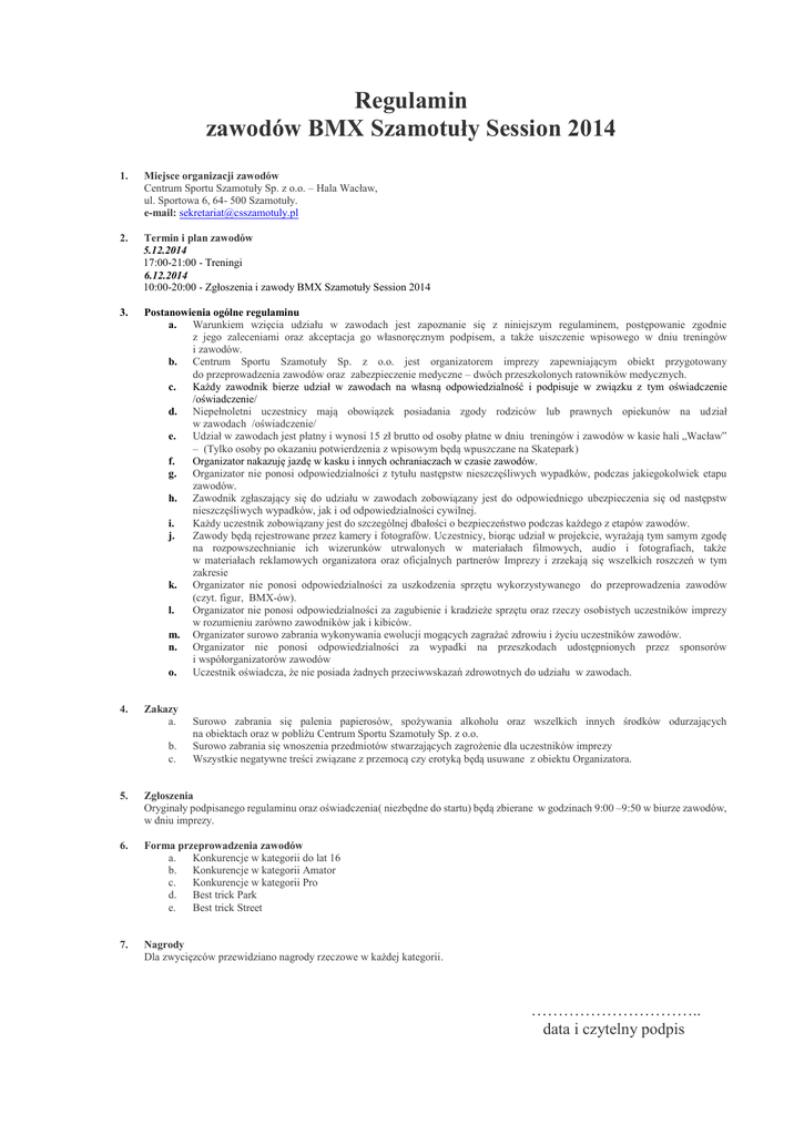 Regulamin zawodów BMX Szamotuły Session 2014 1. Miejsce organizacji zawodów Centrum Sportu Szamotuły Sp. z o.o. – Hala Wacław, ul. Sportowa 6, 64- 500 Szamotuły. e-mail: [email protected] 2. Termin i plan zawodów 5.12.2014 17:00-21:00 - Treningi 6.12.2014 10:00-20:00 - Zgłoszenia i zawody BMX Szamotuły Session 2014 3. Postanowienia ogólne regulaminu a. Warunkiem wzięcia udziału w zawodach jest zapoznanie się z niniejszym regulaminem, postępowanie zgodnie z jego zaleceniami oraz akceptacja go własnoręcznym podpisem, a także uiszczenie wpisowego w dniu treningów i zawodów. b. Centrum Sportu Szamotuły Sp. z o.o. jest organizatorem imprezy zapewniającym obiekt przygotowany do przeprowadzenia zawodów oraz zabezpieczenie medyczne – dwóch przeszkolonych ratowników medycznych. c. Każdy zawodnik bierze udział w zawodach na własną odpowiedzialność i podpisuje w związku z tym oświadczenie /oświadczenie/ d. Niepełnoletni uczestnicy mają obowiązek posiadania zgody rodziców lub prawnych opiekunów na udział w zawodach /oświadczenie/ e. Udział w zawodach jest płatny i wynosi 15 zł brutto od osoby płatne w dniu treningów i zawodów w kasie hali „Wacław” – (Tylko osoby po okazaniu potwierdzenia z wpisowym będą wpuszczane na Skatepark) f. Organizator nakazuję jazdę w kasku i innych ochraniaczach w czasie zawodów. g. Organizator nie ponosi odpowiedzialności z tytułu następstw nieszczęśliwych wypadków, podczas jakiegokolwiek etapu zawodów. h. Zawodnik zgłaszający się do udziału w zawodach zobowiązany jest do odpowiedniego ubezpieczenia się od następstw nieszczęśliwych wypadków, jak i od odpowiedzialności cywilnej. i. Każdy uczestnik zobowiązany jest do szczególnej dbałości o bezpieczeństwo podczas każdego z etapów zawodów. j. Zawody będą rejestrowane przez kamery i fotografów. Uczestnicy, biorąc udział w projekcie, wyrażają tym samym zgodę na rozpowszechnianie ich wizerunków utrwalonych w materiałach filmowych, audio i fotografiach, także w materiałach reklamowych organizatora oraz oficjalnych partnerów Imprezy i zrzekają się wszelkich roszczeń w tym zakresie k. Organizator nie ponosi odpowiedzialności za uszkodzenia sprzętu wykorzystywanego do przeprowadzenia zawodów (czyt. figur, BMX-ów). l. Organizator nie ponosi odpowiedzialności za zagubienie i kradzieże sprzętu oraz rzeczy osobistych uczestników imprezy w rozumieniu zarówno zawodników jak i kibiców. m. Organizator surowo zabrania wykonywania ewolucji mogących zagrażać zdrowiu i życiu uczestników zawodów. n. Organizator nie ponosi odpowiedzialności za wypadki na przeszkodach udostępnionych przez sponsorów i współorganizatorów zawodów o. Uczestnik oświadcza, że nie posiada żadnych przeciwwskazań zdrowotnych do udziału w zawodach. 4. Zakazy a. b. c. Surowo zabrania się palenia papierosów, spożywania alkoholu oraz wszelkich innych środków odurzających na obiektach oraz w pobliżu Centrum Sportu Szamotuły Sp. z o.o. Surowo zabrania się wnoszenia przedmiotów stwarzających zagrożenie dla uczestników imprezy Wszystkie negatywne treści związane z przemocą czy erotyką będą usuwane z obiektu Organizatora. 5. Zgłoszenia Oryginały podpisanego regulaminu oraz oświadczenia( niezbędne do startu) będą zbierane w godzinach 9:00 –9:50 w biurze zawodów, w dniu imprezy. 6. Forma przeprowadzenia zawodów a. Konkurencje w kategorii do lat 16 b. Konkurencje w kategorii Amator c. Konkurencje w kategorii Pro d. Best trick Park e. Best trick Street 7. Nagrody Dla zwycięzców przewidziano nagrody rzeczowe w każdej kategorii. ………………………….. data i czytelny podpis Oświadczenie Oświadczam, że zapoznałem się i akceptuję regulamin zawodów BMX Szamotuły Session 2014. Nie mam żadnych przeciwwskazań zdrowotnych do udziału w zawodach BMX w dniach 5.12.2014 i 6.12.2014 r. w Szamotułach i biorę w nich udział na własną odpowiedzialność. Ryzykiem za utratę zdrowia lub życia nie obarczam organizatorów i odstępuję od jakichkolwiek roszczeń wynikających z tego tytułu, Zostałem/am również poinformowany, że dla własnego bezpieczeństwa nakazuje mi się jeździć w kasku i innych ochraniaczach. …….................. Szamotuły dnia ............................................... czytelne nazwisko i imię ……….……………… Seria i nr dowodu ……..…....................... czytelny podpis rodzica ….…….............................. czytelny podpis zawodnika
