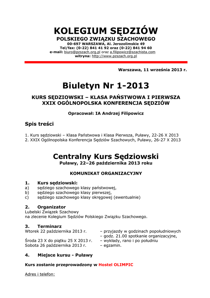 KOLEGIUM SĘDZIÓW POLSKIEGO ZWIĄZKU SZACHOWEGO 00-697 WARSZAWA, Al. Jerozolimskie 49 Tel/fax: (0-22) 841 41 92 oraz (0-22) 841 94 60 e-mail: [email protected] oraz [email protected] witryna: http://www.pzszach.org.pl Warszawa, 11 września 2013 r. Biuletyn Nr 1-2013 KURS SĘDZIOWSKI – KLASA PAŃSTWOWA I PIERWSZA XXIX OGÓLNOPOLSKA KONFERENCJA SĘDZIÓW Opracował: IA Andrzej Filipowicz Spis treści 1. Kurs sędziowski – Klasa Państwowa i Klasa Pierwsza, Puławy, 22-26 X 2013 2. XXIX Ogólnopolska Konferencja Sędziów Szachowych, Puławy, 26-27 X 2013 Centralny Kurs Sędziowski Puławy, 22–26 października 2013 roku KOMUNIKAT ORGANIZACYJNY 1. Kurs sędziowski: a) b) c) sędziego szachowego klasy państwowej, sędziego szachowego klasy pierwszej, sędziego szachowego klasy okręgowej (ewentualnie) 2. Organizator Lubelski Związek Szachowy na zlecenie Kolegium Sędziów Polskiego Związku Szachowego. 3. Terminarz Wtorek 22 października 2013 r. Środa 23 X do piątku 25 X 2013 r. Sobota 26 października 2013 r. 4. – – – – przyjazdy w godzinach popołudniowych godz. 21.00 spotkanie organizacyjne, wykłady, rano i po południu egzamin. Miejsce kursu - Puławy Kurs zostanie przeprowadzony w Hostel OLIMPIC Adres i telefon: ul. Hauke-Bosaka 1, 24-100 Puławy tel. +48 81 880 46 30 Strona internetowa: http://www.olimpic.pulawy.pl/ Spotkanie organizacyjne w dniu 22 października 2013 r. o godz. 21.00 Koszt zakwaterowania i wyżywienia (osobodzień): Hostel OLIMPIC (22-26.10.2013 – 4 doby): Pobyt w pokoju 2-osobowym (doba dla 1 osoby) wraz z obiadem w Internacie przy I LO im. A.J. Czartoryskiego w Puławach (400 m od Hostel OLIMPIC): 75 zł Pobyt w pokoju 3-osobowym (doba dla 1 osoby) wraz z obiadem w Internacie przy I LO im. A.J. Czartoryskiego w Puławach (400 m od Hostel OLIMPIC): 62 zł W Hostel OLIMPIC znajdują się bardzo dobrze wyposażone aneksy kuchenne umożliwiające przygotowanie śniadania i kolacji we własnym zakresie. Dla uczestników kursu planujących swój udział w Konferencji Sędziowskiej istnieje możliwość przedłużenia pobytu w Hostel OLIMPIC do niedzieli 27 października (konieczna rezerwacja u Organizatora i wpłata do dnia 5 października). Zgłoszenia i rezerwacje przyjmuje Prezes Lubelskiego Związku Szachowego Krzysztof Góra Adres e-mail: [email protected] Tel: 792 023 396 lub 533 986 657. Wpłat za zakwaterowanie i wyżywienie należy dokonywać do dnia 5.10.2013 na konto: PKO BP II/O Lublin Nr. 74 1020 3150 0000 3802 0027 0835 Rejestracja we wtorek 22 października 2013 r. od godziny 1700 w Hostelu OLIMPIC. 5. Warunki uczestnictwa 5.1 W kursie mogą wziąć udział sędziowie klasy drugiej oraz klasy pierwszej spełniający następujące wymagania: a) kandydat na sędziego klasy pierwszej musi wykazać się sędziowaniem minimum czterech turniejów, w tym przynajmniej dwóch turniejów rozgrywanych tempem umożliwiającym wypełnienie norm na kategorie szachowe. Jeden z turniejów z normami musi prowadzić, jako sędzia główny; b) kandydat na sędziego klasy państwowej musi wykazać się sędziowaniem minimum sześciu turniejów, w tym przynajmniej trzech turniejów rozgrywanych tempem umożliwiającym wypełnienie norm na centralne kategorie szachowe. Trzy z wymienionych turniejów musi prowadzić jako sędzia główny, przy czym przynajmniej w jednym z nich musi być możliwość wypełnienia norm na centralne kategorie szachowe. 5.2 Dokonanie opłaty za kurs na konto PZSzach (vide Kom. Org.-Fin.): - 200,00 zł dla kandydatów na klasę państwową, - 150,00 zł dla kandydatów na klasę pierwszą, - 100,00 zł dla kandydatów na klasę drugą i trzecią. Bank BPH S.A. Numer konta: 34 1060 0076 0000 3200 0071 8184 Tytuł wpłaty: Kurs sędziowski Puławy + nazwisko i imię 5.3. Zgłoszenie udziału do 5 października 2013 5.4. Przesłanie do dnia 10 października 2013 r. karty zgłoszenia –załącznik nr 1 wraz z wymaganymi dokumentami: a) kopia opłaty za kurs, b) kopia licencji sędziowskiej, c) potwierdzenie posiadania II kategorii szachowej (zaświadczenie z Wojewódzkiej Komisji Klasyfikacji i Rankingu lub kopia odpowiedniego wpisu do legitymacji szachowej), d) wykaz sędziowanych turniejów – zgodnie z załącznikiem nr 2, Uwaga: Karta zgłoszenia na kurs i ankieta sędziego w załączeniu 5.5. Dokumenty wymagane przy zgłoszeniu należy przesłać pocztą elektroniczną na adres e-mail: [email protected] oraz mieć ze sobą oryginały na spotkaniu organizacyjnym w dniu 22 października 2013. Kontakt telefoniczny: Krzysztof Góra tel. komórkowy: 792 023 396 oraz 533 986 657 5.6. Na kurs zostaną przyjęci tylko kandydaci posiadający status sędziego w Centralnym Rejestrze Polskiego Związku Szachowego http://www.cr.to.pl/ew/news.php 5.7. Nie przesłanie w terminie wymaganych dokumentów może spowodować odmowę przyjęcia na kurs. 5.8. Potwierdzenie przyjęcia na Kurs, miejsce spotkania organizacyjnego zainteresowani otrzymają pocztą elektroniczną do dnia 12 października 2013 r. 5.9. Na spotkaniu organizacyjnym we wtorek 22 października 2013 r. o godz. 21.00 każdy przyjęty na kurs kandydat zobowiązany jest do przekazania organizatorowi wersji ,,papierowej’’ wyżej wymaganych dokumentów oraz dodatkowo: a) Legitymację Szachową z aktualną klasą sędziowską i min II kat. szachową b) Licencje Sędziowską, c) Kopie Sprawozdań Sędziowskich – dotyczy kandydatów na klasę państwową, d) zaświadczenie z Wojewódzkiego Kolegium Sędziów zawierające zestawienie sędziowanych imprez – dotyczy kandydatów na klasę pierwszą. 6. Tematyka zajęć Lp. Temat Liczba godzin 1. 2. 3. 4. 5. 6. 7. 8. 9. 10. 11. 12. 13. Przepisy gry FIDE szachy klasyczne Przepisy gry FIDE szachy szybkie i błyskawiczne Ocena pozycji w końcowej fazie gry Regulaminy i systemy rozgrywek Ranking i klasyfikacja FIDE i PZSzach Kojarzenie systemem szwajcarskim, Programy komputerowe. Centralny Rejestr Sprawozdania z zawodów Komputer w słu