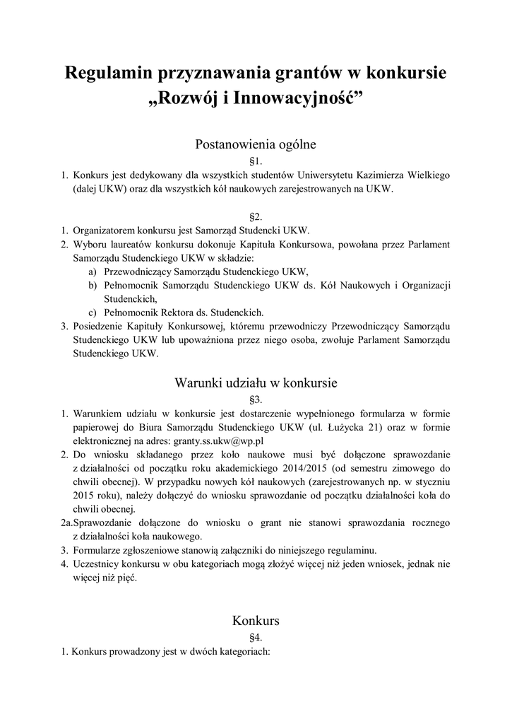 Regulamin przyznawania grantów w konkursie „Rozwój i Innowacyjność” Postanowienia ogólne §1. 1. Konkurs jest dedykowany dla wszystkich studentów Uniwersytetu Kazimierza Wielkiego (dalej UKW) oraz dla wszystkich kół naukowych zarejestrowanych na UKW. §2. 1. Organizatorem konkursu jest Samorząd Studencki UKW. 2. Wyboru laureatów konkursu dokonuje Kapituła Konkursowa, powołana przez Parlament Samorządu Studenckiego UKW w składzie: a) Przewodniczący Samorządu Studenckiego UKW, b) Pełnomocnik Samorządu Studenckiego UKW ds. Kół Naukowych i Organizacji Studenckich, c) Pełnomocnik Rektora ds. Studenckich. 3. Posiedzenie Kapituły Konkursowej, któremu przewodniczy Przewodniczący Samorządu Studenckiego UKW lub upoważniona przez niego osoba, zwołuje Parlament Samorządu Studenckiego UKW. Warunki udziału w konkursie §3. 1. Warunkiem udziału w konkursie jest dostarczenie wypełnionego formularza w formie papierowej do Biura Samorządu Studenckiego UKW (ul. Łużycka 21) oraz w formie elektronicznej na adres: [email protected] 2. Do wniosku składanego przez koło naukowe musi być dołączone sprawozdanie z działalności od początku roku akademickiego 2014/2015 (od semestru zimowego do chwili obecnej). W przypadku nowych kół naukowych (zarejestrowanych np. w styczniu 2015 roku), należy dołączyć do wniosku sprawozdanie od początku działalności koła do chwili obecnej. 2a.Sprawozdanie dołączone do wniosku o grant nie stanowi sprawozdania rocznego z działalności koła naukowego. 3. Formularze zgłoszeniowe stanowią załączniki do niniejszego regulaminu. 4. Uczestnicy konkursu w obu kategoriach mogą złożyć więcej niż jeden wniosek, jednak nie więcej niż pięć. Konkurs §4. 1. Konkurs prowadzony jest w dwóch kategoriach: a) najlepsza inicjatywa podjęta przez koło naukowe (kategoria I), b) najlepsza inicjatywa podjęta przez studenta (kategoria II). 2. Ocenie podlegać będzie innowacyjność, zasięg, cel inicjatywy, poziom aktywizacji społeczności akademickiej. 3. Nagrodami w konkursie są: a) w kategorii I – wsparcie finansowe dla realizacji projektu w wysokości 2 tyś. złotych, b) w kategorii II – wsparcie finansowe dla realizacji projektu w wysokości do 2 tyś. złotych. 4. Środki finansowe z nagród pozostają w dyspozycji Samorządu Studenckiego UKW i są formą zwrotu kosztów poniesionych przy realizacji projektu. Realizacja nagrody §5. 1. Zwrot kosztów następuje poprzez przedstawienie faktury, która określa szczegóły poniesionych kosztów. 2. Faktura powinna być wystawiona na dane: Uniwersytet Kazimierza Wielkiego w Bydgoszczy ul. Chodkiewicza 30 85 – 064 Bydgoszcz NIP: 5542647568 3. Fakturę należy jak najszybciej dostarczyć do Biura Samorządu Studenckiego UKW (ul. Łużycka 21) wraz z numerem konta, na które mają zostać zwrócone koszty przedstawione na fakturze. Terminy §6. 1. Wnioski należy złożyć w terminie od 16 kwietnia 2015 roku do 26 kwietnia 2015 roku włącznie. 2. Ogłoszenie wyników nastąpi nie później niż do 10 maja 2015 roku. 3. Wyniki konkursu zostaną przedstawione na stronie internetowej Samorządu Studenckiego UKW (www.samorzad.bydgoszcz.pl) Postanowienia końcowe §7. 1. W przypadku naruszenia zasad regulaminu Kapituła Konkursowa ma prawo odrzucenia wniosku. 2. W sprawach dotyczących konkursu, nieuregulowanymi niniejszym regulaminem, decyzję podejmuje Organizator.