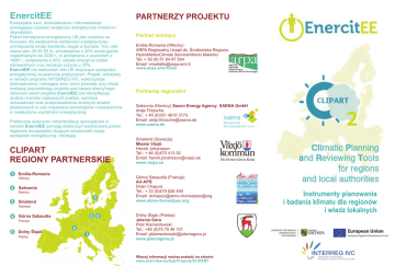 EnercitEE Europejskie sieci, doœwiadczenia i rekomendacje pomagaj¹ce uzyskaæ wydajnoœæ energetyczna miastom i obywatelom Pakiet klimatyczno-energetyczny UE jest uwa¿any za kluczowy dla zwiêkszenia wydajnoœci energetycznej i zmniejszenia emisji dwutlenku wêgla w Europie. Trzy cele znane jako 20-20-20 to: zmniejszenie o 20% emisji gazów cieplarnianych do 2020 r., w porównaniu z poziomem z 1990 r., zwiêkszenie o 20% udzia³u energii ze Ÿróde³ odnawialnych oraz redukcja zu¿ycia o 20%. EnercitEE ma realizowaæ cele UE dotycz¹ce wydajnoœci energetycznej na poziomie praktycznym. Projekt, wdra¿any w ramach programu INTERREG IVC, wykorzystuje doœwiadczenia i istniej¹ce sieci, które powsta³y przy okazji realizacji poprzedniego projektu pod nazwa enercy'regio. G³ównym celem projektu EnercitEE jest identyfikacja, analiza i transfer najlepszych praktyk, wymiana doœwiadczeñ oraz przeprowadzenie drobnych dzia³añ pilota¿owych w celu wspierania samorz¹dów i mieszkañców w zwiêkszaniu wydajnoœci energetycznej. Praktyczne wytyczne i rekomendacje sporz¹dzone w ramach EnercitEE pomog¹ dostarczyæ wartoœciow¹ pomoc regionom europejskim chc¹cym udoskonaliæ swoja wydajnoœæ energetyczn¹ i strategiê. CLIPART REGIONY PARTNERSKIE 1 Emilia-Romania W³ochy 2 Saksonia Niemcy 3 3 Smaland PARTNERZY PROJEKTU Partner wiod¹cy Emilia-Romania (W³ochy) ARPA Regionalny Urz¹d ds. Œrodowiska Regionu HydroMeteoClimate ServiceVittorio Marletto Tel: + 39 (0) 51 64 97 564 Email: [email protected] www.arpa.emr.it/sim Partnerzy regionalni Saksonia (Niemcy) Saxon Energy Agency SAENA GmbH Antje Fritzsche Tel.: + 49 (0)351 4910 3173 Email: [email protected] www.saena.de Smaland (Szwecja) Miasto Växjö Henrik Johansson Tel.: + 46 (0)470 413 30 Email: [email protected] www.vaxjo.se Górna Sabaudia (Francja) Air-APS Dider Chapuis Tel.: + 33 (0)479 626 459 Email: dchapuis@atmo-rhonealpes@org www.atmo-rhonealpes.org Szwecja 4 2 5 Górna Sabaudia Francja 5 Dolny Œl¹sk Polska 4 1 Dolny Œl¹sk (Polska) Jelenia Góra Piotr Klementowski Tel.: +48 (0)75 75 46 101 Email: [email protected] www.jeleniagora.pl Wiêcej informacji mo¿na znaleŸæ na stronie: www.enercitee.eu/Sub-Projects/CLIPART Zakres Clipart dostarcza procedury i narzêdzia pomocne w³adzom lokalnym i regionalnym w planowaniu i ocenie aktywnoœci we wszystkich sektorach, których istot¹ s¹ sta³e i konsekwentne dzia³ania, ukierunkowane na spe³nienie norm redukcji emisji gazów cieplarnianych okreœlonych przez Parlament Europejski oraz przez miêdzynarodowe konwencje dotycz¹ce zmian klimatycznych. Cele projektu Maj¹c na uwadze znaczenie oraz pilny charakter kwestii zmian klimatu, corocznie powinien byæ wypracowany bud¿et z podzia³em na sektory, którego przeznaczeniem bêdzie regionalna i lokalna strategia emisjami gazów cieplarnianych. Pod-Projekt Clipart dostarcza w³adzom lokalnym oraz regionalnym narzêdzi pomocnych w procesie szacowania zu¿ycia energii, kalkulacji powi¹zanej z nim emisji gazów cieplarnianych, oraz w procesie rocznego i okresowego bud¿etowania funduszy i weryfikacji skutecznoœci podejmowanych kroków. Wymiana doœwiadczeñ stanowi kluczow¹ czêœæ projektu. Rezultaty pomog¹ europejskim regionom i gminom w procesie adaptacji do zmian klimatycznych i ³agodzenia ich skutków. Priorytety tematyczne dla podprojektów Regionalna Agencja ds. Œrodowiska w Emilia-Romania Transfer i ujednolicenie wiedzy na poziomie lokalnym i ! regionalnym w na temat strategii dzia³añ zwi¹zanych ze zmianami klimatu w Europie Saxon Energy Agency SAENA GmbH Testy optymalizacji bilansu CO2 oparte na ! regionalnych uwarunkowaniach oraz wprowadzenie sta³ego monitoringu poziomu Co2 Krótki opis Krok 1: Clipart to po³¹czenie dwóch idei: energii i emisji. Dane statystyczne lokalnych emisji odgrywaj¹ kluczow¹ rolê. Harmonogram Clipart zak³ada rozpoczêcie prac od zebrania danych statystycznych w celu okreœlenia bud¿etu z przeznaczeniem na ³agodzenie skutków emisji gazów cieplarnianych. Krok 2: Clipart dostarcza wytycznych w procesie okreœlania bud¿etu dla emisji gazów cieplarnianych. Opisuje procedury dotycz¹ce bud¿etowania i planowania redukcji gazów cieplarnianych celem ustalenia wspólnego kierunku zarz¹dzania emisjami dla regionu i lokalnych spo³ecznoœci i d¹¿enia do osi¹gniêcia uprzednio ustalonych celów emisyjnych. Krok 3: Clipart wspiera skutecznoœæ lokalnych dzia³añ maj¹cych na celu ³agodzenie skutków emisji gazów cieplarnianych. Dostarcza procedur pomocnych w analizie zbie¿noœci podjêtych dzia³ania z okreœlonym bud¿etem. Przynajmniej jeden regionalny lub lokalny proces implementacji zostanie poddany symulacji. Krok 4: Clipart publikuje rezultaty swoich prac w regionie. Na etapie trzech pierwszych kroków w³adze lokalne s¹ w³¹czone w prace w ramach projektu przez partnerów projektów. Aktualne informacje i wyniki s¹ publikowane w formie elektronicznej na stronie www.enercitee.eu/SubProjects/CLIPART. W ramach spotkañ na szczeblu lokalnym projekt bêdzie dyskutowany z udzia³owcami. W Finalnym Raporcie o Klimacie zostan¹ udostêpnione wyniki projektu w 6 jêzykach (ang., w³., niem., fr., pl, szwec.) Miasto Växjö Opracowanie planu adaptacji do zmian ! klimatycznych, który bêdzie szeroko wykorzystywany przez organizacje gminne w procesie planowania. Air-APS Opracowanie danych statystycznych dot. emisji na poziomie gminy, które bêd¹ dostêpne dla w³adz lokalnych departamentu “Górna Sabaudia” w celu zgrania prac lokalnych w³adz oraz jako bodziec do tworzenia planu redukcji emisji gazów cieplarnianych. ! Jelenia Góra Projekt redukcji emisji gazów cieplarnianych oraz ! py³ów, jak równie¿ wymiana doœwiadczeñ zwi¹zanych z “najlepszymi praktykami”. Wynik koñcowy Celem Clipart jest adaptacja regionów i lokalnych spo³ecznoœci do zmian klimatycznych oraz ³agodzenie ich wp³ywu, za pomoc¹ œrodków, które mo¿na zastosowaæ w ka¿dym z partnerskich